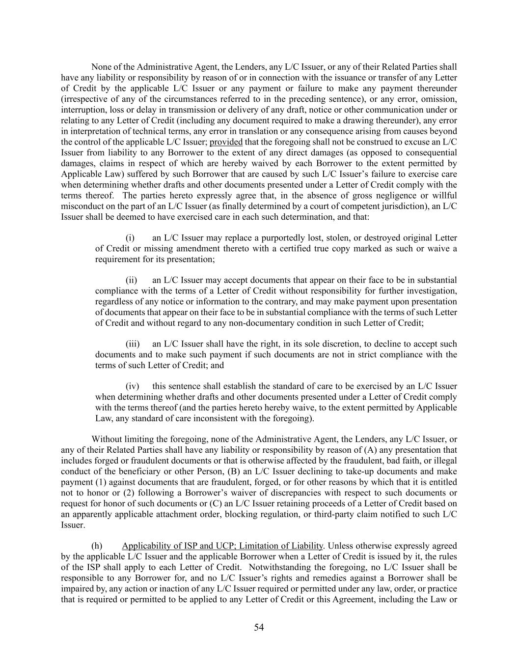 54 None of the Administrative Agent, the Lenders, any L/C Issuer, or any of their Related Parties shall have any liability or responsibility by reason of or in connection with the issuance or transfer of any Letter of Credit by the applicable L/C Issuer or any payment or failure to make any payment thereunder (irrespective of any of the circumstances referred to in the preceding sentence), or any error, omission, interruption, loss or delay in transmission or delivery of any draft, notice or other communication under or relating to any Letter of Credit (including any document required to make a drawing thereunder), any error in interpretation of technical terms, any error in translation or any consequence arising from causes beyond the control of the applicable L/C Issuer; provided that the foregoing shall not be construed to excuse an L/C Issuer from liability to any Borrower to the extent of any direct damages (as opposed to consequential damages, claims in respect of which are hereby waived by each Borrower to the extent permitted by Applicable Law) suffered by such Borrower that are caused by such L/C Issuer’s failure to exercise care when determining whether drafts and other documents presented under a Letter of Credit comply with the terms thereof. The parties hereto expressly agree that, in the absence of gross negligence or willful misconduct on the part of an L/C Issuer (as finally determined by a court of competent jurisdiction), an L/C Issuer shall be deemed to have exercised care in each such determination, and that: (i) an L/C Issuer may replace a purportedly lost, stolen, or destroyed original Letter of Credit or missing amendment thereto with a certified true copy marked as such or waive a requirement for its presentation; (ii) an L/C Issuer may accept documents that appear on their face to be in substantial compliance with the terms of a Letter of Credit without responsibility for further investigation, regardless of any notice or information to the contrary, and may make payment upon presentation of documents that appear on their face to be in substantial compliance with the terms of such Letter of Credit and without regard to any non-documentary condition in such Letter of Credit; (iii) an L/C Issuer shall have the right, in its sole discretion, to decline to accept such documents and to make such payment if such documents are not in strict compliance with the terms of such Letter of Credit; and (iv) this sentence shall establish the standard of care to be exercised by an L/C Issuer when determining whether drafts and other documents presented under a Letter of Credit comply with the terms thereof (and the parties hereto hereby waive, to the extent permitted by Applicable Law, any standard of care inconsistent with the foregoing). Without limiting the foregoing, none of the Administrative Agent, the Lenders, any L/C Issuer, or any of their Related Parties shall have any liability or responsibility by reason of (A) any presentation that includes forged or fraudulent documents or that is otherwise affected by the fraudulent, bad faith, or illegal conduct of the beneficiary or other Person, (B) an L/C Issuer declining to take-up documents and make payment (1) against documents that are fraudulent, forged, or for other reasons by which that it is entitled not to honor or (2) following a Borrower’s waiver of discrepancies with respect to such documents or request for honor of such documents or (C) an L/C Issuer retaining proceeds of a Letter of Credit based on an apparently applicable attachment order, blocking regulation, or third-party claim notified to such L/C Issuer. (h) Applicability of ISP and UCP; Limitation of Liability. Unless otherwise expressly agreed by the applicable L/C Issuer and the applicable Borrower when a Letter of Credit is issued by it, the rules of the ISP shall apply to each Letter of Credit. Notwithstanding the foregoing, no L/C Issuer shall be responsible to any Borrower for, and no L/C Issuer’s rights and remedies against a Borrower shall be impaired by, any action or inaction of any L/C Issuer required or permitted under any law, order, or practice that is required or permitted to be applied to any Letter of Credit or this Agreement, including the Law or