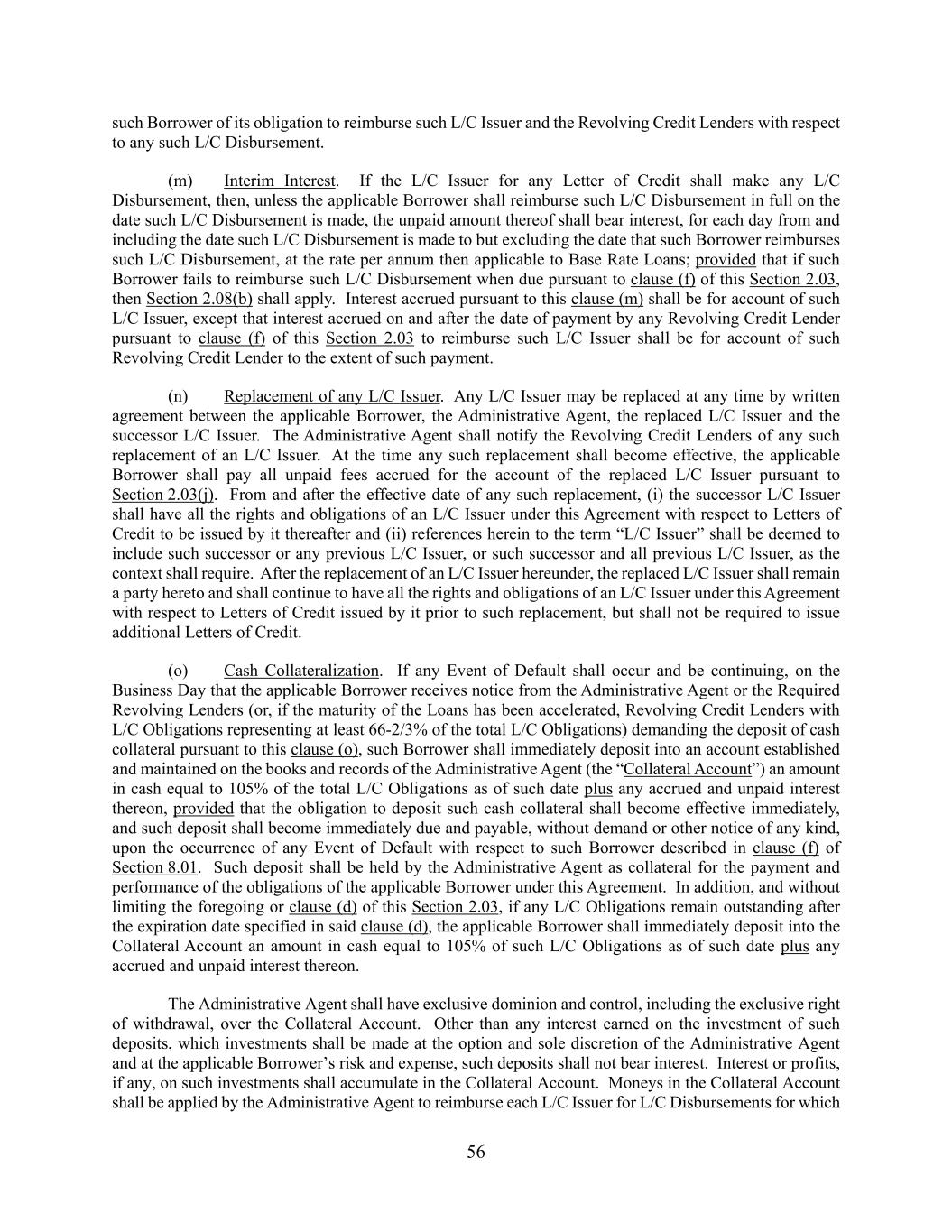 56 such Borrower of its obligation to reimburse such L/C Issuer and the Revolving Credit Lenders with respect to any such L/C Disbursement. (m) Interim Interest. If the L/C Issuer for any Letter of Credit shall make any L/C Disbursement, then, unless the applicable Borrower shall reimburse such L/C Disbursement in full on the date such L/C Disbursement is made, the unpaid amount thereof shall bear interest, for each day from and including the date such L/C Disbursement is made to but excluding the date that such Borrower reimburses such L/C Disbursement, at the rate per annum then applicable to Base Rate Loans; provided that if such Borrower fails to reimburse such L/C Disbursement when due pursuant to clause (f) of this Section 2.03, then Section 2.08(b) shall apply. Interest accrued pursuant to this clause (m) shall be for account of such L/C Issuer, except that interest accrued on and after the date of payment by any Revolving Credit Lender pursuant to clause (f) of this Section 2.03 to reimburse such L/C Issuer shall be for account of such Revolving Credit Lender to the extent of such payment. (n) Replacement of any L/C Issuer. Any L/C Issuer may be replaced at any time by written agreement between the applicable Borrower, the Administrative Agent, the replaced L/C Issuer and the successor L/C Issuer. The Administrative Agent shall notify the Revolving Credit Lenders of any such replacement of an L/C Issuer. At the time any such replacement shall become effective, the applicable Borrower shall pay all unpaid fees accrued for the account of the replaced L/C Issuer pursuant to Section 2.03(j). From and after the effective date of any such replacement, (i) the successor L/C Issuer shall have all the rights and obligations of an L/C Issuer under this Agreement with respect to Letters of Credit to be issued by it thereafter and (ii) references herein to the term “L/C Issuer” shall be deemed to include such successor or any previous L/C Issuer, or such successor and all previous L/C Issuer, as the context shall require. After the replacement of an L/C Issuer hereunder, the replaced L/C Issuer shall remain a party hereto and shall continue to have all the rights and obligations of an L/C Issuer under this Agreement with respect to Letters of Credit issued by it prior to such replacement, but shall not be required to issue additional Letters of Credit. (o) Cash Collateralization. If any Event of Default shall occur and be continuing, on the Business Day that the applicable Borrower receives notice from the Administrative Agent or the Required Revolving Lenders (or, if the maturity of the Loans has been accelerated, Revolving Credit Lenders with L/C Obligations representing at least 66-2/3% of the total L/C Obligations) demanding the deposit of cash collateral pursuant to this clause (o), such Borrower shall immediately deposit into an account established and maintained on the books and records of the Administrative Agent (the “Collateral Account”) an amount in cash equal to 105% of the total L/C Obligations as of such date plus any accrued and unpaid interest thereon, provided that the obligation to deposit such cash collateral shall become effective immediately, and such deposit shall become immediately due and payable, without demand or other notice of any kind, upon the occurrence of any Event of Default with respect to such Borrower described in clause (f) of Section 8.01. Such deposit shall be held by the Administrative Agent as collateral for the payment and performance of the obligations of the applicable Borrower under this Agreement. In addition, and without limiting the foregoing or clause (d) of this Section 2.03, if any L/C Obligations remain outstanding after the expiration date specified in said clause (d), the applicable Borrower shall immediately deposit into the Collateral Account an amount in cash equal to 105% of such L/C Obligations as of such date plus any accrued and unpaid interest thereon. The Administrative Agent shall have exclusive dominion and control, including the exclusive right of withdrawal, over the Collateral Account. Other than any interest earned on the investment of such deposits, which investments shall be made at the option and sole discretion of the Administrative Agent and at the applicable Borrower’s risk and expense, such deposits shall not bear interest. Interest or profits, if any, on such investments shall accumulate in the Collateral Account. Moneys in the Collateral Account shall be applied by the Administrative Agent to reimburse each L/C Issuer for L/C Disbursements for which