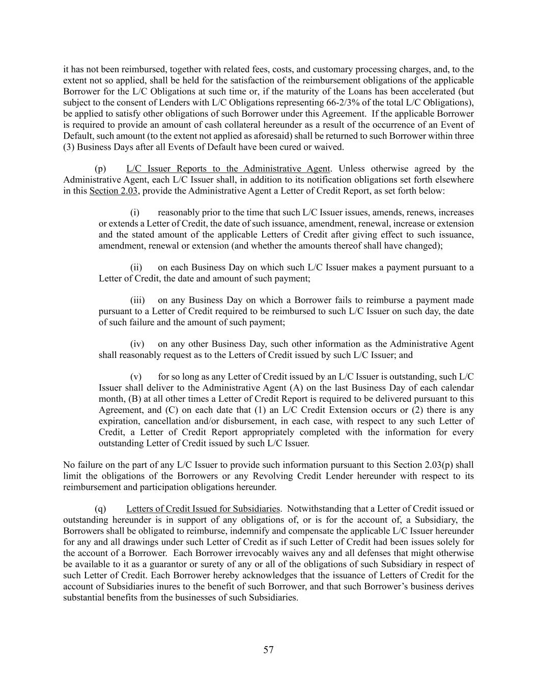 57 it has not been reimbursed, together with related fees, costs, and customary processing charges, and, to the extent not so applied, shall be held for the satisfaction of the reimbursement obligations of the applicable Borrower for the L/C Obligations at such time or, if the maturity of the Loans has been accelerated (but subject to the consent of Lenders with L/C Obligations representing 66-2/3% of the total L/C Obligations), be applied to satisfy other obligations of such Borrower under this Agreement. If the applicable Borrower is required to provide an amount of cash collateral hereunder as a result of the occurrence of an Event of Default, such amount (to the extent not applied as aforesaid) shall be returned to such Borrower within three (3) Business Days after all Events of Default have been cured or waived. (p) L/C Issuer Reports to the Administrative Agent. Unless otherwise agreed by the Administrative Agent, each L/C Issuer shall, in addition to its notification obligations set forth elsewhere in this Section 2.03, provide the Administrative Agent a Letter of Credit Report, as set forth below: (i) reasonably prior to the time that such L/C Issuer issues, amends, renews, increases or extends a Letter of Credit, the date of such issuance, amendment, renewal, increase or extension and the stated amount of the applicable Letters of Credit after giving effect to such issuance, amendment, renewal or extension (and whether the amounts thereof shall have changed); (ii) on each Business Day on which such L/C Issuer makes a payment pursuant to a Letter of Credit, the date and amount of such payment; (iii) on any Business Day on which a Borrower fails to reimburse a payment made pursuant to a Letter of Credit required to be reimbursed to such L/C Issuer on such day, the date of such failure and the amount of such payment; (iv) on any other Business Day, such other information as the Administrative Agent shall reasonably request as to the Letters of Credit issued by such L/C Issuer; and (v) for so long as any Letter of Credit issued by an L/C Issuer is outstanding, such L/C Issuer shall deliver to the Administrative Agent (A) on the last Business Day of each calendar month, (B) at all other times a Letter of Credit Report is required to be delivered pursuant to this Agreement, and (C) on each date that (1) an L/C Credit Extension occurs or (2) there is any expiration, cancellation and/or disbursement, in each case, with respect to any such Letter of Credit, a Letter of Credit Report appropriately completed with the information for every outstanding Letter of Credit issued by such L/C Issuer. No failure on the part of any L/C Issuer to provide such information pursuant to this Section 2.03(p) shall limit the obligations of the Borrowers or any Revolving Credit Lender hereunder with respect to its reimbursement and participation obligations hereunder. (q) Letters of Credit Issued for Subsidiaries. Notwithstanding that a Letter of Credit issued or outstanding hereunder is in support of any obligations of, or is for the account of, a Subsidiary, the Borrowers shall be obligated to reimburse, indemnify and compensate the applicable L/C Issuer hereunder for any and all drawings under such Letter of Credit as if such Letter of Credit had been issues solely for the account of a Borrower. Each Borrower irrevocably waives any and all defenses that might otherwise be available to it as a guarantor or surety of any or all of the obligations of such Subsidiary in respect of such Letter of Credit. Each Borrower hereby acknowledges that the issuance of Letters of Credit for the account of Subsidiaries inures to the benefit of such Borrower, and that such Borrower’s business derives substantial benefits from the businesses of such Subsidiaries.