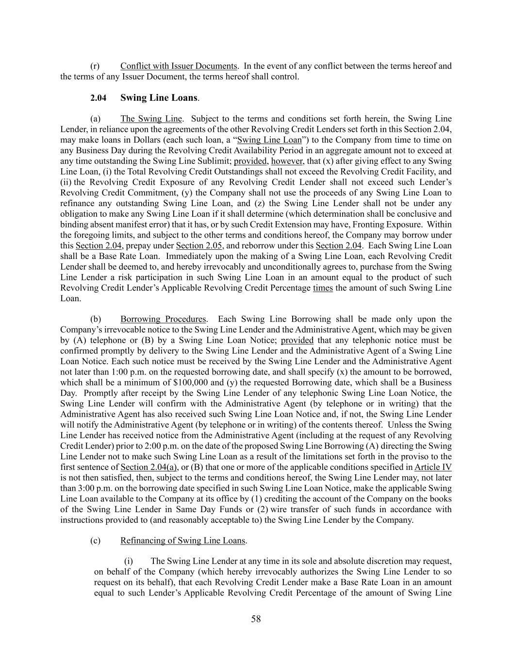 58 (r) Conflict with Issuer Documents. In the event of any conflict between the terms hereof and the terms of any Issuer Document, the terms hereof shall control. 2.04 Swing Line Loans. (a) The Swing Line. Subject to the terms and conditions set forth herein, the Swing Line Lender, in reliance upon the agreements of the other Revolving Credit Lenders set forth in this Section 2.04, may make loans in Dollars (each such loan, a “Swing Line Loan”) to the Company from time to time on any Business Day during the Revolving Credit Availability Period in an aggregate amount not to exceed at any time outstanding the Swing Line Sublimit; provided, however, that (x) after giving effect to any Swing Line Loan, (i) the Total Revolving Credit Outstandings shall not exceed the Revolving Credit Facility, and (ii) the Revolving Credit Exposure of any Revolving Credit Lender shall not exceed such Lender’s Revolving Credit Commitment, (y) the Company shall not use the proceeds of any Swing Line Loan to refinance any outstanding Swing Line Loan, and (z) the Swing Line Lender shall not be under any obligation to make any Swing Line Loan if it shall determine (which determination shall be conclusive and binding absent manifest error) that it has, or by such Credit Extension may have, Fronting Exposure. Within the foregoing limits, and subject to the other terms and conditions hereof, the Company may borrow under this Section 2.04, prepay under Section 2.05, and reborrow under this Section 2.04. Each Swing Line Loan shall be a Base Rate Loan. Immediately upon the making of a Swing Line Loan, each Revolving Credit Lender shall be deemed to, and hereby irrevocably and unconditionally agrees to, purchase from the Swing Line Lender a risk participation in such Swing Line Loan in an amount equal to the product of such Revolving Credit Lender’s Applicable Revolving Credit Percentage times the amount of such Swing Line Loan. (b) Borrowing Procedures. Each Swing Line Borrowing shall be made only upon the Company’s irrevocable notice to the Swing Line Lender and the Administrative Agent, which may be given by (A) telephone or (B) by a Swing Line Loan Notice; provided that any telephonic notice must be confirmed promptly by delivery to the Swing Line Lender and the Administrative Agent of a Swing Line Loan Notice. Each such notice must be received by the Swing Line Lender and the Administrative Agent not later than 1:00 p.m. on the requested borrowing date, and shall specify (x) the amount to be borrowed, which shall be a minimum of $100,000 and (y) the requested Borrowing date, which shall be a Business Day. Promptly after receipt by the Swing Line Lender of any telephonic Swing Line Loan Notice, the Swing Line Lender will confirm with the Administrative Agent (by telephone or in writing) that the Administrative Agent has also received such Swing Line Loan Notice and, if not, the Swing Line Lender will notify the Administrative Agent (by telephone or in writing) of the contents thereof. Unless the Swing Line Lender has received notice from the Administrative Agent (including at the request of any Revolving Credit Lender) prior to 2:00 p.m. on the date of the proposed Swing Line Borrowing (A) directing the Swing Line Lender not to make such Swing Line Loan as a result of the limitations set forth in the proviso to the first sentence of Section 2.04(a), or (B) that one or more of the applicable conditions specified in Article IV is not then satisfied, then, subject to the terms and conditions hereof, the Swing Line Lender may, not later than 3:00 p.m. on the borrowing date specified in such Swing Line Loan Notice, make the applicable Swing Line Loan available to the Company at its office by (1) crediting the account of the Company on the books of the Swing Line Lender in Same Day Funds or (2) wire transfer of such funds in accordance with instructions provided to (and reasonably acceptable to) the Swing Line Lender by the Company. (c) Refinancing of Swing Line Loans. (i) The Swing Line Lender at any time in its sole and absolute discretion may request, on behalf of the Company (which hereby irrevocably authorizes the Swing Line Lender to so request on its behalf), that each Revolving Credit Lender make a Base Rate Loan in an amount equal to such Lender’s Applicable Revolving Credit Percentage of the amount of Swing Line