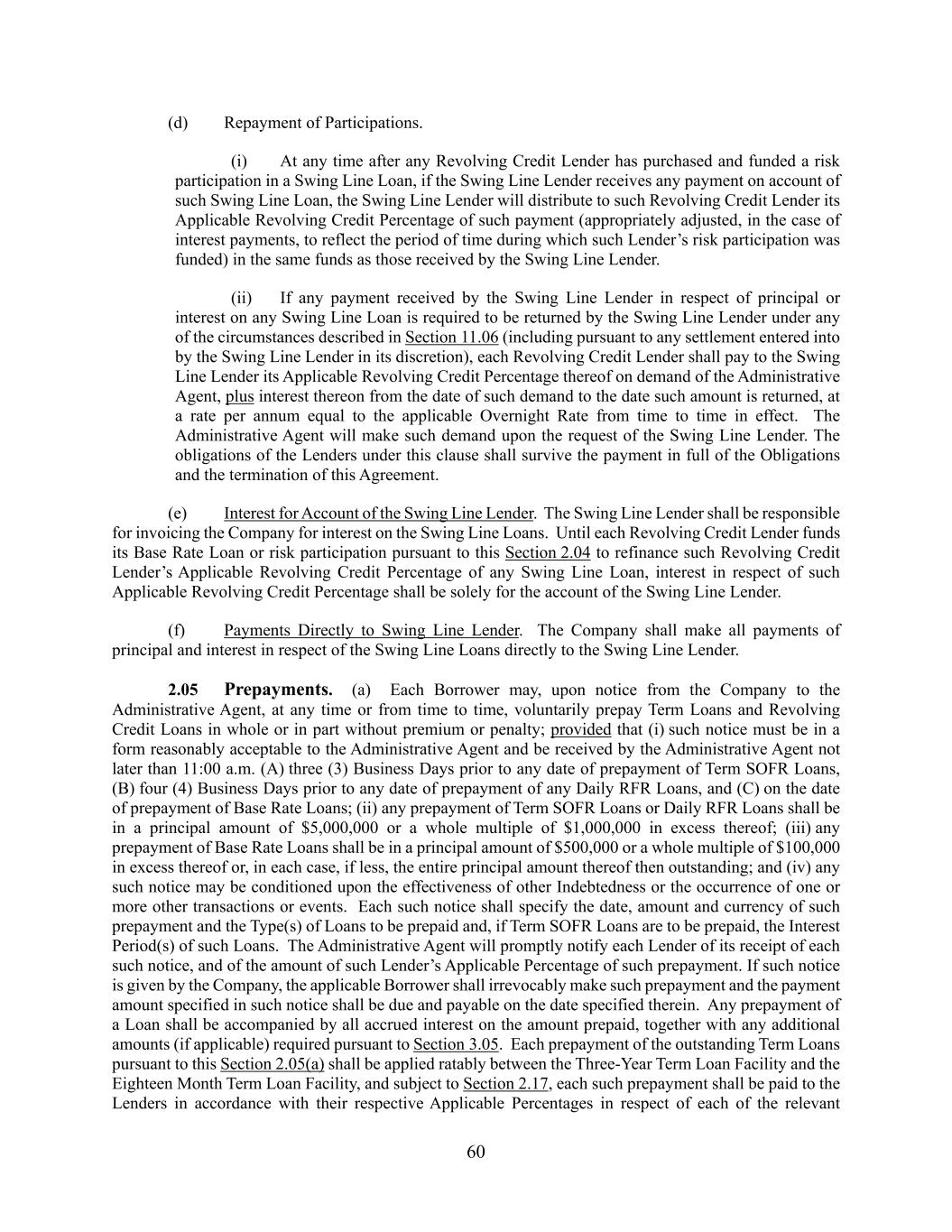 60 (d) Repayment of Participations. (i) At any time after any Revolving Credit Lender has purchased and funded a risk participation in a Swing Line Loan, if the Swing Line Lender receives any payment on account of such Swing Line Loan, the Swing Line Lender will distribute to such Revolving Credit Lender its Applicable Revolving Credit Percentage of such payment (appropriately adjusted, in the case of interest payments, to reflect the period of time during which such Lender’s risk participation was funded) in the same funds as those received by the Swing Line Lender. (ii) If any payment received by the Swing Line Lender in respect of principal or interest on any Swing Line Loan is required to be returned by the Swing Line Lender under any of the circumstances described in Section 11.06 (including pursuant to any settlement entered into by the Swing Line Lender in its discretion), each Revolving Credit Lender shall pay to the Swing Line Lender its Applicable Revolving Credit Percentage thereof on demand of the Administrative Agent, plus interest thereon from the date of such demand to the date such amount is returned, at a rate per annum equal to the applicable Overnight Rate from time to time in effect. The Administrative Agent will make such demand upon the request of the Swing Line Lender. The obligations of the Lenders under this clause shall survive the payment in full of the Obligations and the termination of this Agreement. (e) Interest for Account of the Swing Line Lender. The Swing Line Lender shall be responsible for invoicing the Company for interest on the Swing Line Loans. Until each Revolving Credit Lender funds its Base Rate Loan or risk participation pursuant to this Section 2.04 to refinance such Revolving Credit Lender’s Applicable Revolving Credit Percentage of any Swing Line Loan, interest in respect of such Applicable Revolving Credit Percentage shall be solely for the account of the Swing Line Lender. (f) Payments Directly to Swing Line Lender. The Company shall make all payments of principal and interest in respect of the Swing Line Loans directly to the Swing Line Lender. 2.05 Prepayments. (a) Each Borrower may, upon notice from the Company to the Administrative Agent, at any time or from time to time, voluntarily prepay Term Loans and Revolving Credit Loans in whole or in part without premium or penalty; provided that (i) such notice must be in a form reasonably acceptable to the Administrative Agent and be received by the Administrative Agent not later than 11:00 a.m. (A) three (3) Business Days prior to any date of prepayment of Term SOFR Loans, (B) four (4) Business Days prior to any date of prepayment of any Daily RFR Loans, and (C) on the date of prepayment of Base Rate Loans; (ii) any prepayment of Term SOFR Loans or Daily RFR Loans shall be in a principal amount of $5,000,000 or a whole multiple of $1,000,000 in excess thereof; (iii) any prepayment of Base Rate Loans shall be in a principal amount of $500,000 or a whole multiple of $100,000 in excess thereof or, in each case, if less, the entire principal amount thereof then outstanding; and (iv) any such notice may be conditioned upon the effectiveness of other Indebtedness or the occurrence of one or more other transactions or events. Each such notice shall specify the date, amount and currency of such prepayment and the Type(s) of Loans to be prepaid and, if Term SOFR Loans are to be prepaid, the Interest Period(s) of such Loans. The Administrative Agent will promptly notify each Lender of its receipt of each such notice, and of the amount of such Lender’s Applicable Percentage of such prepayment. If such notice is given by the Company, the applicable Borrower shall irrevocably make such prepayment and the payment amount specified in such notice shall be due and payable on the date specified therein. Any prepayment of a Loan shall be accompanied by all accrued interest on the amount prepaid, together with any additional amounts (if applicable) required pursuant to Section 3.05. Each prepayment of the outstanding Term Loans pursuant to this Section 2.05(a) shall be applied ratably between the Three-Year Term Loan Facility and the Eighteen Month Term Loan Facility, and subject to Section 2.17, each such prepayment shall be paid to the Lenders in accordance with their respective Applicable Percentages in respect of each of the relevant