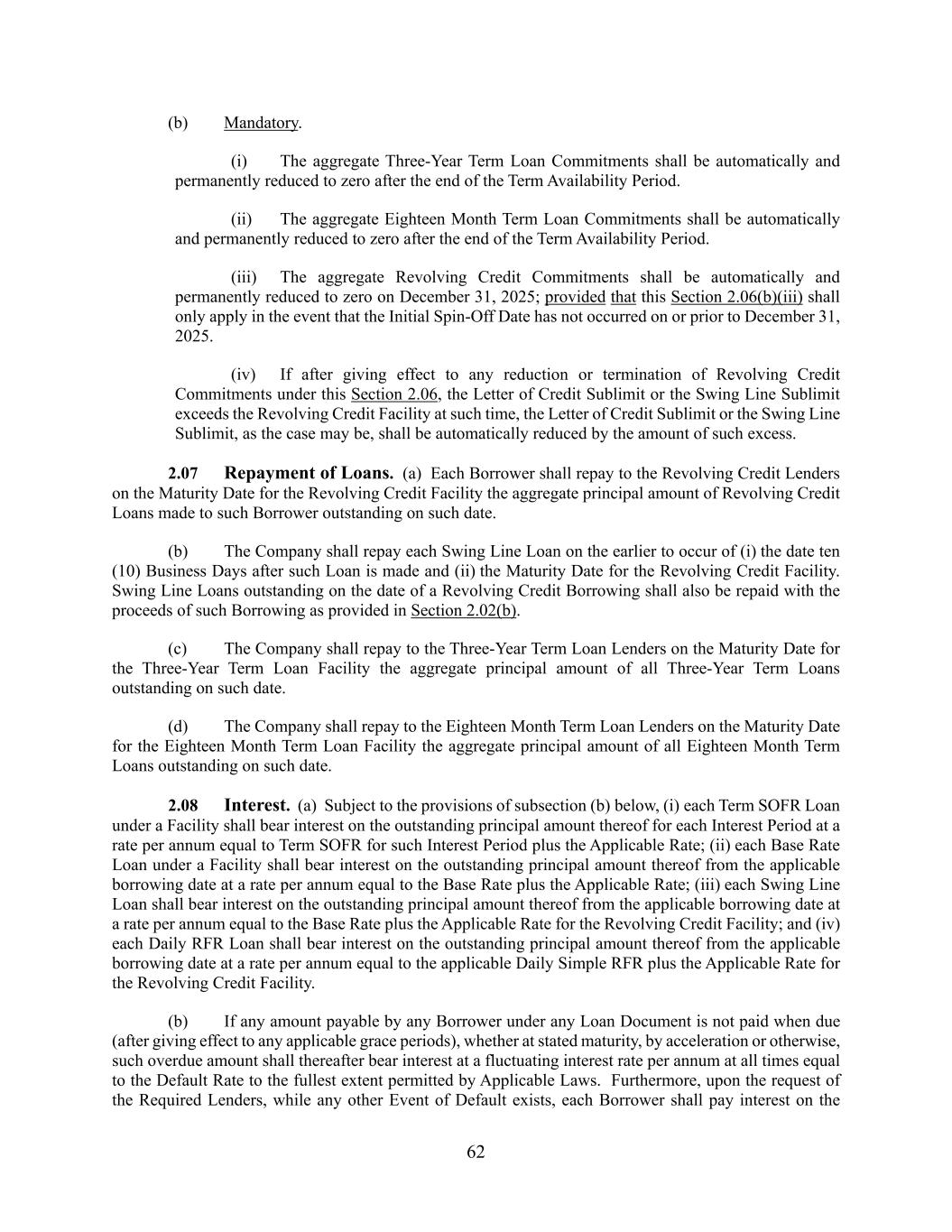 62 (b) Mandatory. (i) The aggregate Three-Year Term Loan Commitments shall be automatically and permanently reduced to zero after the end of the Term Availability Period. (ii) The aggregate Eighteen Month Term Loan Commitments shall be automatically and permanently reduced to zero after the end of the Term Availability Period. (iii) The aggregate Revolving Credit Commitments shall be automatically and permanently reduced to zero on December 31, 2025; provided that this Section 2.06(b)(iii) shall only apply in the event that the Initial Spin-Off Date has not occurred on or prior to December 31, 2025. (iv) If after giving effect to any reduction or termination of Revolving Credit Commitments under this Section 2.06, the Letter of Credit Sublimit or the Swing Line Sublimit exceeds the Revolving Credit Facility at such time, the Letter of Credit Sublimit or the Swing Line Sublimit, as the case may be, shall be automatically reduced by the amount of such excess. 2.07 Repayment of Loans. (a) Each Borrower shall repay to the Revolving Credit Lenders on the Maturity Date for the Revolving Credit Facility the aggregate principal amount of Revolving Credit Loans made to such Borrower outstanding on such date. (b) The Company shall repay each Swing Line Loan on the earlier to occur of (i) the date ten (10) Business Days after such Loan is made and (ii) the Maturity Date for the Revolving Credit Facility. Swing Line Loans outstanding on the date of a Revolving Credit Borrowing shall also be repaid with the proceeds of such Borrowing as provided in Section 2.02(b). (c) The Company shall repay to the Three-Year Term Loan Lenders on the Maturity Date for the Three-Year Term Loan Facility the aggregate principal amount of all Three-Year Term Loans outstanding on such date. (d) The Company shall repay to the Eighteen Month Term Loan Lenders on the Maturity Date for the Eighteen Month Term Loan Facility the aggregate principal amount of all Eighteen Month Term Loans outstanding on such date. 2.08 Interest. (a) Subject to the provisions of subsection (b) below, (i) each Term SOFR Loan under a Facility shall bear interest on the outstanding principal amount thereof for each Interest Period at a rate per annum equal to Term SOFR for such Interest Period plus the Applicable Rate; (ii) each Base Rate Loan under a Facility shall bear interest on the outstanding principal amount thereof from the applicable borrowing date at a rate per annum equal to the Base Rate plus the Applicable Rate; (iii) each Swing Line Loan shall bear interest on the outstanding principal amount thereof from the applicable borrowing date at a rate per annum equal to the Base Rate plus the Applicable Rate for the Revolving Credit Facility; and (iv) each Daily RFR Loan shall bear interest on the outstanding principal amount thereof from the applicable borrowing date at a rate per annum equal to the applicable Daily Simple RFR plus the Applicable Rate for the Revolving Credit Facility. (b) If any amount payable by any Borrower under any Loan Document is not paid when due (after giving effect to any applicable grace periods), whether at stated maturity, by acceleration or otherwise, such overdue amount shall thereafter bear interest at a fluctuating interest rate per annum at all times equal to the Default Rate to the fullest extent permitted by Applicable Laws. Furthermore, upon the request of the Required Lenders, while any other Event of Default exists, each Borrower shall pay interest on the