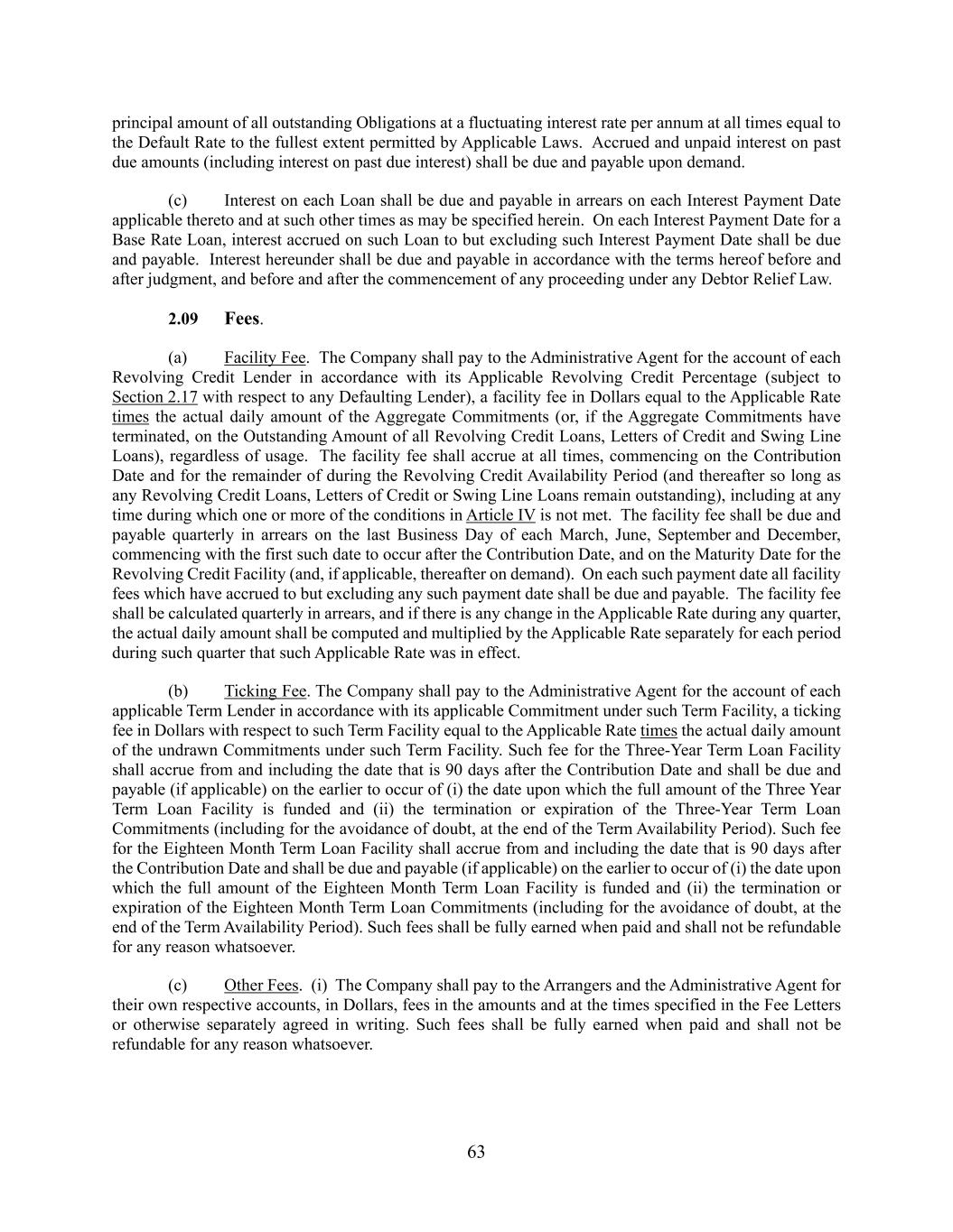 63 principal amount of all outstanding Obligations at a fluctuating interest rate per annum at all times equal to the Default Rate to the fullest extent permitted by Applicable Laws. Accrued and unpaid interest on past due amounts (including interest on past due interest) shall be due and payable upon demand. (c) Interest on each Loan shall be due and payable in arrears on each Interest Payment Date applicable thereto and at such other times as may be specified herein. On each Interest Payment Date for a Base Rate Loan, interest accrued on such Loan to but excluding such Interest Payment Date shall be due and payable. Interest hereunder shall be due and payable in accordance with the terms hereof before and after judgment, and before and after the commencement of any proceeding under any Debtor Relief Law. 2.09 Fees. (a) Facility Fee. The Company shall pay to the Administrative Agent for the account of each Revolving Credit Lender in accordance with its Applicable Revolving Credit Percentage (subject to Section 2.17 with respect to any Defaulting Lender), a facility fee in Dollars equal to the Applicable Rate times the actual daily amount of the Aggregate Commitments (or, if the Aggregate Commitments have terminated, on the Outstanding Amount of all Revolving Credit Loans, Letters of Credit and Swing Line Loans), regardless of usage. The facility fee shall accrue at all times, commencing on the Contribution Date and for the remainder of during the Revolving Credit Availability Period (and thereafter so long as any Revolving Credit Loans, Letters of Credit or Swing Line Loans remain outstanding), including at any time during which one or more of the conditions in Article IV is not met. The facility fee shall be due and payable quarterly in arrears on the last Business Day of each March, June, September and December, commencing with the first such date to occur after the Contribution Date, and on the Maturity Date for the Revolving Credit Facility (and, if applicable, thereafter on demand). On each such payment date all facility fees which have accrued to but excluding any such payment date shall be due and payable. The facility fee shall be calculated quarterly in arrears, and if there is any change in the Applicable Rate during any quarter, the actual daily amount shall be computed and multiplied by the Applicable Rate separately for each period during such quarter that such Applicable Rate was in effect. (b) Ticking Fee. The Company shall pay to the Administrative Agent for the account of each applicable Term Lender in accordance with its applicable Commitment under such Term Facility, a ticking fee in Dollars with respect to such Term Facility equal to the Applicable Rate times the actual daily amount of the undrawn Commitments under such Term Facility. Such fee for the Three-Year Term Loan Facility shall accrue from and including the date that is 90 days after the Contribution Date and shall be due and payable (if applicable) on the earlier to occur of (i) the date upon which the full amount of the Three Year Term Loan Facility is funded and (ii) the termination or expiration of the Three-Year Term Loan Commitments (including for the avoidance of doubt, at the end of the Term Availability Period). Such fee for the Eighteen Month Term Loan Facility shall accrue from and including the date that is 90 days after the Contribution Date and shall be due and payable (if applicable) on the earlier to occur of (i) the date upon which the full amount of the Eighteen Month Term Loan Facility is funded and (ii) the termination or expiration of the Eighteen Month Term Loan Commitments (including for the avoidance of doubt, at the end of the Term Availability Period). Such fees shall be fully earned when paid and shall not be refundable for any reason whatsoever. (c) Other Fees. (i) The Company shall pay to the Arrangers and the Administrative Agent for their own respective accounts, in Dollars, fees in the amounts and at the times specified in the Fee Letters or otherwise separately agreed in writing. Such fees shall be fully earned when paid and shall not be refundable for any reason whatsoever.