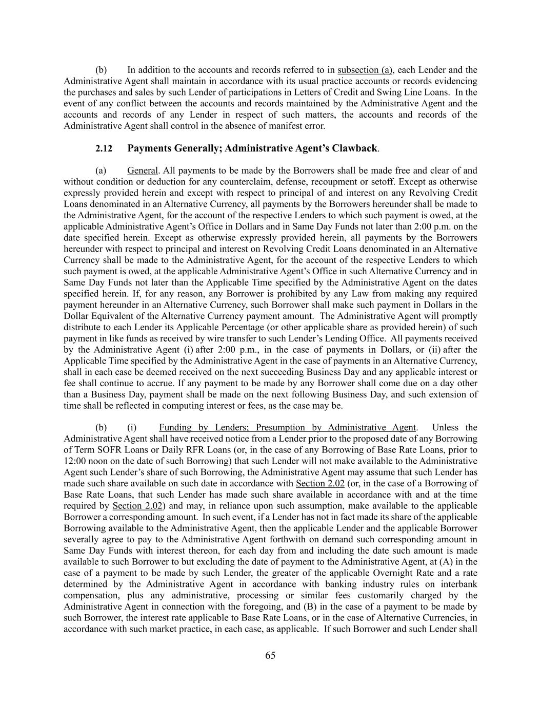 65 (b) In addition to the accounts and records referred to in subsection (a), each Lender and the Administrative Agent shall maintain in accordance with its usual practice accounts or records evidencing the purchases and sales by such Lender of participations in Letters of Credit and Swing Line Loans. In the event of any conflict between the accounts and records maintained by the Administrative Agent and the accounts and records of any Lender in respect of such matters, the accounts and records of the Administrative Agent shall control in the absence of manifest error. 2.12 Payments Generally; Administrative Agent’s Clawback. (a) General. All payments to be made by the Borrowers shall be made free and clear of and without condition or deduction for any counterclaim, defense, recoupment or setoff. Except as otherwise expressly provided herein and except with respect to principal of and interest on any Revolving Credit Loans denominated in an Alternative Currency, all payments by the Borrowers hereunder shall be made to the Administrative Agent, for the account of the respective Lenders to which such payment is owed, at the applicable Administrative Agent’s Office in Dollars and in Same Day Funds not later than 2:00 p.m. on the date specified herein. Except as otherwise expressly provided herein, all payments by the Borrowers hereunder with respect to principal and interest on Revolving Credit Loans denominated in an Alternative Currency shall be made to the Administrative Agent, for the account of the respective Lenders to which such payment is owed, at the applicable Administrative Agent’s Office in such Alternative Currency and in Same Day Funds not later than the Applicable Time specified by the Administrative Agent on the dates specified herein. If, for any reason, any Borrower is prohibited by any Law from making any required payment hereunder in an Alternative Currency, such Borrower shall make such payment in Dollars in the Dollar Equivalent of the Alternative Currency payment amount. The Administrative Agent will promptly distribute to each Lender its Applicable Percentage (or other applicable share as provided herein) of such payment in like funds as received by wire transfer to such Lender’s Lending Office. All payments received by the Administrative Agent (i) after 2:00 p.m., in the case of payments in Dollars, or (ii) after the Applicable Time specified by the Administrative Agent in the case of payments in an Alternative Currency, shall in each case be deemed received on the next succeeding Business Day and any applicable interest or fee shall continue to accrue. If any payment to be made by any Borrower shall come due on a day other than a Business Day, payment shall be made on the next following Business Day, and such extension of time shall be reflected in computing interest or fees, as the case may be. (b) (i) Funding by Lenders; Presumption by Administrative Agent. Unless the Administrative Agent shall have received notice from a Lender prior to the proposed date of any Borrowing of Term SOFR Loans or Daily RFR Loans (or, in the case of any Borrowing of Base Rate Loans, prior to 12:00 noon on the date of such Borrowing) that such Lender will not make available to the Administrative Agent such Lender’s share of such Borrowing, the Administrative Agent may assume that such Lender has made such share available on such date in accordance with Section 2.02 (or, in the case of a Borrowing of Base Rate Loans, that such Lender has made such share available in accordance with and at the time required by Section 2.02) and may, in reliance upon such assumption, make available to the applicable Borrower a corresponding amount. In such event, if a Lender has not in fact made its share of the applicable Borrowing available to the Administrative Agent, then the applicable Lender and the applicable Borrower severally agree to pay to the Administrative Agent forthwith on demand such corresponding amount in Same Day Funds with interest thereon, for each day from and including the date such amount is made available to such Borrower to but excluding the date of payment to the Administrative Agent, at (A) in the case of a payment to be made by such Lender, the greater of the applicable Overnight Rate and a rate determined by the Administrative Agent in accordance with banking industry rules on interbank compensation, plus any administrative, processing or similar fees customarily charged by the Administrative Agent in connection with the foregoing, and (B) in the case of a payment to be made by such Borrower, the interest rate applicable to Base Rate Loans, or in the case of Alternative Currencies, in accordance with such market practice, in each case, as applicable. If such Borrower and such Lender shall