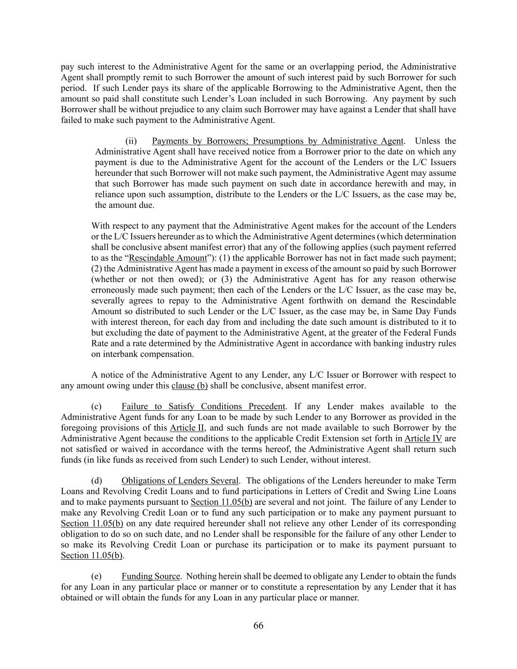 66 pay such interest to the Administrative Agent for the same or an overlapping period, the Administrative Agent shall promptly remit to such Borrower the amount of such interest paid by such Borrower for such period. If such Lender pays its share of the applicable Borrowing to the Administrative Agent, then the amount so paid shall constitute such Lender’s Loan included in such Borrowing. Any payment by such Borrower shall be without prejudice to any claim such Borrower may have against a Lender that shall have failed to make such payment to the Administrative Agent. (ii) Payments by Borrowers; Presumptions by Administrative Agent. Unless the Administrative Agent shall have received notice from a Borrower prior to the date on which any payment is due to the Administrative Agent for the account of the Lenders or the L/C Issuers hereunder that such Borrower will not make such payment, the Administrative Agent may assume that such Borrower has made such payment on such date in accordance herewith and may, in reliance upon such assumption, distribute to the Lenders or the L/C Issuers, as the case may be, the amount due. With respect to any payment that the Administrative Agent makes for the account of the Lenders or the L/C Issuers hereunder as to which the Administrative Agent determines (which determination shall be conclusive absent manifest error) that any of the following applies (such payment referred to as the “Rescindable Amount”): (1) the applicable Borrower has not in fact made such payment; (2) the Administrative Agent has made a payment in excess of the amount so paid by such Borrower (whether or not then owed); or (3) the Administrative Agent has for any reason otherwise erroneously made such payment; then each of the Lenders or the L/C Issuer, as the case may be, severally agrees to repay to the Administrative Agent forthwith on demand the Rescindable Amount so distributed to such Lender or the L/C Issuer, as the case may be, in Same Day Funds with interest thereon, for each day from and including the date such amount is distributed to it to but excluding the date of payment to the Administrative Agent, at the greater of the Federal Funds Rate and a rate determined by the Administrative Agent in accordance with banking industry rules on interbank compensation. A notice of the Administrative Agent to any Lender, any L/C Issuer or Borrower with respect to any amount owing under this clause (b) shall be conclusive, absent manifest error. (c) Failure to Satisfy Conditions Precedent. If any Lender makes available to the Administrative Agent funds for any Loan to be made by such Lender to any Borrower as provided in the foregoing provisions of this Article II, and such funds are not made available to such Borrower by the Administrative Agent because the conditions to the applicable Credit Extension set forth in Article IV are not satisfied or waived in accordance with the terms hereof, the Administrative Agent shall return such funds (in like funds as received from such Lender) to such Lender, without interest. (d) Obligations of Lenders Several. The obligations of the Lenders hereunder to make Term Loans and Revolving Credit Loans and to fund participations in Letters of Credit and Swing Line Loans and to make payments pursuant to Section 11.05(b) are several and not joint. The failure of any Lender to make any Revolving Credit Loan or to fund any such participation or to make any payment pursuant to Section 11.05(b) on any date required hereunder shall not relieve any other Lender of its corresponding obligation to do so on such date, and no Lender shall be responsible for the failure of any other Lender to so make its Revolving Credit Loan or purchase its participation or to make its payment pursuant to Section 11.05(b). (e) Funding Source. Nothing herein shall be deemed to obligate any Lender to obtain the funds for any Loan in any particular place or manner or to constitute a representation by any Lender that it has obtained or will obtain the funds for any Loan in any particular place or manner.
