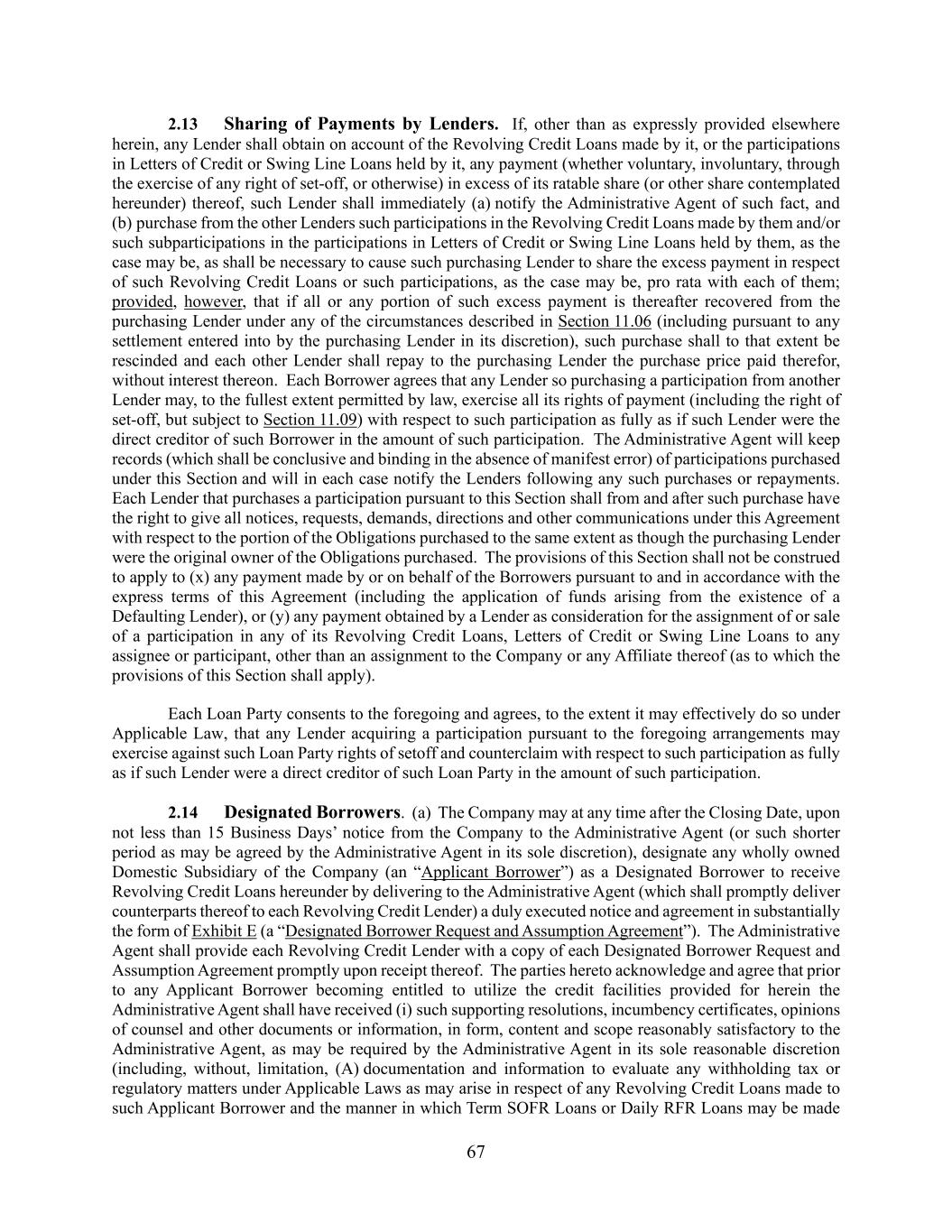 67 2.13 Sharing of Payments by Lenders. If, other than as expressly provided elsewhere herein, any Lender shall obtain on account of the Revolving Credit Loans made by it, or the participations in Letters of Credit or Swing Line Loans held by it, any payment (whether voluntary, involuntary, through the exercise of any right of set-off, or otherwise) in excess of its ratable share (or other share contemplated hereunder) thereof, such Lender shall immediately (a) notify the Administrative Agent of such fact, and (b) purchase from the other Lenders such participations in the Revolving Credit Loans made by them and/or such subparticipations in the participations in Letters of Credit or Swing Line Loans held by them, as the case may be, as shall be necessary to cause such purchasing Lender to share the excess payment in respect of such Revolving Credit Loans or such participations, as the case may be, pro rata with each of them; provided, however, that if all or any portion of such excess payment is thereafter recovered from the purchasing Lender under any of the circumstances described in Section 11.06 (including pursuant to any settlement entered into by the purchasing Lender in its discretion), such purchase shall to that extent be rescinded and each other Lender shall repay to the purchasing Lender the purchase price paid therefor, without interest thereon. Each Borrower agrees that any Lender so purchasing a participation from another Lender may, to the fullest extent permitted by law, exercise all its rights of payment (including the right of set-off, but subject to Section 11.09) with respect to such participation as fully as if such Lender were the direct creditor of such Borrower in the amount of such participation. The Administrative Agent will keep records (which shall be conclusive and binding in the absence of manifest error) of participations purchased under this Section and will in each case notify the Lenders following any such purchases or repayments. Each Lender that purchases a participation pursuant to this Section shall from and after such purchase have the right to give all notices, requests, demands, directions and other communications under this Agreement with respect to the portion of the Obligations purchased to the same extent as though the purchasing Lender were the original owner of the Obligations purchased. The provisions of this Section shall not be construed to apply to (x) any payment made by or on behalf of the Borrowers pursuant to and in accordance with the express terms of this Agreement (including the application of funds arising from the existence of a Defaulting Lender), or (y) any payment obtained by a Lender as consideration for the assignment of or sale of a participation in any of its Revolving Credit Loans, Letters of Credit or Swing Line Loans to any assignee or participant, other than an assignment to the Company or any Affiliate thereof (as to which the provisions of this Section shall apply). Each Loan Party consents to the foregoing and agrees, to the extent it may effectively do so under Applicable Law, that any Lender acquiring a participation pursuant to the foregoing arrangements may exercise against such Loan Party rights of setoff and counterclaim with respect to such participation as fully as if such Lender were a direct creditor of such Loan Party in the amount of such participation. 2.14 Designated Borrowers. (a) The Company may at any time after the Closing Date, upon not less than 15 Business Days’ notice from the Company to the Administrative Agent (or such shorter period as may be agreed by the Administrative Agent in its sole discretion), designate any wholly owned Domestic Subsidiary of the Company (an “Applicant Borrower”) as a Designated Borrower to receive Revolving Credit Loans hereunder by delivering to the Administrative Agent (which shall promptly deliver counterparts thereof to each Revolving Credit Lender) a duly executed notice and agreement in substantially the form of Exhibit E (a “Designated Borrower Request and Assumption Agreement”). The Administrative Agent shall provide each Revolving Credit Lender with a copy of each Designated Borrower Request and Assumption Agreement promptly upon receipt thereof. The parties hereto acknowledge and agree that prior to any Applicant Borrower becoming entitled to utilize the credit facilities provided for herein the Administrative Agent shall have received (i) such supporting resolutions, incumbency certificates, opinions of counsel and other documents or information, in form, content and scope reasonably satisfactory to the Administrative Agent, as may be required by the Administrative Agent in its sole reasonable discretion (including, without, limitation, (A) documentation and information to evaluate any withholding tax or regulatory matters under Applicable Laws as may arise in respect of any Revolving Credit Loans made to such Applicant Borrower and the manner in which Term SOFR Loans or Daily RFR Loans may be made
