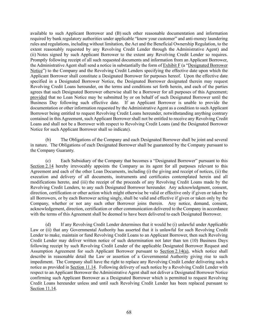 68 available to such Applicant Borrower and (B) such other reasonable documentation and information required by bank regulatory authorities under applicable “know your customer” and anti-money laundering rules and regulations, including without limitation, the Act and the Beneficial Ownership Regulation, to the extent reasonably requested by any Revolving Credit Lender through the Administrative Agent) and (ii) Notes signed by such Applicant Borrower to the extent any Revolving Credit Lender so requires. Promptly following receipt of all such requested documents and information from an Applicant Borrower, the Administrative Agent shall send a notice in substantially the form of Exhibit F (a “Designated Borrower Notice”) to the Company and the Revolving Credit Lenders specifying the effective date upon which the Applicant Borrower shall constitute a Designated Borrower for purposes hereof. Upon the effective date specified in a Designated Borrower Notice, the Designated Borrower designated therein may request Revolving Credit Loans hereunder, on the terms and conditions set forth herein, and each of the parties agrees that such Designated Borrower otherwise shall be a Borrower for all purposes of this Agreement; provided that no Loan Notice may be submitted by or on behalf of such Designated Borrower until the Business Day following such effective date. If an Applicant Borrower is unable to provide the documentation or other information requested by the Administrative Agent as a condition to such Applicant Borrower being entitled to request Revolving Credit Loans hereunder, notwithstanding anything contrary contained in this Agreement, such Applicant Borrower shall not be entitled to receive any Revolving Credit Loans and shall not be a Borrower with respect to Revolving Credit Loans (and the Designated Borrower Notice for such Applicant Borrower shall so indicate). (b) The Obligations of the Company and each Designated Borrower shall be joint and several in nature. The Obligations of each Designated Borrower shall be guaranteed by the Company pursuant to the Company Guaranty. (c) Each Subsidiary of the Company that becomes a “Designated Borrower” pursuant to this Section 2.14 hereby irrevocably appoints the Company as its agent for all purposes relevant to this Agreement and each of the other Loan Documents, including (i) the giving and receipt of notices, (ii) the execution and delivery of all documents, instruments and certificates contemplated herein and all modifications hereto, and (iii) the receipt of the proceeds of any Revolving Credit Loans made by the Revolving Credit Lenders, to any such Designated Borrower hereunder. Any acknowledgment, consent, direction, certification or other action which might otherwise be valid or effective only if given or taken by all Borrowers, or by each Borrower acting singly, shall be valid and effective if given or taken only by the Company, whether or not any such other Borrower joins therein. Any notice, demand, consent, acknowledgement, direction, certification or other communication delivered to the Company in accordance with the terms of this Agreement shall be deemed to have been delivered to each Designated Borrower. (d) If any Revolving Credit Lender determines that it would be (i) unlawful under Applicable Law or (ii) that any Governmental Authority has asserted that it is unlawful for such Revolving Credit Lender to make, maintain or fund Revolving Credit Loans to an Applicant Borrower, then such Revolving Credit Lender may deliver written notice of such determination not later than ten (10) Business Days following receipt by such Revolving Credit Lender of the applicable Designated Borrower Request and Assumption Agreement for such Applicant Borrower pursuant to Section 2.14(a), which notice shall describe in reasonable detail the Law or assertion of a Governmental Authority giving rise to such impediment. The Company shall have the right to replace any Revolving Credit Lender delivering such a notice as provided in Section 11.14. Following delivery of such notice by a Revolving Credit Lender with respect to an Applicant Borrower the Administrative Agent shall not deliver a Designated Borrower Notice confirming such Applicant Borrower as a Designated Borrower which is permitted to request Revolving Credit Loans hereunder unless and until such Revolving Credit Lender has been replaced pursuant to Section 11.14.