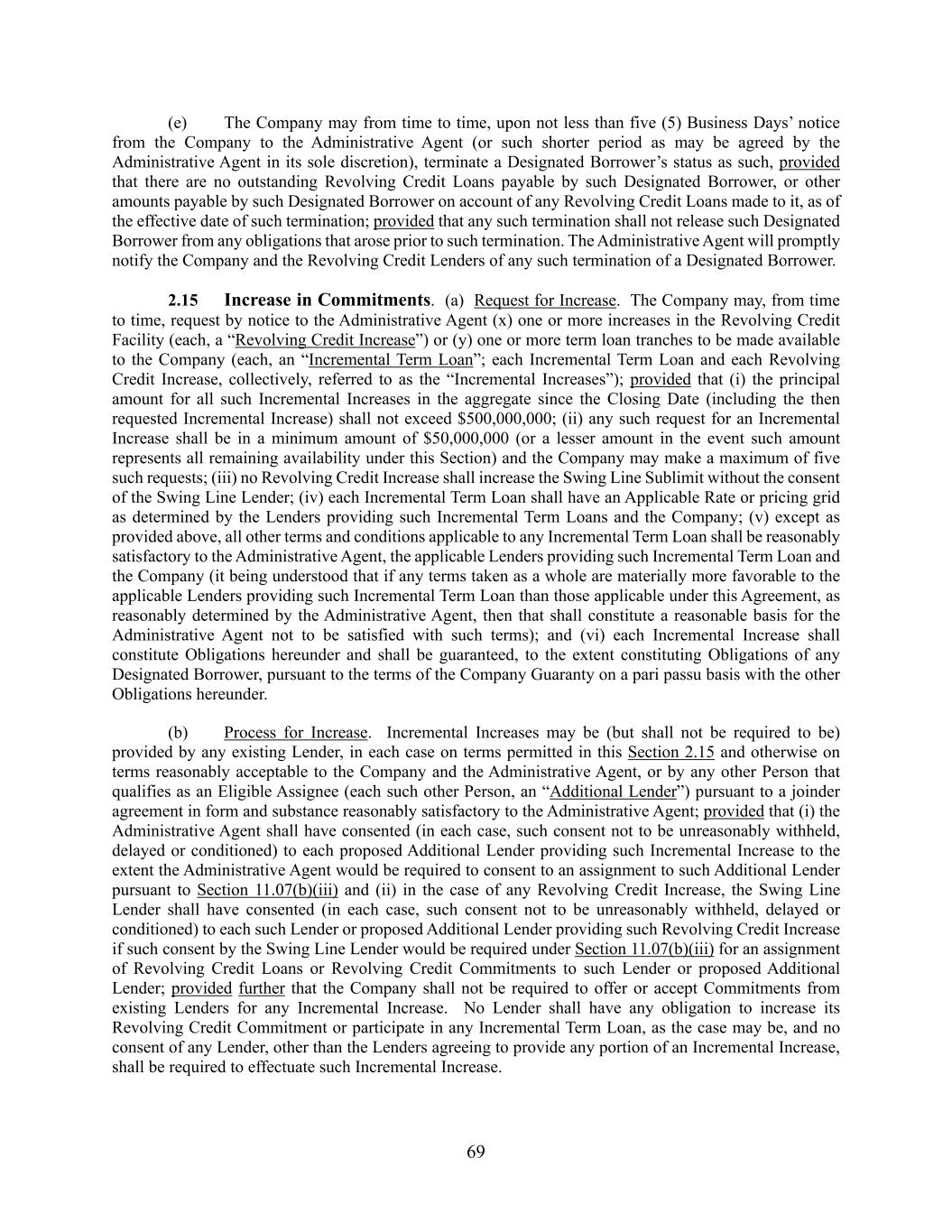 69 (e) The Company may from time to time, upon not less than five (5) Business Days’ notice from the Company to the Administrative Agent (or such shorter period as may be agreed by the Administrative Agent in its sole discretion), terminate a Designated Borrower’s status as such, provided that there are no outstanding Revolving Credit Loans payable by such Designated Borrower, or other amounts payable by such Designated Borrower on account of any Revolving Credit Loans made to it, as of the effective date of such termination; provided that any such termination shall not release such Designated Borrower from any obligations that arose prior to such termination. The Administrative Agent will promptly notify the Company and the Revolving Credit Lenders of any such termination of a Designated Borrower. 2.15 Increase in Commitments. (a) Request for Increase. The Company may, from time to time, request by notice to the Administrative Agent (x) one or more increases in the Revolving Credit Facility (each, a “Revolving Credit Increase”) or (y) one or more term loan tranches to be made available to the Company (each, an “Incremental Term Loan”; each Incremental Term Loan and each Revolving Credit Increase, collectively, referred to as the “Incremental Increases”); provided that (i) the principal amount for all such Incremental Increases in the aggregate since the Closing Date (including the then requested Incremental Increase) shall not exceed $500,000,000; (ii) any such request for an Incremental Increase shall be in a minimum amount of $50,000,000 (or a lesser amount in the event such amount represents all remaining availability under this Section) and the Company may make a maximum of five such requests; (iii) no Revolving Credit Increase shall increase the Swing Line Sublimit without the consent of the Swing Line Lender; (iv) each Incremental Term Loan shall have an Applicable Rate or pricing grid as determined by the Lenders providing such Incremental Term Loans and the Company; (v) except as provided above, all other terms and conditions applicable to any Incremental Term Loan shall be reasonably satisfactory to the Administrative Agent, the applicable Lenders providing such Incremental Term Loan and the Company (it being understood that if any terms taken as a whole are materially more favorable to the applicable Lenders providing such Incremental Term Loan than those applicable under this Agreement, as reasonably determined by the Administrative Agent, then that shall constitute a reasonable basis for the Administrative Agent not to be satisfied with such terms); and (vi) each Incremental Increase shall constitute Obligations hereunder and shall be guaranteed, to the extent constituting Obligations of any Designated Borrower, pursuant to the terms of the Company Guaranty on a pari passu basis with the other Obligations hereunder. (b) Process for Increase. Incremental Increases may be (but shall not be required to be) provided by any existing Lender, in each case on terms permitted in this Section 2.15 and otherwise on terms reasonably acceptable to the Company and the Administrative Agent, or by any other Person that qualifies as an Eligible Assignee (each such other Person, an “Additional Lender”) pursuant to a joinder agreement in form and substance reasonably satisfactory to the Administrative Agent; provided that (i) the Administrative Agent shall have consented (in each case, such consent not to be unreasonably withheld, delayed or conditioned) to each proposed Additional Lender providing such Incremental Increase to the extent the Administrative Agent would be required to consent to an assignment to such Additional Lender pursuant to Section 11.07(b)(iii) and (ii) in the case of any Revolving Credit Increase, the Swing Line Lender shall have consented (in each case, such consent not to be unreasonably withheld, delayed or conditioned) to each such Lender or proposed Additional Lender providing such Revolving Credit Increase if such consent by the Swing Line Lender would be required under Section 11.07(b)(iii) for an assignment of Revolving Credit Loans or Revolving Credit Commitments to such Lender or proposed Additional Lender; provided further that the Company shall not be required to offer or accept Commitments from existing Lenders for any Incremental Increase. No Lender shall have any obligation to increase its Revolving Credit Commitment or participate in any Incremental Term Loan, as the case may be, and no consent of any Lender, other than the Lenders agreeing to provide any portion of an Incremental Increase, shall be required to effectuate such Incremental Increase.