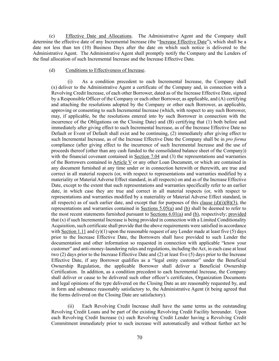 70 (c) Effective Date and Allocations. The Administrative Agent and the Company shall determine the effective date of any Incremental Increase (the “Increase Effective Date”), which shall be a date not less than ten (10) Business Days after the date on which such notice is delivered to the Administrative Agent. The Administrative Agent shall promptly notify the Company and the Lenders of the final allocation of such Incremental Increase and the Increase Effective Date. (d) Conditions to Effectiveness of Increase. (i) As a condition precedent to each Incremental Increase, the Company shall (x) deliver to the Administrative Agent a certificate of the Company and, in connection with a Revolving Credit Increase, of each other Borrower, dated as of the Increase Effective Date, signed by a Responsible Officer of the Company or each other Borrower, as applicable, and (A) certifying and attaching the resolutions adopted by the Company or other each Borrower, as applicable, approving or consenting to such Incremental Increase (which, with respect to any such Borrower, may, if applicable, be the resolutions entered into by such Borrower in connection with the incurrence of the Obligations on the Closing Date) and (B) certifying that (1) both before and immediately after giving effect to such Incremental Increase, as of the Increase Effective Date no Default or Event of Default shall exist and be continuing, (2) immediately after giving effect to such Incremental Increase, as of the Increase Effective Date the Company shall be in pro forma compliance (after giving effect to the incurrence of such Incremental Increase and the use of proceeds thereof (other than any cash funded to the consolidated balance sheet of the Company)) with the financial covenant contained in Section 7.04 and (3) the representations and warranties of the Borrowers contained in Article V or any other Loan Document, or which are contained in any document furnished at any time under or in connection herewith or therewith, are true and correct in all material respects (or, with respect to representations and warranties modified by a materiality or Material Adverse Effect standard, in all respects) on and as of the Increase Effective Date, except to the extent that such representations and warranties specifically refer to an earlier date, in which case they are true and correct in all material respects (or, with respect to representations and warranties modified by a materiality or Material Adverse Effect standard, in all respects) as of such earlier date, and except that for purposes of this clause (d)(i)(B)(3), the representations and warranties contained in Sections 5.05(a) and (b) shall be deemed to refer to the most recent statements furnished pursuant to Sections 6.01(a) and (b), respectively; provided that (x) if such Incremental Increase is being provided in connection with a Limited Conditionality Acquisition, such certificate shall provide that the above requirements were satisfied in accordance with Section 1.11 and (y)(1) upon the reasonable request of any Lender made at least five (5) days prior to the Increase Effective Date, the Borrowers shall have provided to such Lender the documentation and other information so requested in connection with applicable “know your customer” and anti-money-laundering rules and regulations, including the Act, in each case at least two (2) days prior to the Increase Effective Date and (2) at least five (5) days prior to the Increase Effective Date, if any Borrower qualifies as a “legal entity customer” under the Beneficial Ownership Regulation, the applicable Borrower shall deliver a Beneficial Ownership Certification. In addition, as a condition precedent to each Incremental Increase, the Company shall deliver or cause to be delivered such other officer’s certificates, Organization Documents and legal opinions of the type delivered on the Closing Date as are reasonably requested by, and in form and substance reasonably satisfactory to, the Administrative Agent (it being agreed that the forms delivered on the Closing Date are satisfactory). (ii) Each Revolving Credit Increase shall have the same terms as the outstanding Revolving Credit Loans and be part of the existing Revolving Credit Facility hereunder. Upon each Revolving Credit Increase (x) each Revolving Credit Lender having a Revolving Credit Commitment immediately prior to such increase will automatically and without further act be
