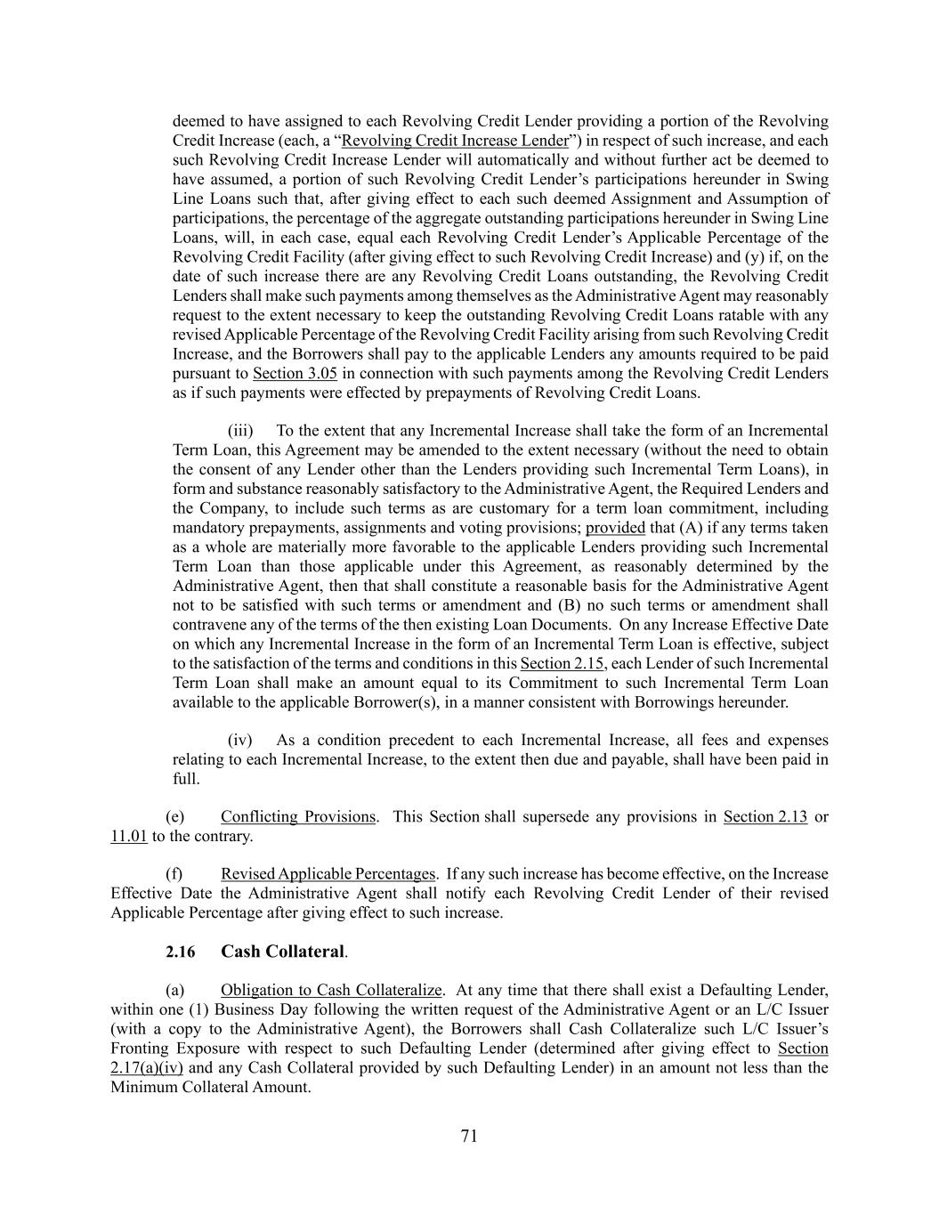71 deemed to have assigned to each Revolving Credit Lender providing a portion of the Revolving Credit Increase (each, a “Revolving Credit Increase Lender”) in respect of such increase, and each such Revolving Credit Increase Lender will automatically and without further act be deemed to have assumed, a portion of such Revolving Credit Lender’s participations hereunder in Swing Line Loans such that, after giving effect to each such deemed Assignment and Assumption of participations, the percentage of the aggregate outstanding participations hereunder in Swing Line Loans, will, in each case, equal each Revolving Credit Lender’s Applicable Percentage of the Revolving Credit Facility (after giving effect to such Revolving Credit Increase) and (y) if, on the date of such increase there are any Revolving Credit Loans outstanding, the Revolving Credit Lenders shall make such payments among themselves as the Administrative Agent may reasonably request to the extent necessary to keep the outstanding Revolving Credit Loans ratable with any revised Applicable Percentage of the Revolving Credit Facility arising from such Revolving Credit Increase, and the Borrowers shall pay to the applicable Lenders any amounts required to be paid pursuant to Section 3.05 in connection with such payments among the Revolving Credit Lenders as if such payments were effected by prepayments of Revolving Credit Loans. (iii) To the extent that any Incremental Increase shall take the form of an Incremental Term Loan, this Agreement may be amended to the extent necessary (without the need to obtain the consent of any Lender other than the Lenders providing such Incremental Term Loans), in form and substance reasonably satisfactory to the Administrative Agent, the Required Lenders and the Company, to include such terms as are customary for a term loan commitment, including mandatory prepayments, assignments and voting provisions; provided that (A) if any terms taken as a whole are materially more favorable to the applicable Lenders providing such Incremental Term Loan than those applicable under this Agreement, as reasonably determined by the Administrative Agent, then that shall constitute a reasonable basis for the Administrative Agent not to be satisfied with such terms or amendment and (B) no such terms or amendment shall contravene any of the terms of the then existing Loan Documents. On any Increase Effective Date on which any Incremental Increase in the form of an Incremental Term Loan is effective, subject to the satisfaction of the terms and conditions in this Section 2.15, each Lender of such Incremental Term Loan shall make an amount equal to its Commitment to such Incremental Term Loan available to the applicable Borrower(s), in a manner consistent with Borrowings hereunder. (iv) As a condition precedent to each Incremental Increase, all fees and expenses relating to each Incremental Increase, to the extent then due and payable, shall have been paid in full. (e) Conflicting Provisions. This Section shall supersede any provisions in Section 2.13 or 11.01 to the contrary. (f) Revised Applicable Percentages. If any such increase has become effective, on the Increase Effective Date the Administrative Agent shall notify each Revolving Credit Lender of their revised Applicable Percentage after giving effect to such increase. 2.16 Cash Collateral. (a) Obligation to Cash Collateralize. At any time that there shall exist a Defaulting Lender, within one (1) Business Day following the written request of the Administrative Agent or an L/C Issuer (with a copy to the Administrative Agent), the Borrowers shall Cash Collateralize such L/C Issuer’s Fronting Exposure with respect to such Defaulting Lender (determined after giving effect to Section 2.17(a)(iv) and any Cash Collateral provided by such Defaulting Lender) in an amount not less than the Minimum Collateral Amount.