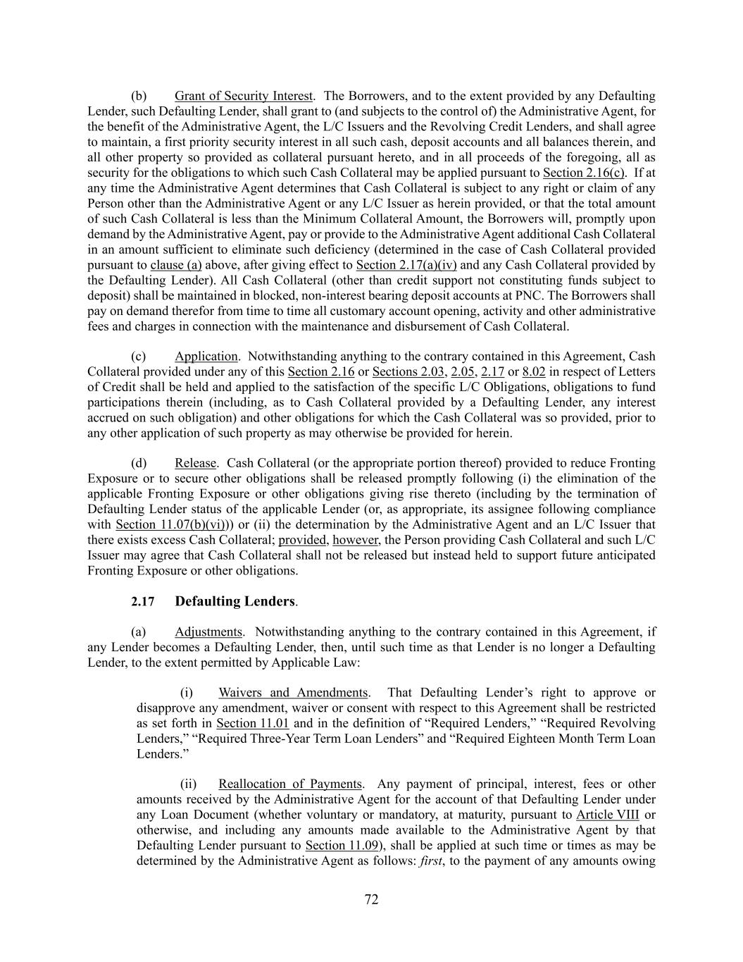 72 (b) Grant of Security Interest. The Borrowers, and to the extent provided by any Defaulting Lender, such Defaulting Lender, shall grant to (and subjects to the control of) the Administrative Agent, for the benefit of the Administrative Agent, the L/C Issuers and the Revolving Credit Lenders, and shall agree to maintain, a first priority security interest in all such cash, deposit accounts and all balances therein, and all other property so provided as collateral pursuant hereto, and in all proceeds of the foregoing, all as security for the obligations to which such Cash Collateral may be applied pursuant to Section 2.16(c). If at any time the Administrative Agent determines that Cash Collateral is subject to any right or claim of any Person other than the Administrative Agent or any L/C Issuer as herein provided, or that the total amount of such Cash Collateral is less than the Minimum Collateral Amount, the Borrowers will, promptly upon demand by the Administrative Agent, pay or provide to the Administrative Agent additional Cash Collateral in an amount sufficient to eliminate such deficiency (determined in the case of Cash Collateral provided pursuant to clause (a) above, after giving effect to Section 2.17(a)(iv) and any Cash Collateral provided by the Defaulting Lender). All Cash Collateral (other than credit support not constituting funds subject to deposit) shall be maintained in blocked, non-interest bearing deposit accounts at PNC. The Borrowers shall pay on demand therefor from time to time all customary account opening, activity and other administrative fees and charges in connection with the maintenance and disbursement of Cash Collateral. (c) Application. Notwithstanding anything to the contrary contained in this Agreement, Cash Collateral provided under any of this Section 2.16 or Sections 2.03, 2.05, 2.17 or 8.02 in respect of Letters of Credit shall be held and applied to the satisfaction of the specific L/C Obligations, obligations to fund participations therein (including, as to Cash Collateral provided by a Defaulting Lender, any interest accrued on such obligation) and other obligations for which the Cash Collateral was so provided, prior to any other application of such property as may otherwise be provided for herein. (d) Release. Cash Collateral (or the appropriate portion thereof) provided to reduce Fronting Exposure or to secure other obligations shall be released promptly following (i) the elimination of the applicable Fronting Exposure or other obligations giving rise thereto (including by the termination of Defaulting Lender status of the applicable Lender (or, as appropriate, its assignee following compliance with Section 11.07(b)(vi))) or (ii) the determination by the Administrative Agent and an L/C Issuer that there exists excess Cash Collateral; provided, however, the Person providing Cash Collateral and such L/C Issuer may agree that Cash Collateral shall not be released but instead held to support future anticipated Fronting Exposure or other obligations. 2.17 Defaulting Lenders. (a) Adjustments. Notwithstanding anything to the contrary contained in this Agreement, if any Lender becomes a Defaulting Lender, then, until such time as that Lender is no longer a Defaulting Lender, to the extent permitted by Applicable Law: (i) Waivers and Amendments. That Defaulting Lender’s right to approve or disapprove any amendment, waiver or consent with respect to this Agreement shall be restricted as set forth in Section 11.01 and in the definition of “Required Lenders,” “Required Revolving Lenders,” “Required Three-Year Term Loan Lenders” and “Required Eighteen Month Term Loan Lenders.” (ii) Reallocation of Payments. Any payment of principal, interest, fees or other amounts received by the Administrative Agent for the account of that Defaulting Lender under any Loan Document (whether voluntary or mandatory, at maturity, pursuant to Article VIII or otherwise, and including any amounts made available to the Administrative Agent by that Defaulting Lender pursuant to Section 11.09), shall be applied at such time or times as may be determined by the Administrative Agent as follows: first, to the payment of any amounts owing