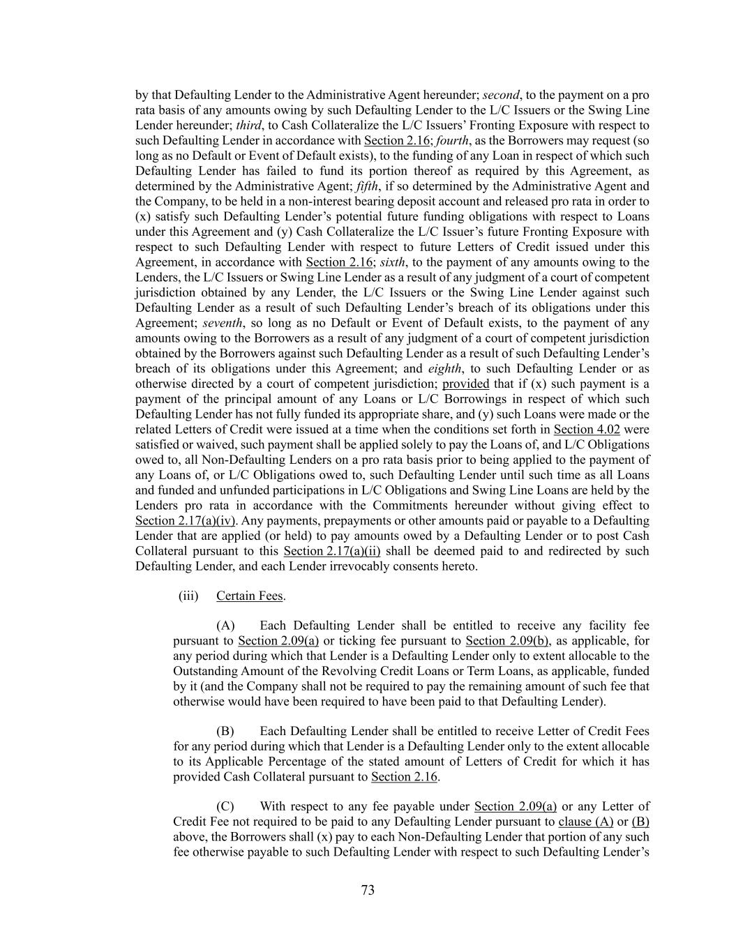 73 by that Defaulting Lender to the Administrative Agent hereunder; second, to the payment on a pro rata basis of any amounts owing by such Defaulting Lender to the L/C Issuers or the Swing Line Lender hereunder; third, to Cash Collateralize the L/C Issuers’ Fronting Exposure with respect to such Defaulting Lender in accordance with Section 2.16; fourth, as the Borrowers may request (so long as no Default or Event of Default exists), to the funding of any Loan in respect of which such Defaulting Lender has failed to fund its portion thereof as required by this Agreement, as determined by the Administrative Agent; fifth, if so determined by the Administrative Agent and the Company, to be held in a non-interest bearing deposit account and released pro rata in order to (x) satisfy such Defaulting Lender’s potential future funding obligations with respect to Loans under this Agreement and (y) Cash Collateralize the L/C Issuer’s future Fronting Exposure with respect to such Defaulting Lender with respect to future Letters of Credit issued under this Agreement, in accordance with Section 2.16; sixth, to the payment of any amounts owing to the Lenders, the L/C Issuers or Swing Line Lender as a result of any judgment of a court of competent jurisdiction obtained by any Lender, the L/C Issuers or the Swing Line Lender against such Defaulting Lender as a result of such Defaulting Lender’s breach of its obligations under this Agreement; seventh, so long as no Default or Event of Default exists, to the payment of any amounts owing to the Borrowers as a result of any judgment of a court of competent jurisdiction obtained by the Borrowers against such Defaulting Lender as a result of such Defaulting Lender’s breach of its obligations under this Agreement; and eighth, to such Defaulting Lender or as otherwise directed by a court of competent jurisdiction; provided that if (x) such payment is a payment of the principal amount of any Loans or L/C Borrowings in respect of which such Defaulting Lender has not fully funded its appropriate share, and (y) such Loans were made or the related Letters of Credit were issued at a time when the conditions set forth in Section 4.02 were satisfied or waived, such payment shall be applied solely to pay the Loans of, and L/C Obligations owed to, all Non-Defaulting Lenders on a pro rata basis prior to being applied to the payment of any Loans of, or L/C Obligations owed to, such Defaulting Lender until such time as all Loans and funded and unfunded participations in L/C Obligations and Swing Line Loans are held by the Lenders pro rata in accordance with the Commitments hereunder without giving effect to Section 2.17(a)(iv). Any payments, prepayments or other amounts paid or payable to a Defaulting Lender that are applied (or held) to pay amounts owed by a Defaulting Lender or to post Cash Collateral pursuant to this Section 2.17(a)(ii) shall be deemed paid to and redirected by such Defaulting Lender, and each Lender irrevocably consents hereto. (iii) Certain Fees. (A) Each Defaulting Lender shall be entitled to receive any facility fee pursuant to Section 2.09(a) or ticking fee pursuant to Section 2.09(b), as applicable, for any period during which that Lender is a Defaulting Lender only to extent allocable to the Outstanding Amount of the Revolving Credit Loans or Term Loans, as applicable, funded by it (and the Company shall not be required to pay the remaining amount of such fee that otherwise would have been required to have been paid to that Defaulting Lender). (B) Each Defaulting Lender shall be entitled to receive Letter of Credit Fees for any period during which that Lender is a Defaulting Lender only to the extent allocable to its Applicable Percentage of the stated amount of Letters of Credit for which it has provided Cash Collateral pursuant to Section 2.16. (C) With respect to any fee payable under Section 2.09(a) or any Letter of Credit Fee not required to be paid to any Defaulting Lender pursuant to clause (A) or (B) above, the Borrowers shall (x) pay to each Non-Defaulting Lender that portion of any such fee otherwise payable to such Defaulting Lender with respect to such Defaulting Lender’s