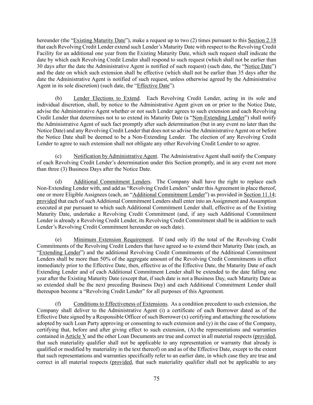 75 hereunder (the “Existing Maturity Date”), make a request up to two (2) times pursuant to this Section 2.18 that each Revolving Credit Lender extend such Lender’s Maturity Date with respect to the Revolving Credit Facility for an additional one year from the Existing Maturity Date, which such request shall indicate the date by which each Revolving Credit Lender shall respond to such request (which shall not be earlier than 30 days after the date the Administrative Agent is notified of such request) (such date, the “Notice Date”) and the date on which such extension shall be effective (which shall not be earlier than 35 days after the date the Administrative Agent is notified of such request, unless otherwise agreed by the Administrative Agent in its sole discretion) (such date, the “Effective Date”). (b) Lender Elections to Extend. Each Revolving Credit Lender, acting in its sole and individual discretion, shall, by notice to the Administrative Agent given on or prior to the Notice Date, advise the Administrative Agent whether or not such Lender agrees to such extension and each Revolving Credit Lender that determines not to so extend its Maturity Date (a “Non-Extending Lender”) shall notify the Administrative Agent of such fact promptly after such determination (but in any event no later than the Notice Date) and any Revolving Credit Lender that does not so advise the Administrative Agent on or before the Notice Date shall be deemed to be a Non-Extending Lender. The election of any Revolving Credit Lender to agree to such extension shall not obligate any other Revolving Credit Lender to so agree. (c) Notification by Administrative Agent. The Administrative Agent shall notify the Company of each Revolving Credit Lender’s determination under this Section promptly, and in any event not more than three (3) Business Days after the Notice Date. (d) Additional Commitment Lenders. The Company shall have the right to replace each Non-Extending Lender with, and add as “Revolving Credit Lenders” under this Agreement in place thereof, one or more Eligible Assignees (each, an “Additional Commitment Lender”) as provided in Section 11.14; provided that each of such Additional Commitment Lenders shall enter into an Assignment and Assumption executed at par pursuant to which such Additional Commitment Lender shall, effective as of the Existing Maturity Date, undertake a Revolving Credit Commitment (and, if any such Additional Commitment Lender is already a Revolving Credit Lender, its Revolving Credit Commitment shall be in addition to such Lender’s Revolving Credit Commitment hereunder on such date). (e) Minimum Extension Requirement. If (and only if) the total of the Revolving Credit Commitments of the Revolving Credit Lenders that have agreed so to extend their Maturity Date (each, an “Extending Lender”) and the additional Revolving Credit Commitments of the Additional Commitment Lenders shall be more than 50% of the aggregate amount of the Revolving Credit Commitments in effect immediately prior to the Effective Date, then, effective as of the Effective Date, the Maturity Date of each Extending Lender and of each Additional Commitment Lender shall be extended to the date falling one year after the Existing Maturity Date (except that, if such date is not a Business Day, such Maturity Date as so extended shall be the next preceding Business Day) and each Additional Commitment Lender shall thereupon become a “Revolving Credit Lender” for all purposes of this Agreement. (f) Conditions to Effectiveness of Extensions. As a condition precedent to such extension, the Company shall deliver to the Administrative Agent (i) a certificate of each Borrower dated as of the Effective Date signed by a Responsible Officer of such Borrower (x) certifying and attaching the resolutions adopted by such Loan Party approving or consenting to such extension and (y) in the case of the Company, certifying that, before and after giving effect to such extension, (A) the representations and warranties contained in Article V and the other Loan Documents are true and correct in all material respects (provided, that such materiality qualifier shall not be applicable to any representation or warranty that already is qualified or modified by materiality in the text thereof) on and as of the Effective Date, except to the extent that such representations and warranties specifically refer to an earlier date, in which case they are true and correct in all material respects (provided, that such materiality qualifier shall not be applicable to any