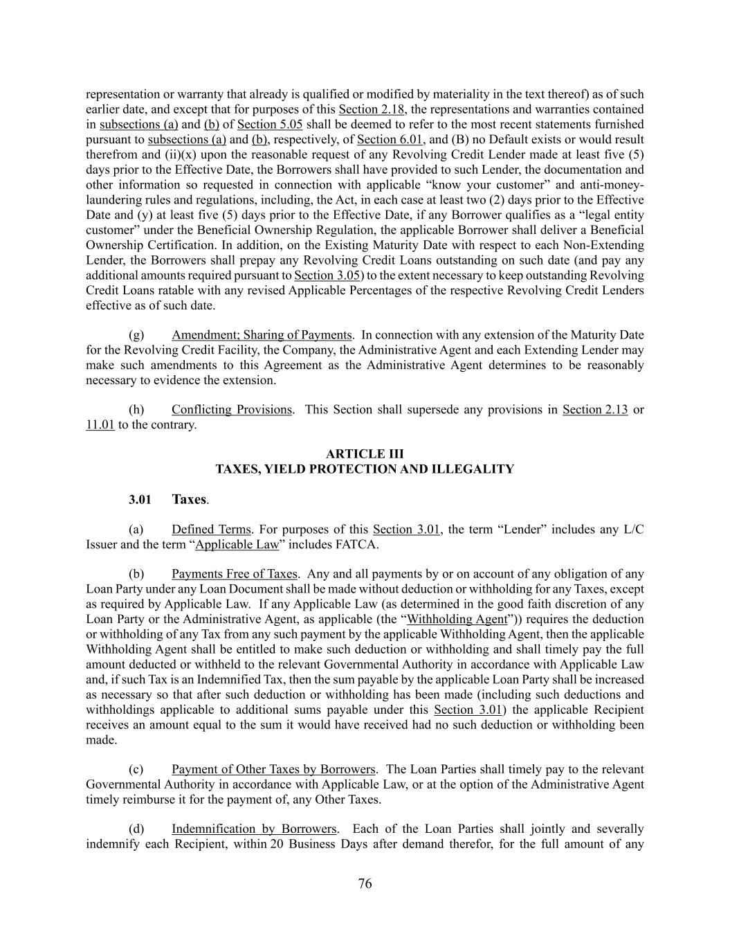 76 representation or warranty that already is qualified or modified by materiality in the text thereof) as of such earlier date, and except that for purposes of this Section 2.18, the representations and warranties contained in subsections (a) and (b) of Section 5.05 shall be deemed to refer to the most recent statements furnished pursuant to subsections (a) and (b), respectively, of Section 6.01, and (B) no Default exists or would result therefrom and (ii)(x) upon the reasonable request of any Revolving Credit Lender made at least five (5) days prior to the Effective Date, the Borrowers shall have provided to such Lender, the documentation and other information so requested in connection with applicable “know your customer” and anti-money- laundering rules and regulations, including, the Act, in each case at least two (2) days prior to the Effective Date and (y) at least five (5) days prior to the Effective Date, if any Borrower qualifies as a “legal entity customer” under the Beneficial Ownership Regulation, the applicable Borrower shall deliver a Beneficial Ownership Certification. In addition, on the Existing Maturity Date with respect to each Non-Extending Lender, the Borrowers shall prepay any Revolving Credit Loans outstanding on such date (and pay any additional amounts required pursuant to Section 3.05) to the extent necessary to keep outstanding Revolving Credit Loans ratable with any revised Applicable Percentages of the respective Revolving Credit Lenders effective as of such date. (g) Amendment; Sharing of Payments. In connection with any extension of the Maturity Date for the Revolving Credit Facility, the Company, the Administrative Agent and each Extending Lender may make such amendments to this Agreement as the Administrative Agent determines to be reasonably necessary to evidence the extension. (h) Conflicting Provisions. This Section shall supersede any provisions in Section 2.13 or 11.01 to the contrary. ARTICLE III TAXES, YIELD PROTECTION AND ILLEGALITY 3.01 Taxes. (a) Defined Terms. For purposes of this Section 3.01, the term “Lender” includes any L/C Issuer and the term “Applicable Law” includes FATCA. (b) Payments Free of Taxes. Any and all payments by or on account of any obligation of any Loan Party under any Loan Document shall be made without deduction or withholding for any Taxes, except as required by Applicable Law. If any Applicable Law (as determined in the good faith discretion of any Loan Party or the Administrative Agent, as applicable (the “Withholding Agent”)) requires the deduction or withholding of any Tax from any such payment by the applicable Withholding Agent, then the applicable Withholding Agent shall be entitled to make such deduction or withholding and shall timely pay the full amount deducted or withheld to the relevant Governmental Authority in accordance with Applicable Law and, if such Tax is an Indemnified Tax, then the sum payable by the applicable Loan Party shall be increased as necessary so that after such deduction or withholding has been made (including such deductions and withholdings applicable to additional sums payable under this Section 3.01) the applicable Recipient receives an amount equal to the sum it would have received had no such deduction or withholding been made. (c) Payment of Other Taxes by Borrowers. The Loan Parties shall timely pay to the relevant Governmental Authority in accordance with Applicable Law, or at the option of the Administrative Agent timely reimburse it for the payment of, any Other Taxes. (d) Indemnification by Borrowers. Each of the Loan Parties shall jointly and severally indemnify each Recipient, within 20 Business Days after demand therefor, for the full amount of any