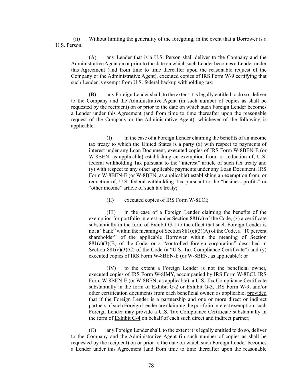 78 (ii) Without limiting the generality of the foregoing, in the event that a Borrower is a U.S. Person, (A) any Lender that is a U.S. Person shall deliver to the Company and the Administrative Agent on or prior to the date on which such Lender becomes a Lender under this Agreement (and from time to time thereafter upon the reasonable request of the Company or the Administrative Agent), executed copies of IRS Form W-9 certifying that such Lender is exempt from U.S. federal backup withholding tax; (B) any Foreign Lender shall, to the extent it is legally entitled to do so, deliver to the Company and the Administrative Agent (in such number of copies as shall be requested by the recipient) on or prior to the date on which such Foreign Lender becomes a Lender under this Agreement (and from time to time thereafter upon the reasonable request of the Company or the Administrative Agent), whichever of the following is applicable: (I) in the case of a Foreign Lender claiming the benefits of an income tax treaty to which the United States is a party (x) with respect to payments of interest under any Loan Document, executed copies of IRS Form W-8BEN-E (or W-8BEN, as applicable) establishing an exemption from, or reduction of, U.S. federal withholding Tax pursuant to the “interest” article of such tax treaty and (y) with respect to any other applicable payments under any Loan Document, IRS Form W-8BEN-E (or W-8BEN, as applicable) establishing an exemption from, or reduction of, U.S. federal withholding Tax pursuant to the “business profits” or “other income” article of such tax treaty; (II) executed copies of IRS Form W-8ECI; (III) in the case of a Foreign Lender claiming the benefits of the exemption for portfolio interest under Section 881(c) of the Code, (x) a certificate substantially in the form of Exhibit G-1 to the effect that such Foreign Lender is not a “bank” within the meaning of Section 881(c)(3)(A) of the Code, a “10 percent shareholder” of the applicable Borrower within the meaning of Section 881(c)(3)(B) of the Code, or a “controlled foreign corporation” described in Section 881(c)(3)(C) of the Code (a “U.S. Tax Compliance Certificate”) and (y) executed copies of IRS Form W-8BEN-E (or W-8BEN, as applicable); or (IV) to the extent a Foreign Lender is not the beneficial owner, executed copies of IRS Form W-8IMY, accompanied by IRS Form W-8ECI, IRS Form W-8BEN-E (or W-8BEN, as applicable), a U.S. Tax Compliance Certificate substantially in the form of Exhibit G-2 or Exhibit G-3, IRS Form W-9, and/or other certification documents from each beneficial owner, as applicable; provided that if the Foreign Lender is a partnership and one or more direct or indirect partners of such Foreign Lender are claiming the portfolio interest exemption, such Foreign Lender may provide a U.S. Tax Compliance Certificate substantially in the form of Exhibit G-4 on behalf of each such direct and indirect partner; (C) any Foreign Lender shall, to the extent it is legally entitled to do so, deliver to the Company and the Administrative Agent (in such number of copies as shall be requested by the recipient) on or prior to the date on which such Foreign Lender becomes a Lender under this Agreement (and from time to time thereafter upon the reasonable