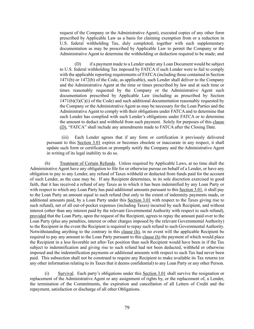 79 request of the Company or the Administrative Agent), executed copies of any other form prescribed by Applicable Law as a basis for claiming exemption from or a reduction in U.S. federal withholding Tax, duly completed, together with such supplementary documentation as may be prescribed by Applicable Law to permit the Company or the Administrative Agent to determine the withholding or deduction required to be made; and (D) if a payment made to a Lender under any Loan Document would be subject to U.S. federal withholding Tax imposed by FATCA if such Lender were to fail to comply with the applicable reporting requirements of FATCA (including those contained in Section 1471(b) or 1472(b) of the Code, as applicable), such Lender shall deliver to the Company and the Administrative Agent at the time or times prescribed by law and at such time or times reasonably requested by the Company or the Administrative Agent such documentation prescribed by Applicable Law (including as prescribed by Section 1471(b)(3)(C)(i) of the Code) and such additional documentation reasonably requested by the Company or the Administrative Agent as may be necessary for the Loan Parties and the Administrative Agent to comply with their obligations under FATCA and to determine that such Lender has complied with such Lender’s obligations under FATCA or to determine the amount to deduct and withhold from such payment. Solely for purposes of this clause (D), “FATCA” shall include any amendments made to FATCA after the Closing Date. (iii) Each Lender agrees that if any form or certification it previously delivered pursuant to this Section 3.01 expires or becomes obsolete or inaccurate in any respect, it shall update such form or certification or promptly notify the Company and the Administrative Agent in writing of its legal inability to do so. (h) Treatment of Certain Refunds. Unless required by Applicable Laws, at no time shall the Administrative Agent have any obligation to file for or otherwise pursue on behalf of a Lender, or have any obligation to pay to any Lender, any refund of Taxes withheld or deducted from funds paid for the account of such Lender, as the case may be. If any Recipient determines, in its sole discretion exercised in good faith, that it has received a refund of any Taxes as to which it has been indemnified by any Loan Party or with respect to which any Loan Party has paid additional amounts pursuant to this Section 3.01, it shall pay to the Loan Party an amount equal to such refund (but only to the extent of indemnity payments made, or additional amounts paid, by a Loan Party under this Section 3.01 with respect to the Taxes giving rise to such refund), net of all out-of-pocket expenses (including Taxes) incurred by such Recipient, and without interest (other than any interest paid by the relevant Governmental Authority with respect to such refund), provided that the Loan Party, upon the request of the Recipient, agrees to repay the amount paid over to the Loan Party (plus any penalties, interest or other charges imposed by the relevant Governmental Authority) to the Recipient in the event the Recipient is required to repay such refund to such Governmental Authority. Notwithstanding anything to the contrary in this clause (h), in no event will the applicable Recipient be required to pay any amount to the Loan Party pursuant to this clause (h) the payment of which would place the Recipient in a less favorable net after-Tax position than such Recipient would have been in if the Tax subject to indemnification and giving rise to such refund had not been deducted, withheld or otherwise imposed and the indemnification payments or additional amounts with respect to such Tax had never been paid. This subsection shall not be construed to require any Recipient to make available its Tax returns (or any other information relating to its Taxes that it deems confidential) to any Loan Party or any other Person. (i) Survival. Each party’s obligations under this Section 3.01 shall survive the resignation or replacement of the Administrative Agent or any assignment of rights by, or the replacement of, a Lender, the termination of the Commitments, the expiration and cancellation of all Letters of Credit and the repayment, satisfaction or discharge of all other Obligations.