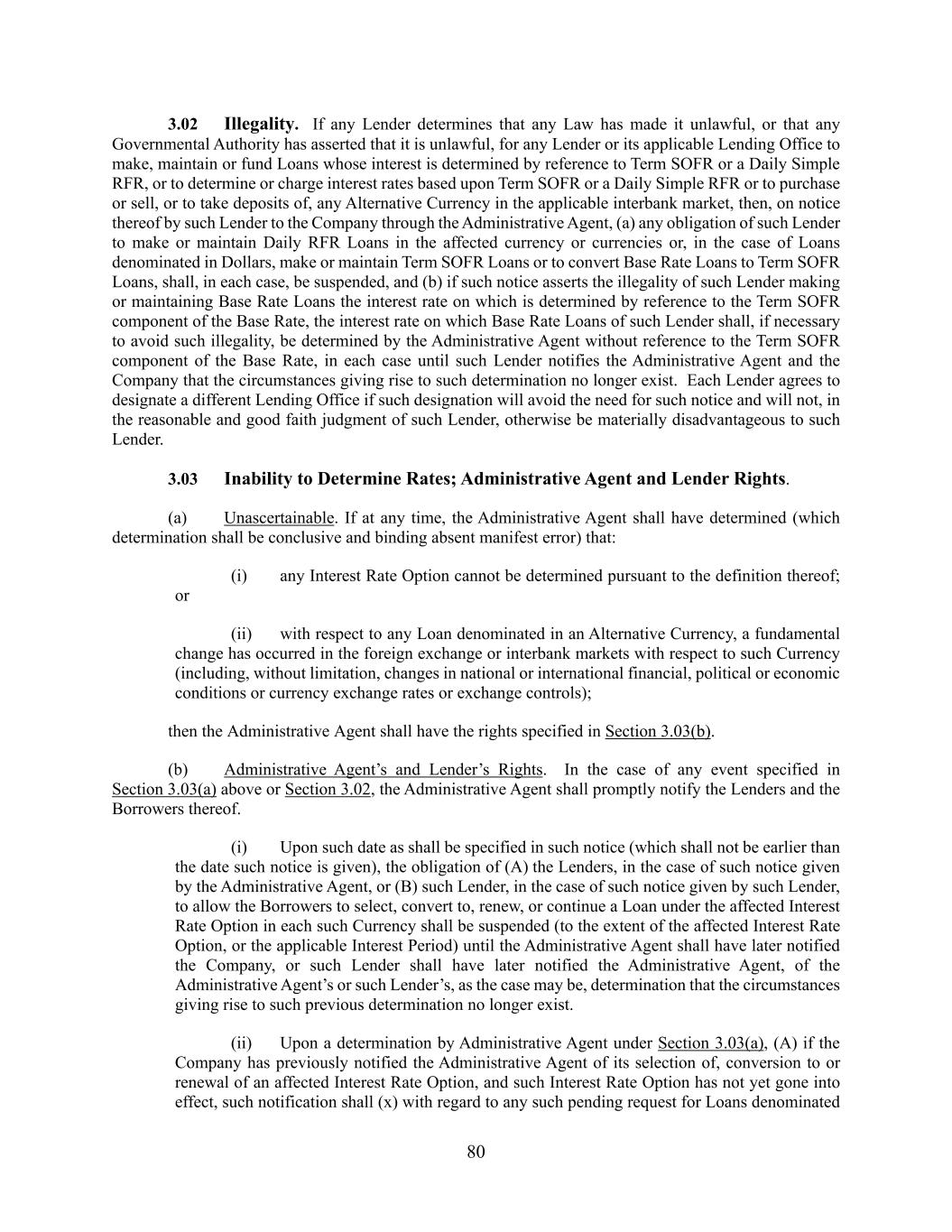 80 3.02 Illegality. If any Lender determines that any Law has made it unlawful, or that any Governmental Authority has asserted that it is unlawful, for any Lender or its applicable Lending Office to make, maintain or fund Loans whose interest is determined by reference to Term SOFR or a Daily Simple RFR, or to determine or charge interest rates based upon Term SOFR or a Daily Simple RFR or to purchase or sell, or to take deposits of, any Alternative Currency in the applicable interbank market, then, on notice thereof by such Lender to the Company through the Administrative Agent, (a) any obligation of such Lender to make or maintain Daily RFR Loans in the affected currency or currencies or, in the case of Loans denominated in Dollars, make or maintain Term SOFR Loans or to convert Base Rate Loans to Term SOFR Loans, shall, in each case, be suspended, and (b) if such notice asserts the illegality of such Lender making or maintaining Base Rate Loans the interest rate on which is determined by reference to the Term SOFR component of the Base Rate, the interest rate on which Base Rate Loans of such Lender shall, if necessary to avoid such illegality, be determined by the Administrative Agent without reference to the Term SOFR component of the Base Rate, in each case until such Lender notifies the Administrative Agent and the Company that the circumstances giving rise to such determination no longer exist. Each Lender agrees to designate a different Lending Office if such designation will avoid the need for such notice and will not, in the reasonable and good faith judgment of such Lender, otherwise be materially disadvantageous to such Lender. 3.03 Inability to Determine Rates; Administrative Agent and Lender Rights. (a) Unascertainable. If at any time, the Administrative Agent shall have determined (which determination shall be conclusive and binding absent manifest error) that: (i) any Interest Rate Option cannot be determined pursuant to the definition thereof; or (ii) with respect to any Loan denominated in an Alternative Currency, a fundamental change has occurred in the foreign exchange or interbank markets with respect to such Currency (including, without limitation, changes in national or international financial, political or economic conditions or currency exchange rates or exchange controls); then the Administrative Agent shall have the rights specified in Section 3.03(b). (b) Administrative Agent’s and Lender’s Rights. In the case of any event specified in Section 3.03(a) above or Section 3.02, the Administrative Agent shall promptly notify the Lenders and the Borrowers thereof. (i) Upon such date as shall be specified in such notice (which shall not be earlier than the date such notice is given), the obligation of (A) the Lenders, in the case of such notice given by the Administrative Agent, or (B) such Lender, in the case of such notice given by such Lender, to allow the Borrowers to select, convert to, renew, or continue a Loan under the affected Interest Rate Option in each such Currency shall be suspended (to the extent of the affected Interest Rate Option, or the applicable Interest Period) until the Administrative Agent shall have later notified the Company, or such Lender shall have later notified the Administrative Agent, of the Administrative Agent’s or such Lender’s, as the case may be, determination that the circumstances giving rise to such previous determination no longer exist. (ii) Upon a determination by Administrative Agent under Section 3.03(a), (A) if the Company has previously notified the Administrative Agent of its selection of, conversion to or renewal of an affected Interest Rate Option, and such Interest Rate Option has not yet gone into effect, such notification shall (x) with regard to any such pending request for Loans denominated