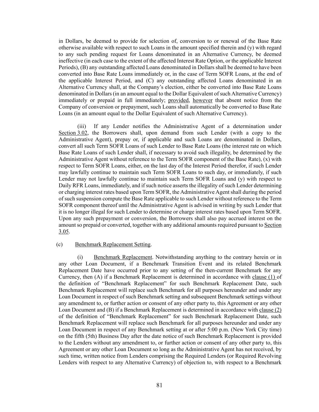 81 in Dollars, be deemed to provide for selection of, conversion to or renewal of the Base Rate otherwise available with respect to such Loans in the amount specified therein and (y) with regard to any such pending request for Loans denominated in an Alternative Currency, be deemed ineffective (in each case to the extent of the affected Interest Rate Option, or the applicable Interest Periods), (B) any outstanding affected Loans denominated in Dollars shall be deemed to have been converted into Base Rate Loans immediately or, in the case of Term SOFR Loans, at the end of the applicable Interest Period, and (C) any outstanding affected Loans denominated in an Alternative Currency shall, at the Company’s election, either be converted into Base Rate Loans denominated in Dollars (in an amount equal to the Dollar Equivalent of such Alternative Currency) immediately or prepaid in full immediately; provided, however that absent notice from the Company of conversion or prepayment, such Loans shall automatically be converted to Base Rate Loans (in an amount equal to the Dollar Equivalent of such Alternative Currency). (iii) If any Lender notifies the Administrative Agent of a determination under Section 3.02, the Borrowers shall, upon demand from such Lender (with a copy to the Administrative Agent), prepay or, if applicable and such Loans are denominated in Dollars, convert all such Term SOFR Loans of such Lender to Base Rate Loans (the interest rate on which Base Rate Loans of such Lender shall, if necessary to avoid such illegality, be determined by the Administrative Agent without reference to the Term SOFR component of the Base Rate), (x) with respect to Term SOFR Loans, either, on the last day of the Interest Period therefor, if such Lender may lawfully continue to maintain such Term SOFR Loans to such day, or immediately, if such Lender may not lawfully continue to maintain such Term SOFR Loans and (y) with respect to Daily RFR Loans, immediately, and if such notice asserts the illegality of such Lender determining or charging interest rates based upon Term SOFR, the Administrative Agent shall during the period of such suspension compute the Base Rate applicable to such Lender without reference to the Term SOFR component thereof until the Administrative Agent is advised in writing by such Lender that it is no longer illegal for such Lender to determine or charge interest rates based upon Term SOFR. Upon any such prepayment or conversion, the Borrowers shall also pay accrued interest on the amount so prepaid or converted, together with any additional amounts required pursuant to Section 3.05. (c) Benchmark Replacement Setting. (i) Benchmark Replacement. Notwithstanding anything to the contrary herein or in any other Loan Document, if a Benchmark Transition Event and its related Benchmark Replacement Date have occurred prior to any setting of the then-current Benchmark for any Currency, then (A) if a Benchmark Replacement is determined in accordance with clause (1) of the definition of “Benchmark Replacement” for such Benchmark Replacement Date, such Benchmark Replacement will replace such Benchmark for all purposes hereunder and under any Loan Document in respect of such Benchmark setting and subsequent Benchmark settings without any amendment to, or further action or consent of any other party to, this Agreement or any other Loan Document and (B) if a Benchmark Replacement is determined in accordance with clause (2) of the definition of “Benchmark Replacement” for such Benchmark Replacement Date, such Benchmark Replacement will replace such Benchmark for all purposes hereunder and under any Loan Document in respect of any Benchmark setting at or after 5:00 p.m. (New York City time) on the fifth (5th) Business Day after the date notice of such Benchmark Replacement is provided to the Lenders without any amendment to, or further action or consent of any other party to, this Agreement or any other Loan Document so long as the Administrative Agent has not received, by such time, written notice from Lenders comprising the Required Lenders (or Required Revolving Lenders with respect to any Alternative Currency) of objection to, with respect to a Benchmark