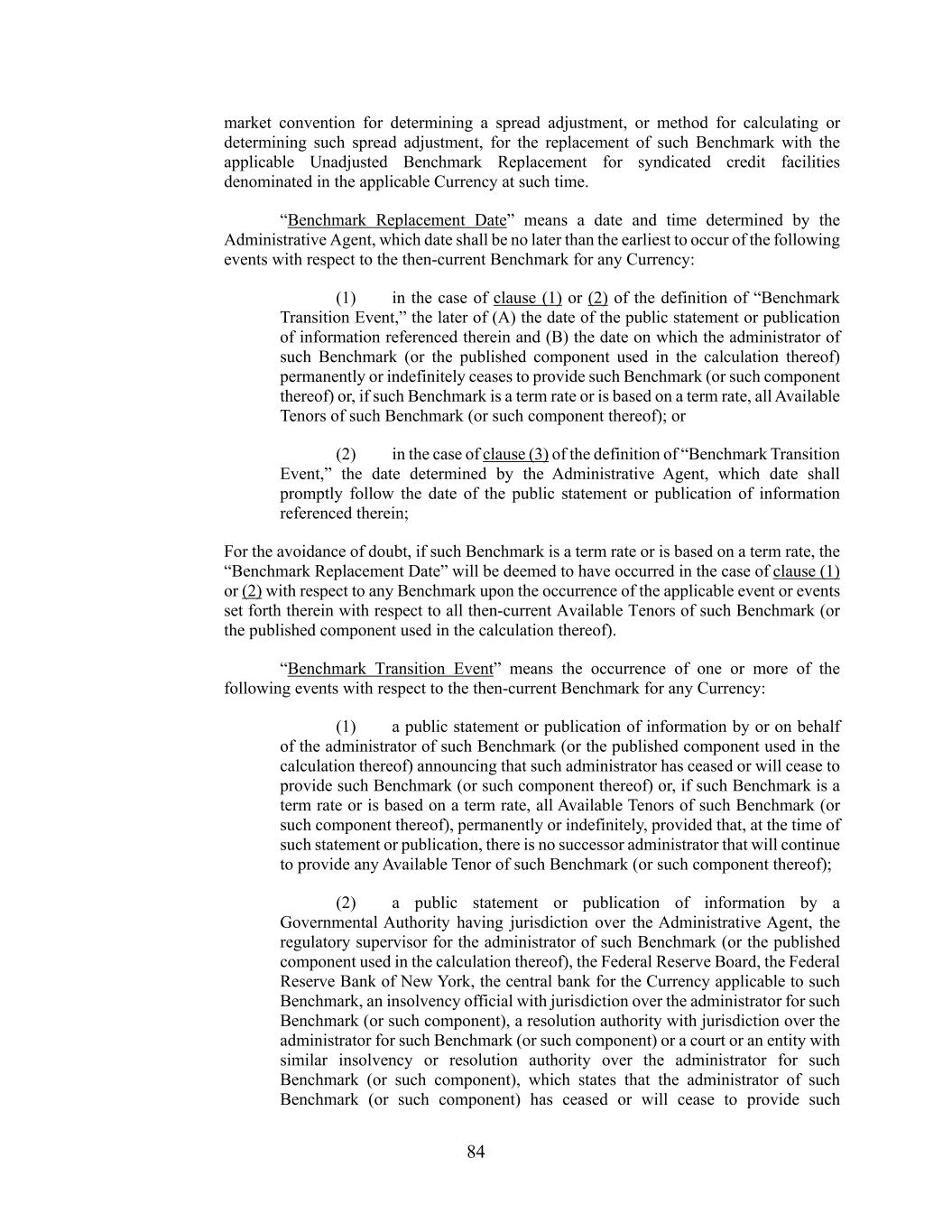 84 market convention for determining a spread adjustment, or method for calculating or determining such spread adjustment, for the replacement of such Benchmark with the applicable Unadjusted Benchmark Replacement for syndicated credit facilities denominated in the applicable Currency at such time. “Benchmark Replacement Date” means a date and time determined by the Administrative Agent, which date shall be no later than the earliest to occur of the following events with respect to the then-current Benchmark for any Currency: (1) in the case of clause (1) or (2) of the definition of “Benchmark Transition Event,” the later of (A) the date of the public statement or publication of information referenced therein and (B) the date on which the administrator of such Benchmark (or the published component used in the calculation thereof) permanently or indefinitely ceases to provide such Benchmark (or such component thereof) or, if such Benchmark is a term rate or is based on a term rate, all Available Tenors of such Benchmark (or such component thereof); or (2) in the case of clause (3) of the definition of “Benchmark Transition Event,” the date determined by the Administrative Agent, which date shall promptly follow the date of the public statement or publication of information referenced therein; For the avoidance of doubt, if such Benchmark is a term rate or is based on a term rate, the “Benchmark Replacement Date” will be deemed to have occurred in the case of clause (1) or (2) with respect to any Benchmark upon the occurrence of the applicable event or events set forth therein with respect to all then-current Available Tenors of such Benchmark (or the published component used in the calculation thereof). “Benchmark Transition Event” means the occurrence of one or more of the following events with respect to the then-current Benchmark for any Currency: (1) a public statement or publication of information by or on behalf of the administrator of such Benchmark (or the published component used in the calculation thereof) announcing that such administrator has ceased or will cease to provide such Benchmark (or such component thereof) or, if such Benchmark is a term rate or is based on a term rate, all Available Tenors of such Benchmark (or such component thereof), permanently or indefinitely, provided that, at the time of such statement or publication, there is no successor administrator that will continue to provide any Available Tenor of such Benchmark (or such component thereof); (2) a public statement or publication of information by a Governmental Authority having jurisdiction over the Administrative Agent, the regulatory supervisor for the administrator of such Benchmark (or the published component used in the calculation thereof), the Federal Reserve Board, the Federal Reserve Bank of New York, the central bank for the Currency applicable to such Benchmark, an insolvency official with jurisdiction over the administrator for such Benchmark (or such component), a resolution authority with jurisdiction over the administrator for such Benchmark (or such component) or a court or an entity with similar insolvency or resolution authority over the administrator for such Benchmark (or such component), which states that the administrator of such Benchmark (or such component) has ceased or will cease to provide such