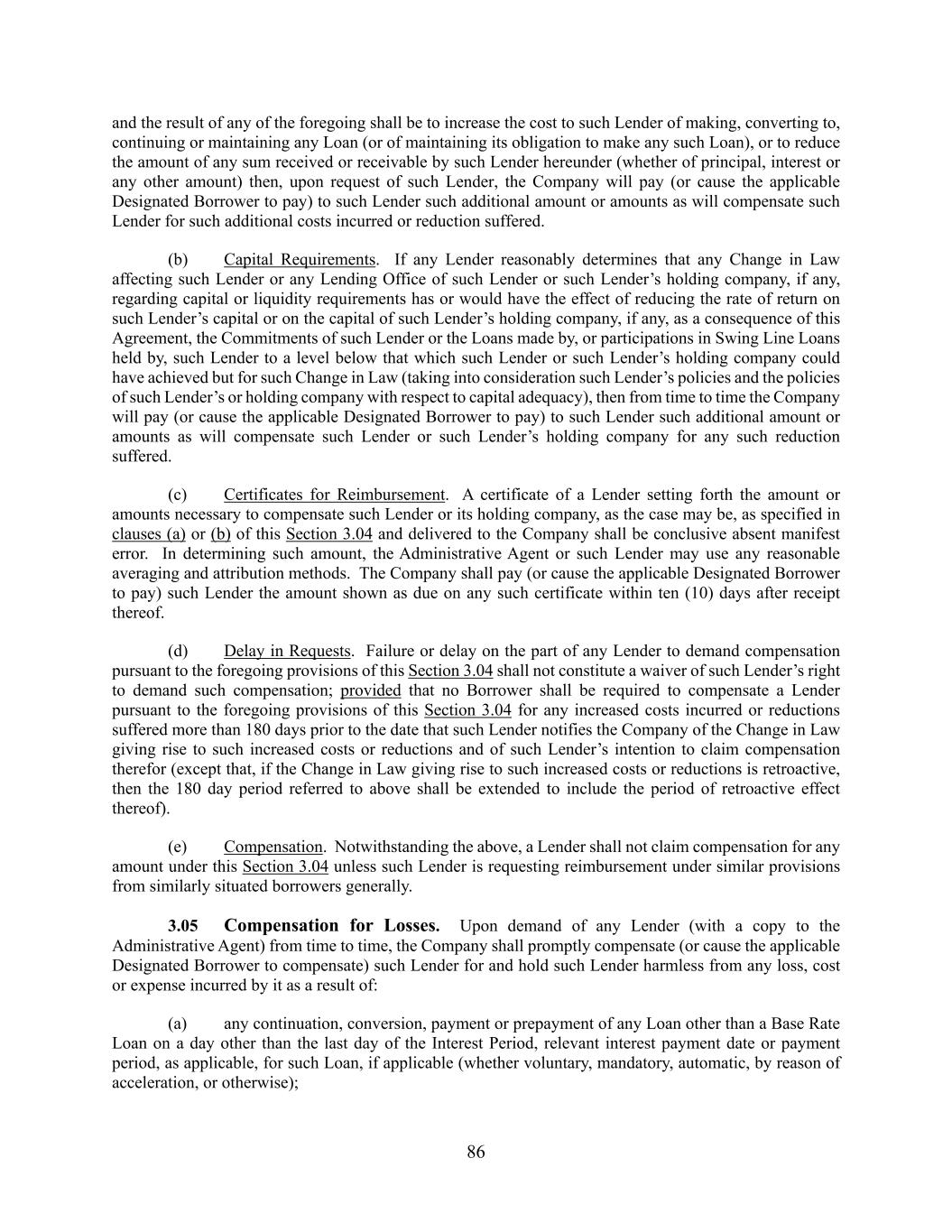 86 and the result of any of the foregoing shall be to increase the cost to such Lender of making, converting to, continuing or maintaining any Loan (or of maintaining its obligation to make any such Loan), or to reduce the amount of any sum received or receivable by such Lender hereunder (whether of principal, interest or any other amount) then, upon request of such Lender, the Company will pay (or cause the applicable Designated Borrower to pay) to such Lender such additional amount or amounts as will compensate such Lender for such additional costs incurred or reduction suffered. (b) Capital Requirements. If any Lender reasonably determines that any Change in Law affecting such Lender or any Lending Office of such Lender or such Lender’s holding company, if any, regarding capital or liquidity requirements has or would have the effect of reducing the rate of return on such Lender’s capital or on the capital of such Lender’s holding company, if any, as a consequence of this Agreement, the Commitments of such Lender or the Loans made by, or participations in Swing Line Loans held by, such Lender to a level below that which such Lender or such Lender’s holding company could have achieved but for such Change in Law (taking into consideration such Lender’s policies and the policies of such Lender’s or holding company with respect to capital adequacy), then from time to time the Company will pay (or cause the applicable Designated Borrower to pay) to such Lender such additional amount or amounts as will compensate such Lender or such Lender’s holding company for any such reduction suffered. (c) Certificates for Reimbursement. A certificate of a Lender setting forth the amount or amounts necessary to compensate such Lender or its holding company, as the case may be, as specified in clauses (a) or (b) of this Section 3.04 and delivered to the Company shall be conclusive absent manifest error. In determining such amount, the Administrative Agent or such Lender may use any reasonable averaging and attribution methods. The Company shall pay (or cause the applicable Designated Borrower to pay) such Lender the amount shown as due on any such certificate within ten (10) days after receipt thereof. (d) Delay in Requests. Failure or delay on the part of any Lender to demand compensation pursuant to the foregoing provisions of this Section 3.04 shall not constitute a waiver of such Lender’s right to demand such compensation; provided that no Borrower shall be required to compensate a Lender pursuant to the foregoing provisions of this Section 3.04 for any increased costs incurred or reductions suffered more than 180 days prior to the date that such Lender notifies the Company of the Change in Law giving rise to such increased costs or reductions and of such Lender’s intention to claim compensation therefor (except that, if the Change in Law giving rise to such increased costs or reductions is retroactive, then the 180 day period referred to above shall be extended to include the period of retroactive effect thereof). (e) Compensation. Notwithstanding the above, a Lender shall not claim compensation for any amount under this Section 3.04 unless such Lender is requesting reimbursement under similar provisions from similarly situated borrowers generally. 3.05 Compensation for Losses. Upon demand of any Lender (with a copy to the Administrative Agent) from time to time, the Company shall promptly compensate (or cause the applicable Designated Borrower to compensate) such Lender for and hold such Lender harmless from any loss, cost or expense incurred by it as a result of: (a) any continuation, conversion, payment or prepayment of any Loan other than a Base Rate Loan on a day other than the last day of the Interest Period, relevant interest payment date or payment period, as applicable, for such Loan, if applicable (whether voluntary, mandatory, automatic, by reason of acceleration, or otherwise);