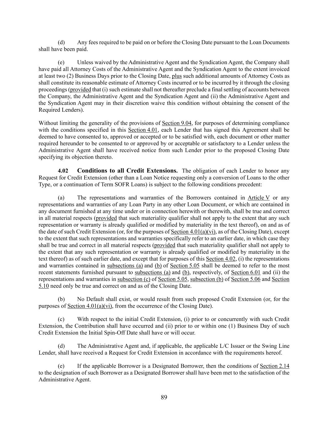 89 (d) Any fees required to be paid on or before the Closing Date pursuant to the Loan Documents shall have been paid. (e) Unless waived by the Administrative Agent and the Syndication Agent, the Company shall have paid all Attorney Costs of the Administrative Agent and the Syndication Agent to the extent invoiced at least two (2) Business Days prior to the Closing Date, plus such additional amounts of Attorney Costs as shall constitute its reasonable estimate of Attorney Costs incurred or to be incurred by it through the closing proceedings (provided that (i) such estimate shall not thereafter preclude a final settling of accounts between the Company, the Administrative Agent and the Syndication Agent and (ii) the Administrative Agent and the Syndication Agent may in their discretion waive this condition without obtaining the consent of the Required Lenders). Without limiting the generality of the provisions of Section 9.04, for purposes of determining compliance with the conditions specified in this Section 4.01, each Lender that has signed this Agreement shall be deemed to have consented to, approved or accepted or to be satisfied with, each document or other matter required hereunder to be consented to or approved by or acceptable or satisfactory to a Lender unless the Administrative Agent shall have received notice from such Lender prior to the proposed Closing Date specifying its objection thereto. 4.02 Conditions to all Credit Extensions. The obligation of each Lender to honor any Request for Credit Extension (other than a Loan Notice requesting only a conversion of Loans to the other Type, or a continuation of Term SOFR Loans) is subject to the following conditions precedent: (a) The representations and warranties of the Borrowers contained in Article V or any representations and warranties of any Loan Party in any other Loan Document, or which are contained in any document furnished at any time under or in connection herewith or therewith, shall be true and correct in all material respects (provided that such materiality qualifier shall not apply to the extent that any such representation or warranty is already qualified or modified by materiality in the text thereof), on and as of the date of such Credit Extension (or, for the purposes of Section 4.01(a)(vi), as of the Closing Date), except to the extent that such representations and warranties specifically refer to an earlier date, in which case they shall be true and correct in all material respects (provided that such materiality qualifier shall not apply to the extent that any such representation or warranty is already qualified or modified by materiality in the text thereof) as of such earlier date, and except that for purposes of this Section 4.02, (i) the representations and warranties contained in subsections (a) and (b) of Section 5.05 shall be deemed to refer to the most recent statements furnished pursuant to subsections (a) and (b), respectively, of Section 6.01 and (ii) the representations and warranties in subsection (c) of Section 5.05, subsection (b) of Section 5.06 and Section 5.10 need only be true and correct on and as of the Closing Date. (b) No Default shall exist, or would result from such proposed Credit Extension (or, for the purposes of Section 4.01(a)(vi), from the occurrence of the Closing Date). (c) With respect to the initial Credit Extension, (i) prior to or concurrently with such Credit Extension, the Contribution shall have occurred and (ii) prior to or within one (1) Business Day of such Credit Extension the Initial Spin-Off Date shall have or will occur. (d) The Administrative Agent and, if applicable, the applicable L/C Issuer or the Swing Line Lender, shall have received a Request for Credit Extension in accordance with the requirements hereof. (e) If the applicable Borrower is a Designated Borrower, then the conditions of Section 2.14 to the designation of such Borrower as a Designated Borrower shall have been met to the satisfaction of the Administrative Agent.