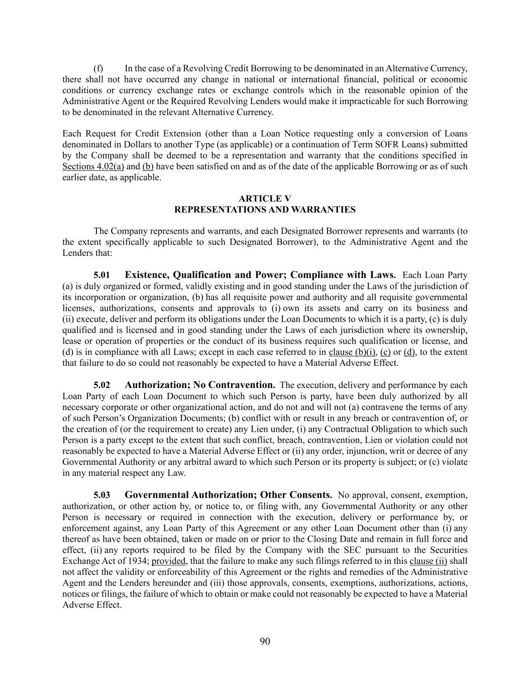 90 (f) In the case of a Revolving Credit Borrowing to be denominated in an Alternative Currency, there shall not have occurred any change in national or international financial, political or economic conditions or currency exchange rates or exchange controls which in the reasonable opinion of the Administrative Agent or the Required Revolving Lenders would make it impracticable for such Borrowing to be denominated in the relevant Alternative Currency. Each Request for Credit Extension (other than a Loan Notice requesting only a conversion of Loans denominated in Dollars to another Type (as applicable) or a continuation of Term SOFR Loans) submitted by the Company shall be deemed to be a representation and warranty that the conditions specified in Sections 4.02(a) and (b) have been satisfied on and as of the date of the applicable Borrowing or as of such earlier date, as applicable. ARTICLE V REPRESENTATIONS AND WARRANTIES The Company represents and warrants, and each Designated Borrower represents and warrants (to the extent specifically applicable to such Designated Borrower), to the Administrative Agent and the Lenders that: 5.01 Existence, Qualification and Power; Compliance with Laws. Each Loan Party (a) is duly organized or formed, validly existing and in good standing under the Laws of the jurisdiction of its incorporation or organization, (b) has all requisite power and authority and all requisite governmental licenses, authorizations, consents and approvals to (i) own its assets and carry on its business and (ii) execute, deliver and perform its obligations under the Loan Documents to which it is a party, (c) is duly qualified and is licensed and in good standing under the Laws of each jurisdiction where its ownership, lease or operation of properties or the conduct of its business requires such qualification or license, and (d) is in compliance with all Laws; except in each case referred to in clause (b)(i), (c) or (d), to the extent that failure to do so could not reasonably be expected to have a Material Adverse Effect. 5.02 Authorization; No Contravention. The execution, delivery and performance by each Loan Party of each Loan Document to which such Person is party, have been duly authorized by all necessary corporate or other organizational action, and do not and will not (a) contravene the terms of any of such Person’s Organization Documents; (b) conflict with or result in any breach or contravention of, or the creation of (or the requirement to create) any Lien under, (i) any Contractual Obligation to which such Person is a party except to the extent that such conflict, breach, contravention, Lien or violation could not reasonably be expected to have a Material Adverse Effect or (ii) any order, injunction, writ or decree of any Governmental Authority or any arbitral award to which such Person or its property is subject; or (c) violate in any material respect any Law. 5.03 Governmental Authorization; Other Consents. No approval, consent, exemption, authorization, or other action by, or notice to, or filing with, any Governmental Authority or any other Person is necessary or required in connection with the execution, delivery or performance by, or enforcement against, any Loan Party of this Agreement or any other Loan Document other than (i) any thereof as have been obtained, taken or made on or prior to the Closing Date and remain in full force and effect, (ii) any reports required to be filed by the Company with the SEC pursuant to the Securities Exchange Act of 1934; provided, that the failure to make any such filings referred to in this clause (ii) shall not affect the validity or enforceability of this Agreement or the rights and remedies of the Administrative Agent and the Lenders hereunder and (iii) those approvals, consents, exemptions, authorizations, actions, notices or filings, the failure of which to obtain or make could not reasonably be expected to have a Material Adverse Effect.