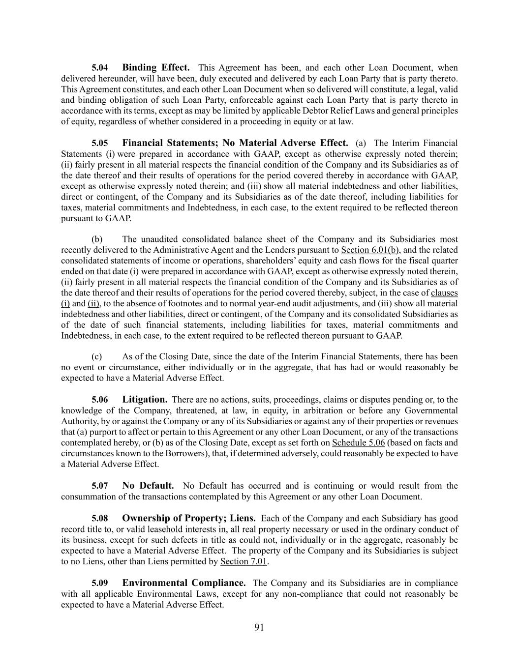 91 5.04 Binding Effect. This Agreement has been, and each other Loan Document, when delivered hereunder, will have been, duly executed and delivered by each Loan Party that is party thereto. This Agreement constitutes, and each other Loan Document when so delivered will constitute, a legal, valid and binding obligation of such Loan Party, enforceable against each Loan Party that is party thereto in accordance with its terms, except as may be limited by applicable Debtor Relief Laws and general principles of equity, regardless of whether considered in a proceeding in equity or at law. 5.05 Financial Statements; No Material Adverse Effect. (a) The Interim Financial Statements (i) were prepared in accordance with GAAP, except as otherwise expressly noted therein; (ii) fairly present in all material respects the financial condition of the Company and its Subsidiaries as of the date thereof and their results of operations for the period covered thereby in accordance with GAAP, except as otherwise expressly noted therein; and (iii) show all material indebtedness and other liabilities, direct or contingent, of the Company and its Subsidiaries as of the date thereof, including liabilities for taxes, material commitments and Indebtedness, in each case, to the extent required to be reflected thereon pursuant to GAAP. (b) The unaudited consolidated balance sheet of the Company and its Subsidiaries most recently delivered to the Administrative Agent and the Lenders pursuant to Section 6.01(b), and the related consolidated statements of income or operations, shareholders’ equity and cash flows for the fiscal quarter ended on that date (i) were prepared in accordance with GAAP, except as otherwise expressly noted therein, (ii) fairly present in all material respects the financial condition of the Company and its Subsidiaries as of the date thereof and their results of operations for the period covered thereby, subject, in the case of clauses (i) and (ii), to the absence of footnotes and to normal year-end audit adjustments, and (iii) show all material indebtedness and other liabilities, direct or contingent, of the Company and its consolidated Subsidiaries as of the date of such financial statements, including liabilities for taxes, material commitments and Indebtedness, in each case, to the extent required to be reflected thereon pursuant to GAAP. (c) As of the Closing Date, since the date of the Interim Financial Statements, there has been no event or circumstance, either individually or in the aggregate, that has had or would reasonably be expected to have a Material Adverse Effect. 5.06 Litigation. There are no actions, suits, proceedings, claims or disputes pending or, to the knowledge of the Company, threatened, at law, in equity, in arbitration or before any Governmental Authority, by or against the Company or any of its Subsidiaries or against any of their properties or revenues that (a) purport to affect or pertain to this Agreement or any other Loan Document, or any of the transactions contemplated hereby, or (b) as of the Closing Date, except as set forth on Schedule 5.06 (based on facts and circumstances known to the Borrowers), that, if determined adversely, could reasonably be expected to have a Material Adverse Effect. 5.07 No Default. No Default has occurred and is continuing or would result from the consummation of the transactions contemplated by this Agreement or any other Loan Document. 5.08 Ownership of Property; Liens. Each of the Company and each Subsidiary has good record title to, or valid leasehold interests in, all real property necessary or used in the ordinary conduct of its business, except for such defects in title as could not, individually or in the aggregate, reasonably be expected to have a Material Adverse Effect. The property of the Company and its Subsidiaries is subject to no Liens, other than Liens permitted by Section 7.01. 5.09 Environmental Compliance. The Company and its Subsidiaries are in compliance with all applicable Environmental Laws, except for any non-compliance that could not reasonably be expected to have a Material Adverse Effect.