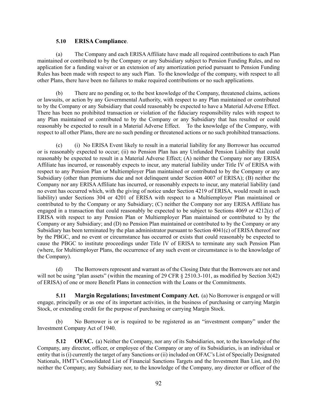 92 5.10 ERISA Compliance. (a) The Company and each ERISA Affiliate have made all required contributions to each Plan maintained or contributed to by the Company or any Subsidiary subject to Pension Funding Rules, and no application for a funding waiver or an extension of any amortization period pursuant to Pension Funding Rules has been made with respect to any such Plan. To the knowledge of the company, with respect to all other Plans, there have been no failures to make required contributions or no such applications. (b) There are no pending or, to the best knowledge of the Company, threatened claims, actions or lawsuits, or action by any Governmental Authority, with respect to any Plan maintained or contributed to by the Company or any Subsidiary that could reasonably be expected to have a Material Adverse Effect. There has been no prohibited transaction or violation of the fiduciary responsibility rules with respect to any Plan maintained or contributed to by the Company or any Subsidiary that has resulted or could reasonably be expected to result in a Material Adverse Effect. To the knowledge of the Company, with respect to all other Plans, there are no such pending or threatened actions or no such prohibited transactions. (c) (i) No ERISA Event likely to result in a material liability for any Borrower has occurred or is reasonably expected to occur; (ii) no Pension Plan has any Unfunded Pension Liability that could reasonably be expected to result in a Material Adverse Effect; (A) neither the Company nor any ERISA Affiliate has incurred, or reasonably expects to incur, any material liability under Title IV of ERISA with respect to any Pension Plan or Multiemployer Plan maintained or contributed to by the Company or any Subsidiary (other than premiums due and not delinquent under Section 4007 of ERISA); (B) neither the Company nor any ERISA Affiliate has incurred, or reasonably expects to incur, any material liability (and no event has occurred which, with the giving of notice under Section 4219 of ERISA, would result in such liability) under Sections 304 or 4201 of ERISA with respect to a Multiemployer Plan maintained or contributed to by the Company or any Subsidiary; (C) neither the Company nor any ERISA Affiliate has engaged in a transaction that could reasonably be expected to be subject to Sections 4069 or 4212(c) of ERISA with respect to any Pension Plan or Multiemployer Plan maintained or contributed to by the Company or any Subsidiary; and (D) no Pension Plan maintained or contributed to by the Company or any Subsidiary has been terminated by the plan administrator pursuant to Section 4041(c) of ERISA thereof nor by the PBGC, and no event or circumstance has occurred or exists that could reasonably be expected to cause the PBGC to institute proceedings under Title IV of ERISA to terminate any such Pension Plan (where, for Multiemployer Plans, the occurrence of any such event or circumstance is to the knowledge of the Company). (d) The Borrowers represent and warrant as of the Closing Date that the Borrowers are not and will not be using “plan assets” (within the meaning of 29 CFR § 2510.3-101, as modified by Section 3(42) of ERISA) of one or more Benefit Plans in connection with the Loans or the Commitments. 5.11 Margin Regulations; Investment Company Act. (a) No Borrower is engaged or will engage, principally or as one of its important activities, in the business of purchasing or carrying Margin Stock, or extending credit for the purpose of purchasing or carrying Margin Stock. (b) No Borrower is or is required to be registered as an “investment company” under the Investment Company Act of 1940. 5.12 OFAC. (a) Neither the Company, nor any of its Subsidiaries, nor, to the knowledge of the Company, any director, officer, or employee of the Company or any of its Subsidiaries, is an individual or entity that is (i) currently the target of any Sanctions or (ii) included on OFAC’s List of Specially Designated Nationals, HMT’s Consolidated List of Financial Sanctions Targets and the Investment Ban List, and (b) neither the Company, any Subsidiary nor, to the knowledge of the Company, any director or officer of the