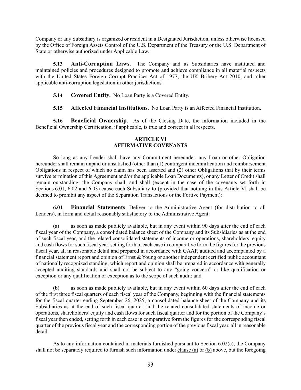 93 Company or any Subsidiary is organized or resident in a Designated Jurisdiction, unless otherwise licensed by the Office of Foreign Assets Control of the U.S. Department of the Treasury or the U.S. Department of State or otherwise authorized under Applicable Law. 5.13 Anti-Corruption Laws. The Company and its Subsidiaries have instituted and maintained policies and procedures designed to promote and achieve compliance in all material respects with the United States Foreign Corrupt Practices Act of 1977, the UK Bribery Act 2010, and other applicable anti-corruption legislation in other jurisdictions. 5.14 Covered Entity. No Loan Party is a Covered Entity. 5.15 Affected Financial Institutions. No Loan Party is an Affected Financial Institution. 5.16 Beneficial Ownership. As of the Closing Date, the information included in the Beneficial Ownership Certification, if applicable, is true and correct in all respects. ARTICLE VI AFFIRMATIVE COVENANTS So long as any Lender shall have any Commitment hereunder, any Loan or other Obligation hereunder shall remain unpaid or unsatisfied (other than (1) contingent indemnification and reimbursement Obligations in respect of which no claim has been asserted and (2) other Obligations that by their terms survive termination of this Agreement and/or the applicable Loan Documents), or any Letter of Credit shall remain outstanding, the Company shall, and shall (except in the case of the covenants set forth in Sections 6.01, 6.02 and 6.03) cause each Subsidiary to (provided that nothing in this Article VI shall be deemed to prohibit any aspect of the Separation Transactions or the Fortive Payment): 6.01 Financial Statements. Deliver to the Administrative Agent (for distribution to all Lenders), in form and detail reasonably satisfactory to the Administrative Agent: (a) as soon as made publicly available, but in any event within 90 days after the end of each fiscal year of the Company, a consolidated balance sheet of the Company and its Subsidiaries as at the end of such fiscal year, and the related consolidated statements of income or operations, shareholders’ equity and cash flows for such fiscal year, setting forth in each case in comparative form the figures for the previous fiscal year, all in reasonable detail and prepared in accordance with GAAP, audited and accompanied by a financial statement report and opinion of Ernst & Young or another independent certified public accountant of nationally recognized standing, which report and opinion shall be prepared in accordance with generally accepted auditing standards and shall not be subject to any “going concern” or like qualification or exception or any qualification or exception as to the scope of such audit; and (b) as soon as made publicly available, but in any event within 60 days after the end of each of the first three fiscal quarters of each fiscal year of the Company, beginning with the financial statements for the fiscal quarter ending September 26, 2025, a consolidated balance sheet of the Company and its Subsidiaries as at the end of such fiscal quarter, and the related consolidated statements of income or operations, shareholders’ equity and cash flows for such fiscal quarter and for the portion of the Company’s fiscal year then ended, setting forth in each case in comparative form the figures for the corresponding fiscal quarter of the previous fiscal year and the corresponding portion of the previous fiscal year, all in reasonable detail. As to any information contained in materials furnished pursuant to Section 6.02(c), the Company shall not be separately required to furnish such information under clause (a) or (b) above, but the foregoing