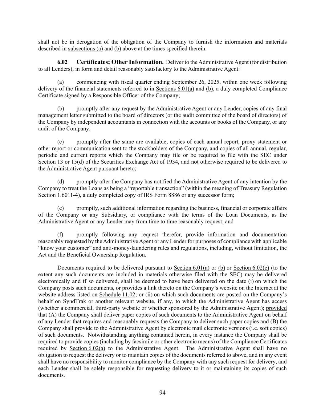 94 shall not be in derogation of the obligation of the Company to furnish the information and materials described in subsections (a) and (b) above at the times specified therein. 6.02 Certificates; Other Information. Deliver to the Administrative Agent (for distribution to all Lenders), in form and detail reasonably satisfactory to the Administrative Agent: (a) commencing with fiscal quarter ending September 26, 2025, within one week following delivery of the financial statements referred to in Sections 6.01(a) and (b), a duly completed Compliance Certificate signed by a Responsible Officer of the Company; (b) promptly after any request by the Administrative Agent or any Lender, copies of any final management letter submitted to the board of directors (or the audit committee of the board of directors) of the Company by independent accountants in connection with the accounts or books of the Company, or any audit of the Company; (c) promptly after the same are available, copies of each annual report, proxy statement or other report or communication sent to the stockholders of the Company, and copies of all annual, regular, periodic and current reports which the Company may file or be required to file with the SEC under Section 13 or 15(d) of the Securities Exchange Act of 1934, and not otherwise required to be delivered to the Administrative Agent pursuant hereto; (d) promptly after the Company has notified the Administrative Agent of any intention by the Company to treat the Loans as being a “reportable transaction” (within the meaning of Treasury Regulation Section 1.6011-4), a duly completed copy of IRS Form 8886 or any successor form; (e) promptly, such additional information regarding the business, financial or corporate affairs of the Company or any Subsidiary, or compliance with the terms of the Loan Documents, as the Administrative Agent or any Lender may from time to time reasonably request; and (f) promptly following any request therefor, provide information and documentation reasonably requested by the Administrative Agent or any Lender for purposes of compliance with applicable “know your customer” and anti-money-laundering rules and regulations, including, without limitation, the Act and the Beneficial Ownership Regulation. Documents required to be delivered pursuant to Section 6.01(a) or (b) or Section 6.02(c) (to the extent any such documents are included in materials otherwise filed with the SEC) may be delivered electronically and if so delivered, shall be deemed to have been delivered on the date (i) on which the Company posts such documents, or provides a link thereto on the Company’s website on the Internet at the website address listed on Schedule 11.02; or (ii) on which such documents are posted on the Company’s behalf on SyndTrak or another relevant website, if any, to which the Administrative Agent has access (whether a commercial, third-party website or whether sponsored by the Administrative Agent); provided that (A) the Company shall deliver paper copies of such documents to the Administrative Agent on behalf of any Lender that requires and reasonably requests the Company to deliver such paper copies and (B) the Company shall provide to the Administrative Agent by electronic mail electronic versions (i.e. soft copies) of such documents. Notwithstanding anything contained herein, in every instance the Company shall be required to provide copies (including by facsimile or other electronic means) of the Compliance Certificates required by Section 6.02(a) to the Administrative Agent. The Administrative Agent shall have no obligation to request the delivery or to maintain copies of the documents referred to above, and in any event shall have no responsibility to monitor compliance by the Company with any such request for delivery, and each Lender shall be solely responsible for requesting delivery to it or maintaining its copies of such documents.