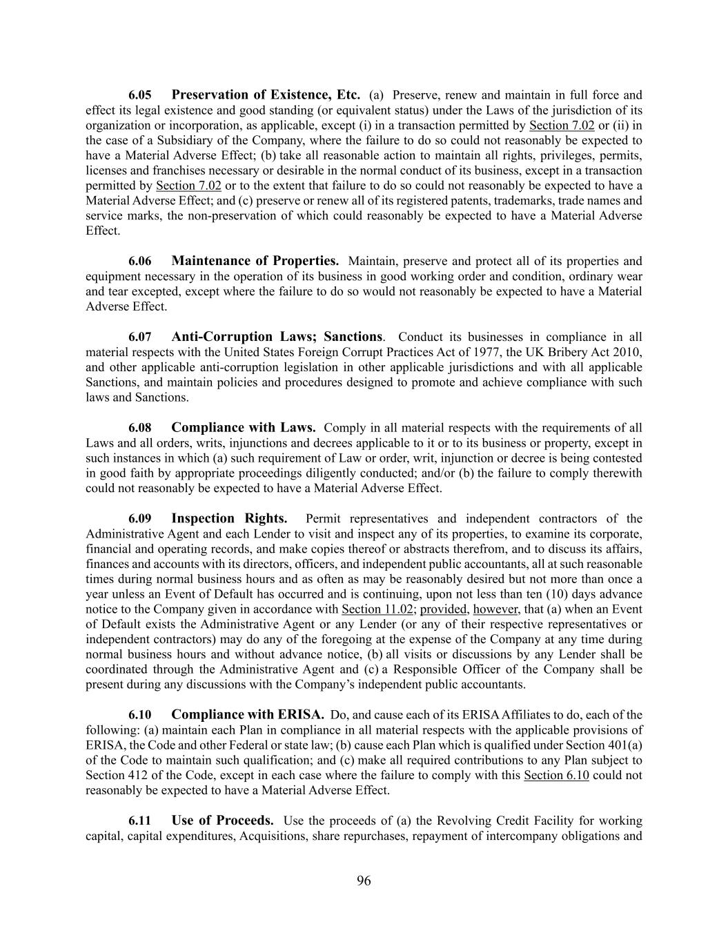 96 6.05 Preservation of Existence, Etc. (a) Preserve, renew and maintain in full force and effect its legal existence and good standing (or equivalent status) under the Laws of the jurisdiction of its organization or incorporation, as applicable, except (i) in a transaction permitted by Section 7.02 or (ii) in the case of a Subsidiary of the Company, where the failure to do so could not reasonably be expected to have a Material Adverse Effect; (b) take all reasonable action to maintain all rights, privileges, permits, licenses and franchises necessary or desirable in the normal conduct of its business, except in a transaction permitted by Section 7.02 or to the extent that failure to do so could not reasonably be expected to have a Material Adverse Effect; and (c) preserve or renew all of its registered patents, trademarks, trade names and service marks, the non-preservation of which could reasonably be expected to have a Material Adverse Effect. 6.06 Maintenance of Properties. Maintain, preserve and protect all of its properties and equipment necessary in the operation of its business in good working order and condition, ordinary wear and tear excepted, except where the failure to do so would not reasonably be expected to have a Material Adverse Effect. 6.07 Anti-Corruption Laws; Sanctions. Conduct its businesses in compliance in all material respects with the United States Foreign Corrupt Practices Act of 1977, the UK Bribery Act 2010, and other applicable anti-corruption legislation in other applicable jurisdictions and with all applicable Sanctions, and maintain policies and procedures designed to promote and achieve compliance with such laws and Sanctions. 6.08 Compliance with Laws. Comply in all material respects with the requirements of all Laws and all orders, writs, injunctions and decrees applicable to it or to its business or property, except in such instances in which (a) such requirement of Law or order, writ, injunction or decree is being contested in good faith by appropriate proceedings diligently conducted; and/or (b) the failure to comply therewith could not reasonably be expected to have a Material Adverse Effect. 6.09 Inspection Rights. Permit representatives and independent contractors of the Administrative Agent and each Lender to visit and inspect any of its properties, to examine its corporate, financial and operating records, and make copies thereof or abstracts therefrom, and to discuss its affairs, finances and accounts with its directors, officers, and independent public accountants, all at such reasonable times during normal business hours and as often as may be reasonably desired but not more than once a year unless an Event of Default has occurred and is continuing, upon not less than ten (10) days advance notice to the Company given in accordance with Section 11.02; provided, however, that (a) when an Event of Default exists the Administrative Agent or any Lender (or any of their respective representatives or independent contractors) may do any of the foregoing at the expense of the Company at any time during normal business hours and without advance notice, (b) all visits or discussions by any Lender shall be coordinated through the Administrative Agent and (c) a Responsible Officer of the Company shall be present during any discussions with the Company’s independent public accountants. 6.10 Compliance with ERISA. Do, and cause each of its ERISA Affiliates to do, each of the following: (a) maintain each Plan in compliance in all material respects with the applicable provisions of ERISA, the Code and other Federal or state law; (b) cause each Plan which is qualified under Section 401(a) of the Code to maintain such qualification; and (c) make all required contributions to any Plan subject to Section 412 of the Code, except in each case where the failure to comply with this Section 6.10 could not reasonably be expected to have a Material Adverse Effect. 6.11 Use of Proceeds. Use the proceeds of (a) the Revolving Credit Facility for working capital, capital expenditures, Acquisitions, share repurchases, repayment of intercompany obligations and