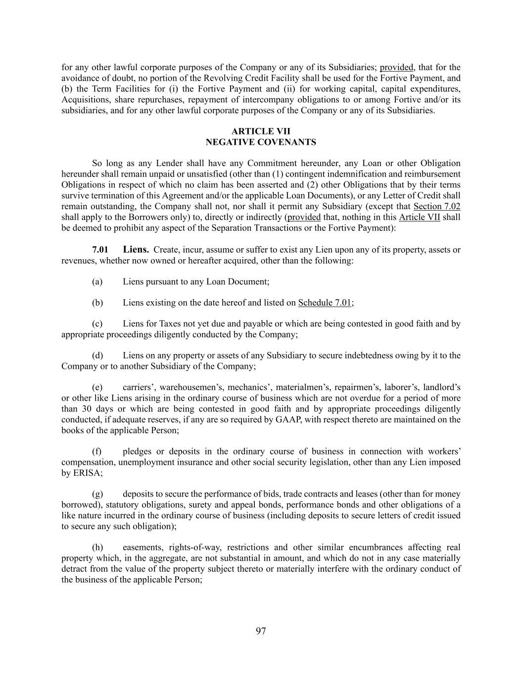 97 for any other lawful corporate purposes of the Company or any of its Subsidiaries; provided, that for the avoidance of doubt, no portion of the Revolving Credit Facility shall be used for the Fortive Payment, and (b) the Term Facilities for (i) the Fortive Payment and (ii) for working capital, capital expenditures, Acquisitions, share repurchases, repayment of intercompany obligations to or among Fortive and/or its subsidiaries, and for any other lawful corporate purposes of the Company or any of its Subsidiaries. ARTICLE VII NEGATIVE COVENANTS So long as any Lender shall have any Commitment hereunder, any Loan or other Obligation hereunder shall remain unpaid or unsatisfied (other than (1) contingent indemnification and reimbursement Obligations in respect of which no claim has been asserted and (2) other Obligations that by their terms survive termination of this Agreement and/or the applicable Loan Documents), or any Letter of Credit shall remain outstanding, the Company shall not, nor shall it permit any Subsidiary (except that Section 7.02 shall apply to the Borrowers only) to, directly or indirectly (provided that, nothing in this Article VII shall be deemed to prohibit any aspect of the Separation Transactions or the Fortive Payment): 7.01 Liens. Create, incur, assume or suffer to exist any Lien upon any of its property, assets or revenues, whether now owned or hereafter acquired, other than the following: (a) Liens pursuant to any Loan Document; (b) Liens existing on the date hereof and listed on Schedule 7.01; (c) Liens for Taxes not yet due and payable or which are being contested in good faith and by appropriate proceedings diligently conducted by the Company; (d) Liens on any property or assets of any Subsidiary to secure indebtedness owing by it to the Company or to another Subsidiary of the Company; (e) carriers’, warehousemen’s, mechanics’, materialmen’s, repairmen’s, laborer’s, landlord’s or other like Liens arising in the ordinary course of business which are not overdue for a period of more than 30 days or which are being contested in good faith and by appropriate proceedings diligently conducted, if adequate reserves, if any are so required by GAAP, with respect thereto are maintained on the books of the applicable Person; (f) pledges or deposits in the ordinary course of business in connection with workers’ compensation, unemployment insurance and other social security legislation, other than any Lien imposed by ERISA; (g) deposits to secure the performance of bids, trade contracts and leases (other than for money borrowed), statutory obligations, surety and appeal bonds, performance bonds and other obligations of a like nature incurred in the ordinary course of business (including deposits to secure letters of credit issued to secure any such obligation); (h) easements, rights-of-way, restrictions and other similar encumbrances affecting real property which, in the aggregate, are not substantial in amount, and which do not in any case materially detract from the value of the property subject thereto or materially interfere with the ordinary conduct of the business of the applicable Person;