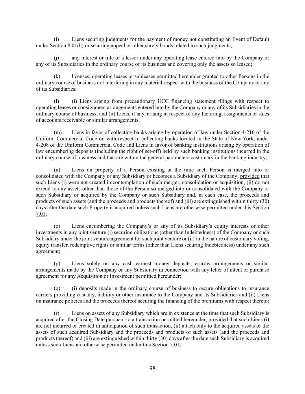 98 (i) Liens securing judgments for the payment of money not constituting an Event of Default under Section 8.01(h) or securing appeal or other surety bonds related to such judgments; (j) any interest or title of a lessor under any operating lease entered into by the Company or any of its Subsidiaries in the ordinary course of its business and covering only the assets so leased; (k) licenses, operating leases or subleases permitted hereunder granted to other Persons in the ordinary course of business not interfering in any material respect with the business of the Company or any of its Subsidiaries; (l) (i) Liens arising from precautionary UCC financing statement filings with respect to operating leases or consignment arrangements entered into by the Company or any of its Subsidiaries in the ordinary course of business, and (ii) Liens, if any, arising in respect of any factoring, assignments or sales of accounts receivable or similar arrangements; (m) Liens in favor of collecting banks arising by operation of law under Section 4-210 of the Uniform Commercial Code or, with respect to collecting banks located in the State of New York, under 4-208 of the Uniform Commercial Code and Liens in favor of banking institutions arising by operation of law encumbering deposits (including the right of set-off) held by such banking institutions incurred in the ordinary course of business and that are within the general parameters customary in the banking industry; (n) Liens on property of a Person existing at the time such Person is merged into or consolidated with the Company or any Subsidiary or becomes a Subsidiary of the Company; provided that such Liens (i) were not created in contemplation of such merger, consolidation or acquisition, (ii) do not extend to any assets other than those of the Person so merged into or consolidated with the Company or such Subsidiary or acquired by the Company or such Subsidiary and, in each case, the proceeds and products of such assets (and the proceeds and products thereof) and (iii) are extinguished within thirty (30) days after the date such Property is acquired unless such Liens are otherwise permitted under this Section 7.01; (o) Liens encumbering the Company’s or any of its Subsidiary’s equity interests or other investments in any joint venture (i) securing obligations (other than Indebtedness) of the Company or such Subsidiary under the joint venture agreement for such joint venture or (ii) in the nature of customary voting, equity transfer, redemptive rights or similar terms (other than Liens securing Indebtedness) under any such agreement; (p) Liens solely on any cash earnest money deposits, escrow arrangements or similar arrangements made by the Company or any Subsidiary in connection with any letter of intent or purchase agreement for any Acquisition or Investment permitted hereunder; (q) (i) deposits made in the ordinary course of business to secure obligations to insurance carriers providing casualty, liability or other insurance to the Company and its Subsidiaries and (ii) Liens on insurance policies and the proceeds thereof securing the financing of the premiums with respect thereto; (r) Liens on assets of any Subsidiary which are in existence at the time that such Subsidiary is acquired after the Closing Date pursuant to a transaction permitted hereunder; provided that such Liens (i) are not incurred or created in anticipation of such transaction, (ii) attach only to the acquired assets or the assets of such acquired Subsidiary and the proceeds and products of such assets (and the proceeds and products thereof) and (iii) are extinguished within thirty (30) days after the date such Subsidiary is acquired unless such Liens are otherwise permitted under this Section 7.01;