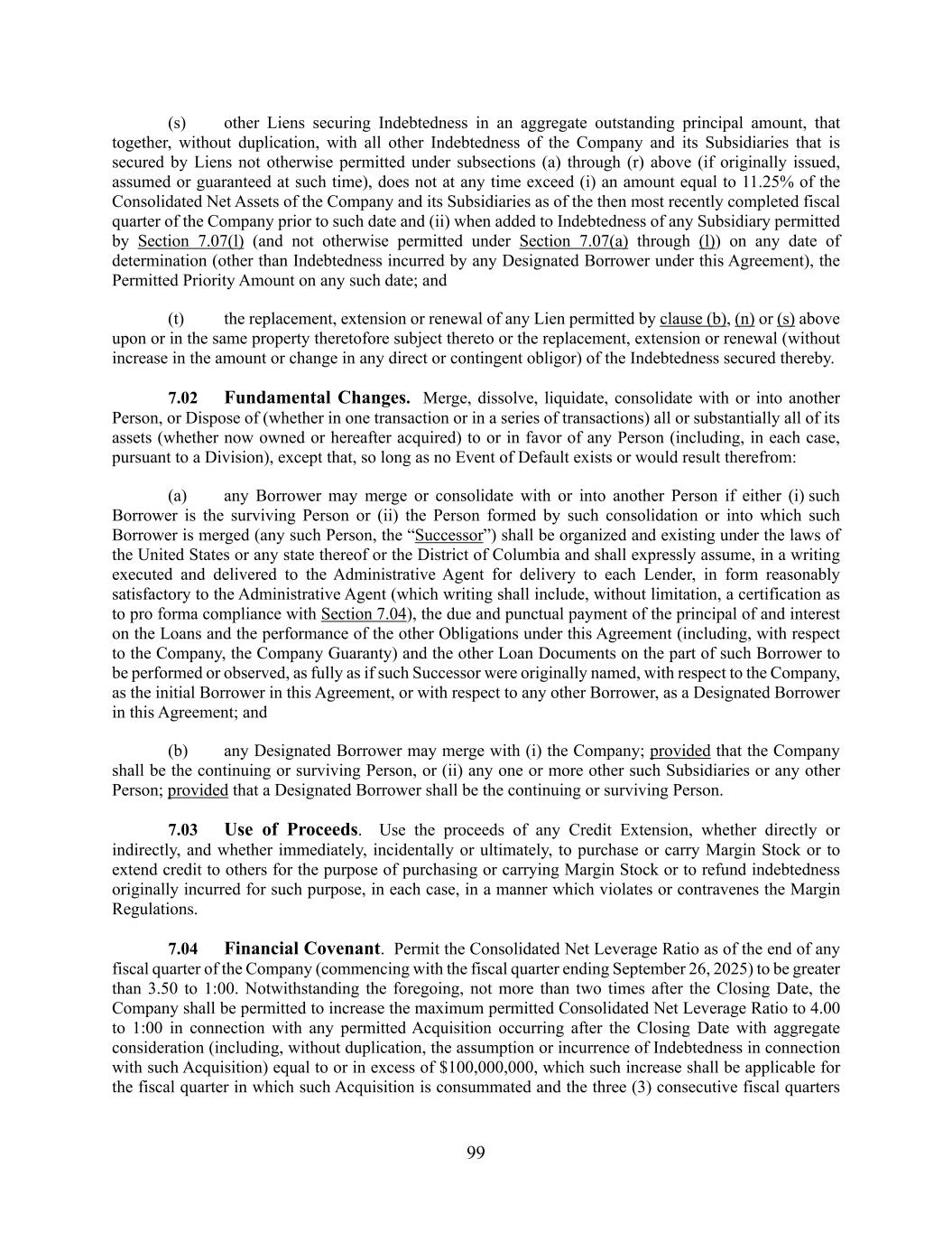 99 (s) other Liens securing Indebtedness in an aggregate outstanding principal amount, that together, without duplication, with all other Indebtedness of the Company and its Subsidiaries that is secured by Liens not otherwise permitted under subsections (a) through (r) above (if originally issued, assumed or guaranteed at such time), does not at any time exceed (i) an amount equal to 11.25% of the Consolidated Net Assets of the Company and its Subsidiaries as of the then most recently completed fiscal quarter of the Company prior to such date and (ii) when added to Indebtedness of any Subsidiary permitted by Section 7.07(l) (and not otherwise permitted under Section 7.07(a) through (l)) on any date of determination (other than Indebtedness incurred by any Designated Borrower under this Agreement), the Permitted Priority Amount on any such date; and (t) the replacement, extension or renewal of any Lien permitted by clause (b), (n) or (s) above upon or in the same property theretofore subject thereto or the replacement, extension or renewal (without increase in the amount or change in any direct or contingent obligor) of the Indebtedness secured thereby. 7.02 Fundamental Changes. Merge, dissolve, liquidate, consolidate with or into another Person, or Dispose of (whether in one transaction or in a series of transactions) all or substantially all of its assets (whether now owned or hereafter acquired) to or in favor of any Person (including, in each case, pursuant to a Division), except that, so long as no Event of Default exists or would result therefrom: (a) any Borrower may merge or consolidate with or into another Person if either (i) such Borrower is the surviving Person or (ii) the Person formed by such consolidation or into which such Borrower is merged (any such Person, the “Successor”) shall be organized and existing under the laws of the United States or any state thereof or the District of Columbia and shall expressly assume, in a writing executed and delivered to the Administrative Agent for delivery to each Lender, in form reasonably satisfactory to the Administrative Agent (which writing shall include, without limitation, a certification as to pro forma compliance with Section 7.04), the due and punctual payment of the principal of and interest on the Loans and the performance of the other Obligations under this Agreement (including, with respect to the Company, the Company Guaranty) and the other Loan Documents on the part of such Borrower to be performed or observed, as fully as if such Successor were originally named, with respect to the Company, as the initial Borrower in this Agreement, or with respect to any other Borrower, as a Designated Borrower in this Agreement; and (b) any Designated Borrower may merge with (i) the Company; provided that the Company shall be the continuing or surviving Person, or (ii) any one or more other such Subsidiaries or any other Person; provided that a Designated Borrower shall be the continuing or surviving Person. 7.03 Use of Proceeds. Use the proceeds of any Credit Extension, whether directly or indirectly, and whether immediately, incidentally or ultimately, to purchase or carry Margin Stock or to extend credit to others for the purpose of purchasing or carrying Margin Stock or to refund indebtedness originally incurred for such purpose, in each case, in a manner which violates or contravenes the Margin Regulations. 7.04 Financial Covenant. Permit the Consolidated Net Leverage Ratio as of the end of any fiscal quarter of the Company (commencing with the fiscal quarter ending September 26, 2025) to be greater than 3.50 to 1:00. Notwithstanding the foregoing, not more than two times after the Closing Date, the Company shall be permitted to increase the maximum permitted Consolidated Net Leverage Ratio to 4.00 to 1:00 in connection with any permitted Acquisition occurring after the Closing Date with aggregate consideration (including, without duplication, the assumption or incurrence of Indebtedness in connection with such Acquisition) equal to or in excess of $100,000,000, which such increase shall be applicable for the fiscal quarter in which such Acquisition is consummated and the three (3) consecutive fiscal quarters