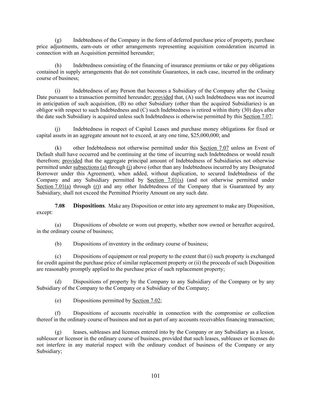 101 (g) Indebtedness of the Company in the form of deferred purchase price of property, purchase price adjustments, earn-outs or other arrangements representing acquisition consideration incurred in connection with an Acquisition permitted hereunder; (h) Indebtedness consisting of the financing of insurance premiums or take or pay obligations contained in supply arrangements that do not constitute Guarantees, in each case, incurred in the ordinary course of business; (i) Indebtedness of any Person that becomes a Subsidiary of the Company after the Closing Date pursuant to a transaction permitted hereunder; provided that, (A) such Indebtedness was not incurred in anticipation of such acquisition, (B) no other Subsidiary (other than the acquired Subsidiaries) is an obligor with respect to such Indebtedness and (C) such Indebtedness is retired within thirty (30) days after the date such Subsidiary is acquired unless such Indebtedness is otherwise permitted by this Section 7.07; (j) Indebtedness in respect of Capital Leases and purchase money obligations for fixed or capital assets in an aggregate amount not to exceed, at any one time, $25,000,000; and (k) other Indebtedness not otherwise permitted under this Section 7.07 unless an Event of Default shall have occurred and be continuing at the time of incurring such Indebtedness or would result therefrom; provided that the aggregate principal amount of Indebtedness of Subsidiaries not otherwise permitted under subsections (a) through (j) above (other than any Indebtedness incurred by any Designated Borrower under this Agreement), when added, without duplication, to secured Indebtedness of the Company and any Subsidiary permitted by Section 7.01(s) (and not otherwise permitted under Section 7.01(a) through (r)) and any other Indebtedness of the Company that is Guaranteed by any Subsidiary, shall not exceed the Permitted Priority Amount on any such date. 7.08 Dispositions. Make any Disposition or enter into any agreement to make any Disposition, except: (a) Dispositions of obsolete or worn out property, whether now owned or hereafter acquired, in the ordinary course of business; (b) Dispositions of inventory in the ordinary course of business; (c) Dispositions of equipment or real property to the extent that (i) such property is exchanged for credit against the purchase price of similar replacement property or (ii) the proceeds of such Disposition are reasonably promptly applied to the purchase price of such replacement property; (d) Dispositions of property by the Company to any Subsidiary of the Company or by any Subsidiary of the Company to the Company or a Subsidiary of the Company; (e) Dispositions permitted by Section 7.02; (f) Dispositions of accounts receivable in connection with the compromise or collection thereof in the ordinary course of business and not as part of any accounts receivables financing transaction; (g) leases, subleases and licenses entered into by the Company or any Subsidiary as a lessor, sublessor or licensor in the ordinary course of business, provided that such leases, subleases or licenses do not interfere in any material respect with the ordinary conduct of business of the Company or any Subsidiary;