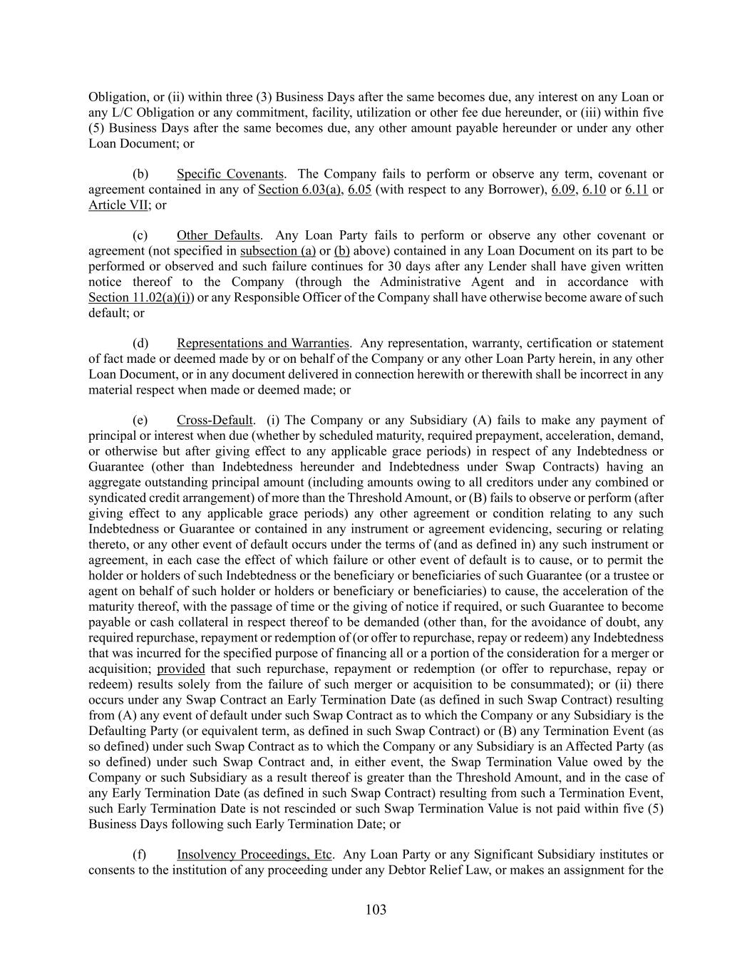 103 Obligation, or (ii) within three (3) Business Days after the same becomes due, any interest on any Loan or any L/C Obligation or any commitment, facility, utilization or other fee due hereunder, or (iii) within five (5) Business Days after the same becomes due, any other amount payable hereunder or under any other Loan Document; or (b) Specific Covenants. The Company fails to perform or observe any term, covenant or agreement contained in any of Section 6.03(a), 6.05 (with respect to any Borrower), 6.09, 6.10 or 6.11 or Article VII; or (c) Other Defaults. Any Loan Party fails to perform or observe any other covenant or agreement (not specified in subsection (a) or (b) above) contained in any Loan Document on its part to be performed or observed and such failure continues for 30 days after any Lender shall have given written notice thereof to the Company (through the Administrative Agent and in accordance with Section 11.02(a)(i)) or any Responsible Officer of the Company shall have otherwise become aware of such default; or (d) Representations and Warranties. Any representation, warranty, certification or statement of fact made or deemed made by or on behalf of the Company or any other Loan Party herein, in any other Loan Document, or in any document delivered in connection herewith or therewith shall be incorrect in any material respect when made or deemed made; or (e) Cross-Default. (i) The Company or any Subsidiary (A) fails to make any payment of principal or interest when due (whether by scheduled maturity, required prepayment, acceleration, demand, or otherwise but after giving effect to any applicable grace periods) in respect of any Indebtedness or Guarantee (other than Indebtedness hereunder and Indebtedness under Swap Contracts) having an aggregate outstanding principal amount (including amounts owing to all creditors under any combined or syndicated credit arrangement) of more than the Threshold Amount, or (B) fails to observe or perform (after giving effect to any applicable grace periods) any other agreement or condition relating to any such Indebtedness or Guarantee or contained in any instrument or agreement evidencing, securing or relating thereto, or any other event of default occurs under the terms of (and as defined in) any such instrument or agreement, in each case the effect of which failure or other event of default is to cause, or to permit the holder or holders of such Indebtedness or the beneficiary or beneficiaries of such Guarantee (or a trustee or agent on behalf of such holder or holders or beneficiary or beneficiaries) to cause, the acceleration of the maturity thereof, with the passage of time or the giving of notice if required, or such Guarantee to become payable or cash collateral in respect thereof to be demanded (other than, for the avoidance of doubt, any required repurchase, repayment or redemption of (or offer to repurchase, repay or redeem) any Indebtedness that was incurred for the specified purpose of financing all or a portion of the consideration for a merger or acquisition; provided that such repurchase, repayment or redemption (or offer to repurchase, repay or redeem) results solely from the failure of such merger or acquisition to be consummated); or (ii) there occurs under any Swap Contract an Early Termination Date (as defined in such Swap Contract) resulting from (A) any event of default under such Swap Contract as to which the Company or any Subsidiary is the Defaulting Party (or equivalent term, as defined in such Swap Contract) or (B) any Termination Event (as so defined) under such Swap Contract as to which the Company or any Subsidiary is an Affected Party (as so defined) under such Swap Contract and, in either event, the Swap Termination Value owed by the Company or such Subsidiary as a result thereof is greater than the Threshold Amount, and in the case of any Early Termination Date (as defined in such Swap Contract) resulting from such a Termination Event, such Early Termination Date is not rescinded or such Swap Termination Value is not paid within five (5) Business Days following such Early Termination Date; or (f) Insolvency Proceedings, Etc. Any Loan Party or any Significant Subsidiary institutes or consents to the institution of any proceeding under any Debtor Relief Law, or makes an assignment for the