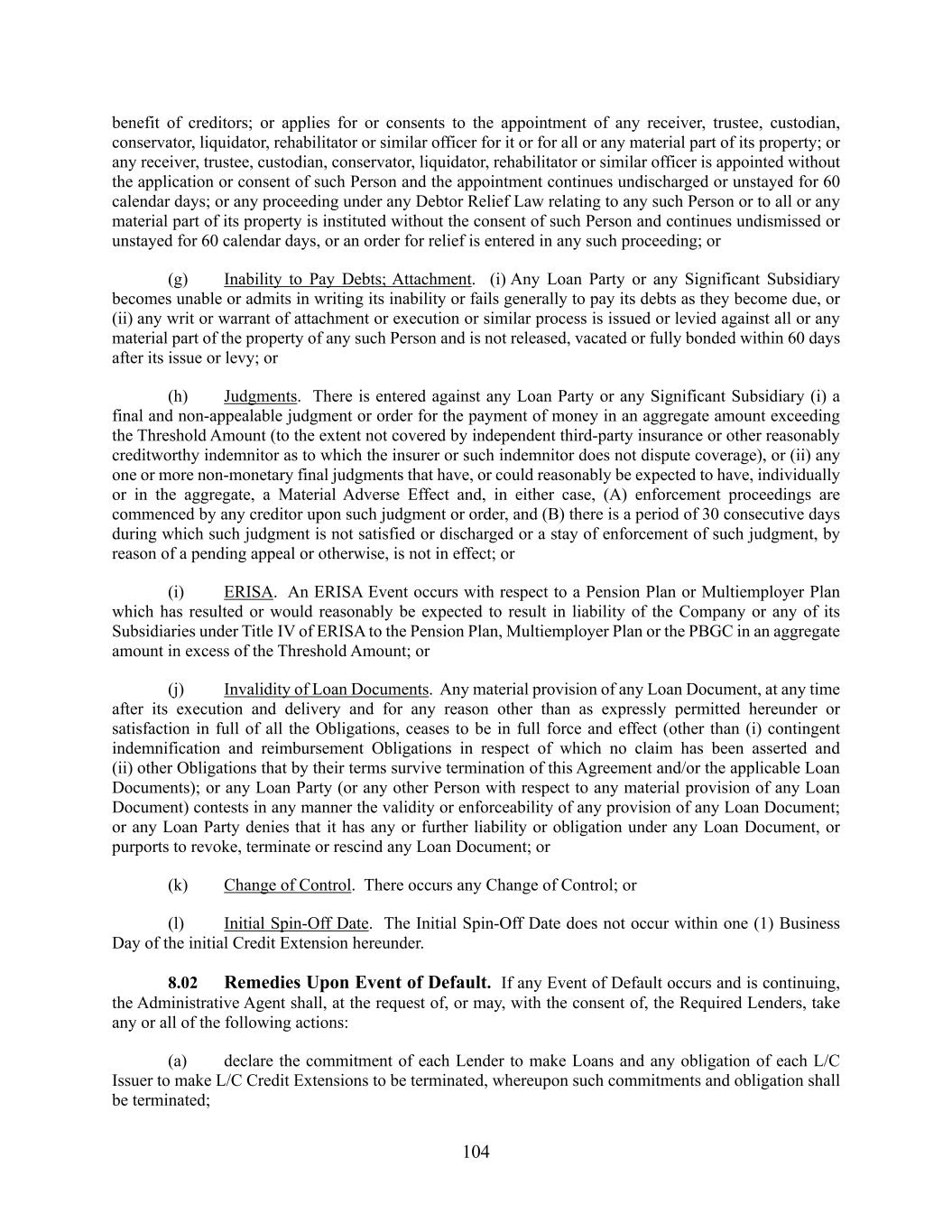 104 benefit of creditors; or applies for or consents to the appointment of any receiver, trustee, custodian, conservator, liquidator, rehabilitator or similar officer for it or for all or any material part of its property; or any receiver, trustee, custodian, conservator, liquidator, rehabilitator or similar officer is appointed without the application or consent of such Person and the appointment continues undischarged or unstayed for 60 calendar days; or any proceeding under any Debtor Relief Law relating to any such Person or to all or any material part of its property is instituted without the consent of such Person and continues undismissed or unstayed for 60 calendar days, or an order for relief is entered in any such proceeding; or (g) Inability to Pay Debts; Attachment. (i) Any Loan Party or any Significant Subsidiary becomes unable or admits in writing its inability or fails generally to pay its debts as they become due, or (ii) any writ or warrant of attachment or execution or similar process is issued or levied against all or any material part of the property of any such Person and is not released, vacated or fully bonded within 60 days after its issue or levy; or (h) Judgments. There is entered against any Loan Party or any Significant Subsidiary (i) a final and non-appealable judgment or order for the payment of money in an aggregate amount exceeding the Threshold Amount (to the extent not covered by independent third-party insurance or other reasonably creditworthy indemnitor as to which the insurer or such indemnitor does not dispute coverage), or (ii) any one or more non-monetary final judgments that have, or could reasonably be expected to have, individually or in the aggregate, a Material Adverse Effect and, in either case, (A) enforcement proceedings are commenced by any creditor upon such judgment or order, and (B) there is a period of 30 consecutive days during which such judgment is not satisfied or discharged or a stay of enforcement of such judgment, by reason of a pending appeal or otherwise, is not in effect; or (i) ERISA. An ERISA Event occurs with respect to a Pension Plan or Multiemployer Plan which has resulted or would reasonably be expected to result in liability of the Company or any of its Subsidiaries under Title IV of ERISA to the Pension Plan, Multiemployer Plan or the PBGC in an aggregate amount in excess of the Threshold Amount; or (j) Invalidity of Loan Documents. Any material provision of any Loan Document, at any time after its execution and delivery and for any reason other than as expressly permitted hereunder or satisfaction in full of all the Obligations, ceases to be in full force and effect (other than (i) contingent indemnification and reimbursement Obligations in respect of which no claim has been asserted and (ii) other Obligations that by their terms survive termination of this Agreement and/or the applicable Loan Documents); or any Loan Party (or any other Person with respect to any material provision of any Loan Document) contests in any manner the validity or enforceability of any provision of any Loan Document; or any Loan Party denies that it has any or further liability or obligation under any Loan Document, or purports to revoke, terminate or rescind any Loan Document; or (k) Change of Control. There occurs any Change of Control; or (l) Initial Spin-Off Date. The Initial Spin-Off Date does not occur within one (1) Business Day of the initial Credit Extension hereunder. 8.02 Remedies Upon Event of Default. If any Event of Default occurs and is continuing, the Administrative Agent shall, at the request of, or may, with the consent of, the Required Lenders, take any or all of the following actions: (a) declare the commitment of each Lender to make Loans and any obligation of each L/C Issuer to make L/C Credit Extensions to be terminated, whereupon such commitments and obligation shall be terminated;