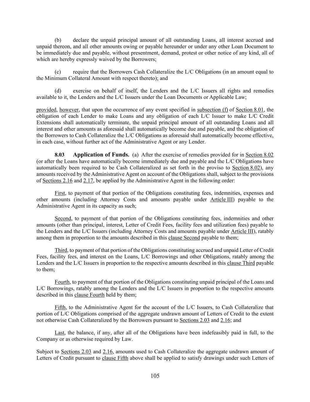 105 (b) declare the unpaid principal amount of all outstanding Loans, all interest accrued and unpaid thereon, and all other amounts owing or payable hereunder or under any other Loan Document to be immediately due and payable, without presentment, demand, protest or other notice of any kind, all of which are hereby expressly waived by the Borrowers; (c) require that the Borrowers Cash Collateralize the L/C Obligations (in an amount equal to the Minimum Collateral Amount with respect thereto); and (d) exercise on behalf of itself, the Lenders and the L/C Issuers all rights and remedies available to it, the Lenders and the L/C Issuers under the Loan Documents or Applicable Law; provided, however, that upon the occurrence of any event specified in subsection (f) of Section 8.01, the obligation of each Lender to make Loans and any obligation of each L/C Issuer to make L/C Credit Extensions shall automatically terminate, the unpaid principal amount of all outstanding Loans and all interest and other amounts as aforesaid shall automatically become due and payable, and the obligation of the Borrowers to Cash Collateralize the L/C Obligations as aforesaid shall automatically become effective, in each case, without further act of the Administrative Agent or any Lender. 8.03 Application of Funds. (a) After the exercise of remedies provided for in Section 8.02 (or after the Loans have automatically become immediately due and payable and the L/C Obligations have automatically been required to be Cash Collateralized as set forth in the proviso to Section 8.02), any amounts received by the Administrative Agent on account of the Obligations shall, subject to the provisions of Sections 2.16 and 2.17, be applied by the Administrative Agent in the following order: First, to payment of that portion of the Obligations constituting fees, indemnities, expenses and other amounts (including Attorney Costs and amounts payable under Article III) payable to the Administrative Agent in its capacity as such; Second, to payment of that portion of the Obligations constituting fees, indemnities and other amounts (other than principal, interest, Letter of Credit Fees, facility fees and utilization fees) payable to the Lenders and the L/C Issuers (including Attorney Costs and amounts payable under Article III), ratably among them in proportion to the amounts described in this clause Second payable to them; Third, to payment of that portion of the Obligations constituting accrued and unpaid Letter of Credit Fees, facility fees, and interest on the Loans, L/C Borrowings and other Obligations, ratably among the Lenders and the L/C Issuers in proportion to the respective amounts described in this clause Third payable to them; Fourth, to payment of that portion of the Obligations constituting unpaid principal of the Loans and L/C Borrowings, ratably among the Lenders and the L/C Issuers in proportion to the respective amounts described in this clause Fourth held by them; Fifth, to the Administrative Agent for the account of the L/C Issuers, to Cash Collateralize that portion of L/C Obligations comprised of the aggregate undrawn amount of Letters of Credit to the extent not otherwise Cash Collateralized by the Borrowers pursuant to Sections 2.03 and 2.16; and Last, the balance, if any, after all of the Obligations have been indefeasibly paid in full, to the Company or as otherwise required by Law. Subject to Sections 2.03 and 2.16, amounts used to Cash Collateralize the aggregate undrawn amount of Letters of Credit pursuant to clause Fifth above shall be applied to satisfy drawings under such Letters of
