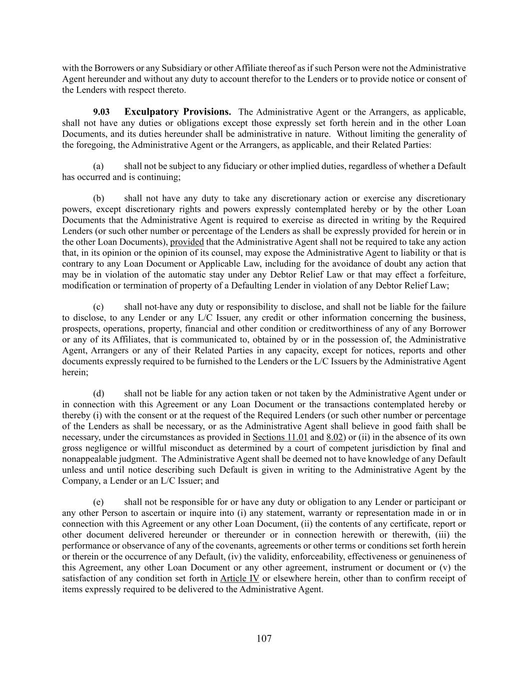 107 with the Borrowers or any Subsidiary or other Affiliate thereof as if such Person were not the Administrative Agent hereunder and without any duty to account therefor to the Lenders or to provide notice or consent of the Lenders with respect thereto. 9.03 Exculpatory Provisions. The Administrative Agent or the Arrangers, as applicable, shall not have any duties or obligations except those expressly set forth herein and in the other Loan Documents, and its duties hereunder shall be administrative in nature. Without limiting the generality of the foregoing, the Administrative Agent or the Arrangers, as applicable, and their Related Parties: (a) shall not be subject to any fiduciary or other implied duties, regardless of whether a Default has occurred and is continuing; (b) shall not have any duty to take any discretionary action or exercise any discretionary powers, except discretionary rights and powers expressly contemplated hereby or by the other Loan Documents that the Administrative Agent is required to exercise as directed in writing by the Required Lenders (or such other number or percentage of the Lenders as shall be expressly provided for herein or in the other Loan Documents), provided that the Administrative Agent shall not be required to take any action that, in its opinion or the opinion of its counsel, may expose the Administrative Agent to liability or that is contrary to any Loan Document or Applicable Law, including for the avoidance of doubt any action that may be in violation of the automatic stay under any Debtor Relief Law or that may effect a forfeiture, modification or termination of property of a Defaulting Lender in violation of any Debtor Relief Law; (c) shall not have any duty or responsibility to disclose, and shall not be liable for the failure to disclose, to any Lender or any L/C Issuer, any credit or other information concerning the business, prospects, operations, property, financial and other condition or creditworthiness of any of any Borrower or any of its Affiliates, that is communicated to, obtained by or in the possession of, the Administrative Agent, Arrangers or any of their Related Parties in any capacity, except for notices, reports and other documents expressly required to be furnished to the Lenders or the L/C Issuers by the Administrative Agent herein; (d) shall not be liable for any action taken or not taken by the Administrative Agent under or in connection with this Agreement or any Loan Document or the transactions contemplated hereby or thereby (i) with the consent or at the request of the Required Lenders (or such other number or percentage of the Lenders as shall be necessary, or as the Administrative Agent shall believe in good faith shall be necessary, under the circumstances as provided in Sections 11.01 and 8.02) or (ii) in the absence of its own gross negligence or willful misconduct as determined by a court of competent jurisdiction by final and nonappealable judgment. The Administrative Agent shall be deemed not to have knowledge of any Default unless and until notice describing such Default is given in writing to the Administrative Agent by the Company, a Lender or an L/C Issuer; and (e) shall not be responsible for or have any duty or obligation to any Lender or participant or any other Person to ascertain or inquire into (i) any statement, warranty or representation made in or in connection with this Agreement or any other Loan Document, (ii) the contents of any certificate, report or other document delivered hereunder or thereunder or in connection herewith or therewith, (iii) the performance or observance of any of the covenants, agreements or other terms or conditions set forth herein or therein or the occurrence of any Default, (iv) the validity, enforceability, effectiveness or genuineness of this Agreement, any other Loan Document or any other agreement, instrument or document or (v) the satisfaction of any condition set forth in Article IV or elsewhere herein, other than to confirm receipt of items expressly required to be delivered to the Administrative Agent.