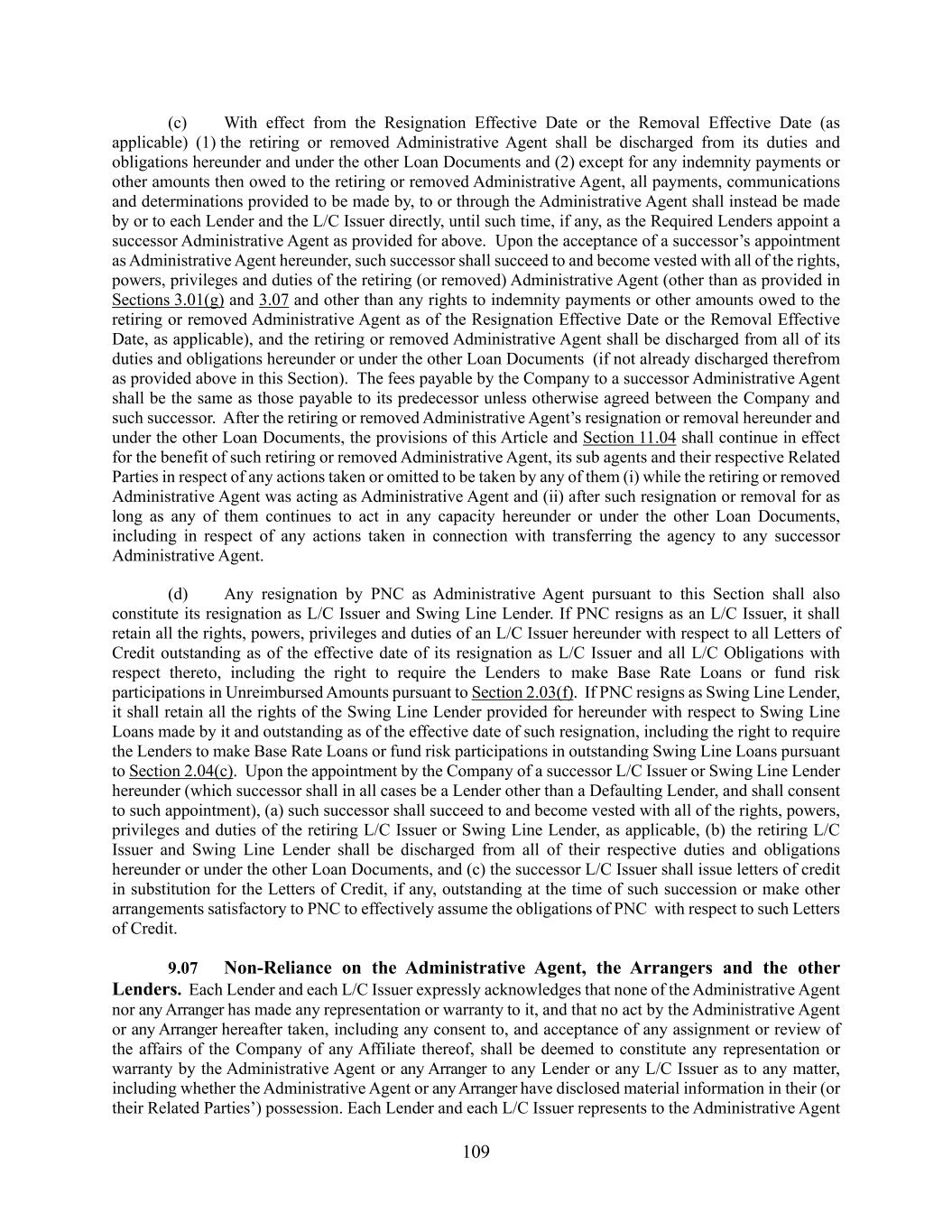 109 (c) With effect from the Resignation Effective Date or the Removal Effective Date (as applicable) (1) the retiring or removed Administrative Agent shall be discharged from its duties and obligations hereunder and under the other Loan Documents and (2) except for any indemnity payments or other amounts then owed to the retiring or removed Administrative Agent, all payments, communications and determinations provided to be made by, to or through the Administrative Agent shall instead be made by or to each Lender and the L/C Issuer directly, until such time, if any, as the Required Lenders appoint a successor Administrative Agent as provided for above. Upon the acceptance of a successor’s appointment as Administrative Agent hereunder, such successor shall succeed to and become vested with all of the rights, powers, privileges and duties of the retiring (or removed) Administrative Agent (other than as provided in Sections 3.01(g) and 3.07 and other than any rights to indemnity payments or other amounts owed to the retiring or removed Administrative Agent as of the Resignation Effective Date or the Removal Effective Date, as applicable), and the retiring or removed Administrative Agent shall be discharged from all of its duties and obligations hereunder or under the other Loan Documents (if not already discharged therefrom as provided above in this Section). The fees payable by the Company to a successor Administrative Agent shall be the same as those payable to its predecessor unless otherwise agreed between the Company and such successor. After the retiring or removed Administrative Agent’s resignation or removal hereunder and under the other Loan Documents, the provisions of this Article and Section 11.04 shall continue in effect for the benefit of such retiring or removed Administrative Agent, its sub agents and their respective Related Parties in respect of any actions taken or omitted to be taken by any of them (i) while the retiring or removed Administrative Agent was acting as Administrative Agent and (ii) after such resignation or removal for as long as any of them continues to act in any capacity hereunder or under the other Loan Documents, including in respect of any actions taken in connection with transferring the agency to any successor Administrative Agent. (d) Any resignation by PNC as Administrative Agent pursuant to this Section shall also constitute its resignation as L/C Issuer and Swing Line Lender. If PNC resigns as an L/C Issuer, it shall retain all the rights, powers, privileges and duties of an L/C Issuer hereunder with respect to all Letters of Credit outstanding as of the effective date of its resignation as L/C Issuer and all L/C Obligations with respect thereto, including the right to require the Lenders to make Base Rate Loans or fund risk participations in Unreimbursed Amounts pursuant to Section 2.03(f). If PNC resigns as Swing Line Lender, it shall retain all the rights of the Swing Line Lender provided for hereunder with respect to Swing Line Loans made by it and outstanding as of the effective date of such resignation, including the right to require the Lenders to make Base Rate Loans or fund risk participations in outstanding Swing Line Loans pursuant to Section 2.04(c). Upon the appointment by the Company of a successor L/C Issuer or Swing Line Lender hereunder (which successor shall in all cases be a Lender other than a Defaulting Lender, and shall consent to such appointment), (a) such successor shall succeed to and become vested with all of the rights, powers, privileges and duties of the retiring L/C Issuer or Swing Line Lender, as applicable, (b) the retiring L/C Issuer and Swing Line Lender shall be discharged from all of their respective duties and obligations hereunder or under the other Loan Documents, and (c) the successor L/C Issuer shall issue letters of credit in substitution for the Letters of Credit, if any, outstanding at the time of such succession or make other arrangements satisfactory to PNC to effectively assume the obligations of PNC with respect to such Letters of Credit. 9.07 Non-Reliance on the Administrative Agent, the Arrangers and the other Lenders. Each Lender and each L/C Issuer expressly acknowledges that none of the Administrative Agent nor any Arranger has made any representation or warranty to it, and that no act by the Administrative Agent or any Arranger hereafter taken, including any consent to, and acceptance of any assignment or review of the affairs of the Company of any Affiliate thereof, shall be deemed to constitute any representation or warranty by the Administrative Agent or any Arranger to any Lender or any L/C Issuer as to any matter, including whether the Administrative Agent or any Arranger have disclosed material information in their (or their Related Parties’) possession. Each Lender and each L/C Issuer represents to the Administrative Agent