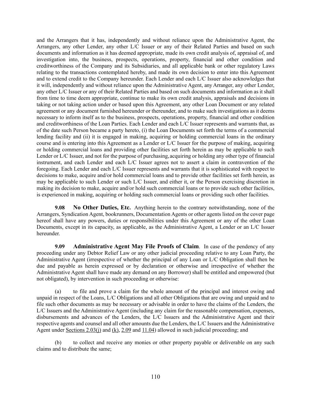 110 and the Arrangers that it has, independently and without reliance upon the Administrative Agent, the Arrangers, any other Lender, any other L/C Issuer or any of their Related Parties and based on such documents and information as it has deemed appropriate, made its own credit analysis of, appraisal of, and investigation into, the business, prospects, operations, property, financial and other condition and creditworthiness of the Company and its Subsidiaries, and all applicable bank or other regulatory Laws relating to the transactions contemplated hereby, and made its own decision to enter into this Agreement and to extend credit to the Company hereunder. Each Lender and each L/C Issuer also acknowledges that it will, independently and without reliance upon the Administrative Agent, any Arranger, any other Lender, any other L/C Issuer or any of their Related Parties and based on such documents and information as it shall from time to time deem appropriate, continue to make its own credit analysis, appraisals and decisions in taking or not taking action under or based upon this Agreement, any other Loan Document or any related agreement or any document furnished hereunder or thereunder, and to make such investigations as it deems necessary to inform itself as to the business, prospects, operations, property, financial and other condition and creditworthiness of the Loan Parties. Each Lender and each L/C Issuer represents and warrants that, as of the date such Person became a party hereto, (i) the Loan Documents set forth the terms of a commercial lending facility and (ii) it is engaged in making, acquiring or holding commercial loans in the ordinary course and is entering into this Agreement as a Lender or L/C Issuer for the purpose of making, acquiring or holding commercial loans and providing other facilities set forth herein as may be applicable to such Lender or L/C Issuer, and not for the purpose of purchasing, acquiring or holding any other type of financial instrument, and each Lender and each L/C Issuer agrees not to assert a claim in contravention of the foregoing. Each Lender and each L/C Issuer represents and warrants that it is sophisticated with respect to decisions to make, acquire and/or hold commercial loans and to provide other facilities set forth herein, as may be applicable to such Lender or such L/C Issuer, and either it, or the Person exercising discretion in making its decision to make, acquire and/or hold such commercial loans or to provide such other facilities, is experienced in making, acquiring or holding such commercial loans or providing such other facilities. 9.08 No Other Duties, Etc. Anything herein to the contrary notwithstanding, none of the Arrangers, Syndication Agent, bookrunners, Documentation Agents or other agents listed on the cover page hereof shall have any powers, duties or responsibilities under this Agreement or any of the other Loan Documents, except in its capacity, as applicable, as the Administrative Agent, a Lender or an L/C Issuer hereunder. 9.09 Administrative Agent May File Proofs of Claim. In case of the pendency of any proceeding under any Debtor Relief Law or any other judicial proceeding relative to any Loan Party, the Administrative Agent (irrespective of whether the principal of any Loan or L/C Obligation shall then be due and payable as herein expressed or by declaration or otherwise and irrespective of whether the Administrative Agent shall have made any demand on any Borrower) shall be entitled and empowered (but not obligated), by intervention in such proceeding or otherwise: (a) to file and prove a claim for the whole amount of the principal and interest owing and unpaid in respect of the Loans, L/C Obligations and all other Obligations that are owing and unpaid and to file such other documents as may be necessary or advisable in order to have the claims of the Lenders, the L/C Issuers and the Administrative Agent (including any claim for the reasonable compensation, expenses, disbursements and advances of the Lenders, the L/C Issuers and the Administrative Agent and their respective agents and counsel and all other amounts due the Lenders, the L/C Issuers and the Administrative Agent under Sections 2.03(j) and (k), 2.09 and 11.04) allowed in such judicial proceeding; and (b) to collect and receive any monies or other property payable or deliverable on any such claims and to distribute the same;