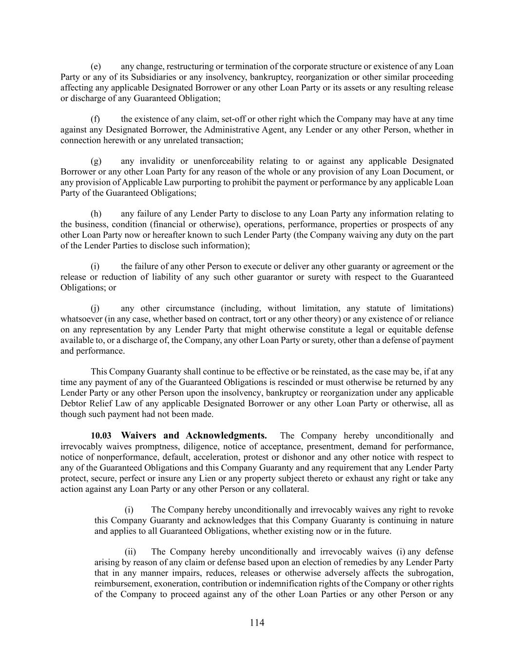 114 (e) any change, restructuring or termination of the corporate structure or existence of any Loan Party or any of its Subsidiaries or any insolvency, bankruptcy, reorganization or other similar proceeding affecting any applicable Designated Borrower or any other Loan Party or its assets or any resulting release or discharge of any Guaranteed Obligation; (f) the existence of any claim, set-off or other right which the Company may have at any time against any Designated Borrower, the Administrative Agent, any Lender or any other Person, whether in connection herewith or any unrelated transaction; (g) any invalidity or unenforceability relating to or against any applicable Designated Borrower or any other Loan Party for any reason of the whole or any provision of any Loan Document, or any provision of Applicable Law purporting to prohibit the payment or performance by any applicable Loan Party of the Guaranteed Obligations; (h) any failure of any Lender Party to disclose to any Loan Party any information relating to the business, condition (financial or otherwise), operations, performance, properties or prospects of any other Loan Party now or hereafter known to such Lender Party (the Company waiving any duty on the part of the Lender Parties to disclose such information); (i) the failure of any other Person to execute or deliver any other guaranty or agreement or the release or reduction of liability of any such other guarantor or surety with respect to the Guaranteed Obligations; or (j) any other circumstance (including, without limitation, any statute of limitations) whatsoever (in any case, whether based on contract, tort or any other theory) or any existence of or reliance on any representation by any Lender Party that might otherwise constitute a legal or equitable defense available to, or a discharge of, the Company, any other Loan Party or surety, other than a defense of payment and performance. This Company Guaranty shall continue to be effective or be reinstated, as the case may be, if at any time any payment of any of the Guaranteed Obligations is rescinded or must otherwise be returned by any Lender Party or any other Person upon the insolvency, bankruptcy or reorganization under any applicable Debtor Relief Law of any applicable Designated Borrower or any other Loan Party or otherwise, all as though such payment had not been made. 10.03 Waivers and Acknowledgments. The Company hereby unconditionally and irrevocably waives promptness, diligence, notice of acceptance, presentment, demand for performance, notice of nonperformance, default, acceleration, protest or dishonor and any other notice with respect to any of the Guaranteed Obligations and this Company Guaranty and any requirement that any Lender Party protect, secure, perfect or insure any Lien or any property subject thereto or exhaust any right or take any action against any Loan Party or any other Person or any collateral. (i) The Company hereby unconditionally and irrevocably waives any right to revoke this Company Guaranty and acknowledges that this Company Guaranty is continuing in nature and applies to all Guaranteed Obligations, whether existing now or in the future. (ii) The Company hereby unconditionally and irrevocably waives (i) any defense arising by reason of any claim or defense based upon an election of remedies by any Lender Party that in any manner impairs, reduces, releases or otherwise adversely affects the subrogation, reimbursement, exoneration, contribution or indemnification rights of the Company or other rights of the Company to proceed against any of the other Loan Parties or any other Person or any