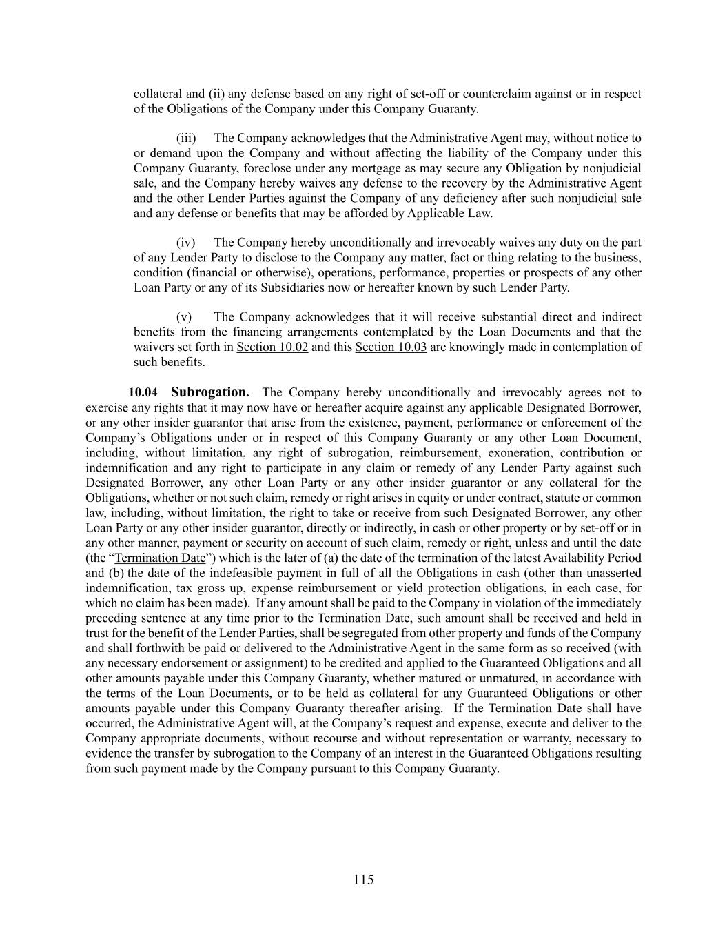 115 collateral and (ii) any defense based on any right of set-off or counterclaim against or in respect of the Obligations of the Company under this Company Guaranty. (iii) The Company acknowledges that the Administrative Agent may, without notice to or demand upon the Company and without affecting the liability of the Company under this Company Guaranty, foreclose under any mortgage as may secure any Obligation by nonjudicial sale, and the Company hereby waives any defense to the recovery by the Administrative Agent and the other Lender Parties against the Company of any deficiency after such nonjudicial sale and any defense or benefits that may be afforded by Applicable Law. (iv) The Company hereby unconditionally and irrevocably waives any duty on the part of any Lender Party to disclose to the Company any matter, fact or thing relating to the business, condition (financial or otherwise), operations, performance, properties or prospects of any other Loan Party or any of its Subsidiaries now or hereafter known by such Lender Party. (v) The Company acknowledges that it will receive substantial direct and indirect benefits from the financing arrangements contemplated by the Loan Documents and that the waivers set forth in Section 10.02 and this Section 10.03 are knowingly made in contemplation of such benefits. 10.04 Subrogation. The Company hereby unconditionally and irrevocably agrees not to exercise any rights that it may now have or hereafter acquire against any applicable Designated Borrower, or any other insider guarantor that arise from the existence, payment, performance or enforcement of the Company’s Obligations under or in respect of this Company Guaranty or any other Loan Document, including, without limitation, any right of subrogation, reimbursement, exoneration, contribution or indemnification and any right to participate in any claim or remedy of any Lender Party against such Designated Borrower, any other Loan Party or any other insider guarantor or any collateral for the Obligations, whether or not such claim, remedy or right arises in equity or under contract, statute or common law, including, without limitation, the right to take or receive from such Designated Borrower, any other Loan Party or any other insider guarantor, directly or indirectly, in cash or other property or by set-off or in any other manner, payment or security on account of such claim, remedy or right, unless and until the date (the “Termination Date”) which is the later of (a) the date of the termination of the latest Availability Period and (b) the date of the indefeasible payment in full of all the Obligations in cash (other than unasserted indemnification, tax gross up, expense reimbursement or yield protection obligations, in each case, for which no claim has been made). If any amount shall be paid to the Company in violation of the immediately preceding sentence at any time prior to the Termination Date, such amount shall be received and held in trust for the benefit of the Lender Parties, shall be segregated from other property and funds of the Company and shall forthwith be paid or delivered to the Administrative Agent in the same form as so received (with any necessary endorsement or assignment) to be credited and applied to the Guaranteed Obligations and all other amounts payable under this Company Guaranty, whether matured or unmatured, in accordance with the terms of the Loan Documents, or to be held as collateral for any Guaranteed Obligations or other amounts payable under this Company Guaranty thereafter arising. If the Termination Date shall have occurred, the Administrative Agent will, at the Company’s request and expense, execute and deliver to the Company appropriate documents, without recourse and without representation or warranty, necessary to evidence the transfer by subrogation to the Company of an interest in the Guaranteed Obligations resulting from such payment made by the Company pursuant to this Company Guaranty.