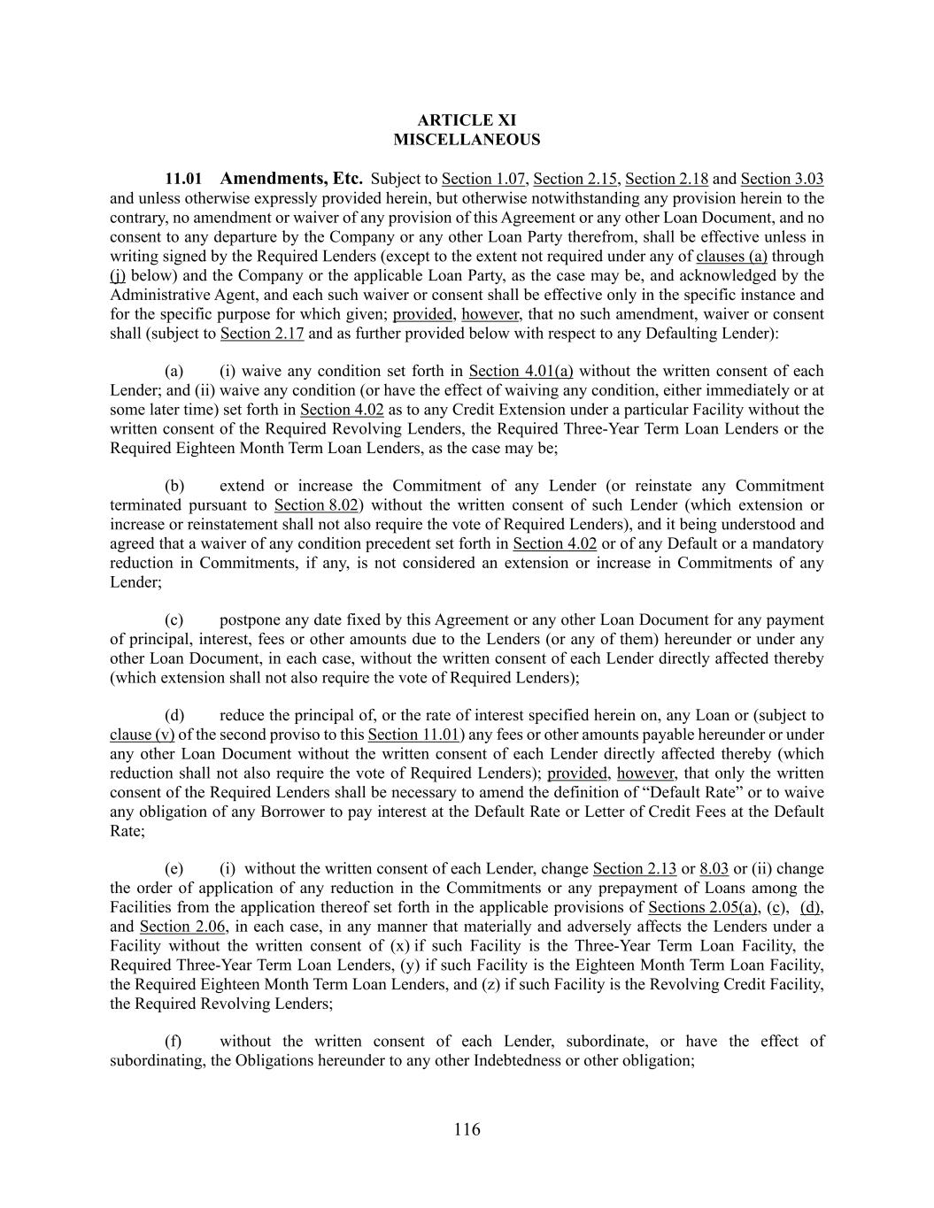 116 ARTICLE XI MISCELLANEOUS 11.01 Amendments, Etc. Subject to Section 1.07, Section 2.15, Section 2.18 and Section 3.03 and unless otherwise expressly provided herein, but otherwise notwithstanding any provision herein to the contrary, no amendment or waiver of any provision of this Agreement or any other Loan Document, and no consent to any departure by the Company or any other Loan Party therefrom, shall be effective unless in writing signed by the Required Lenders (except to the extent not required under any of clauses (a) through (j) below) and the Company or the applicable Loan Party, as the case may be, and acknowledged by the Administrative Agent, and each such waiver or consent shall be effective only in the specific instance and for the specific purpose for which given; provided, however, that no such amendment, waiver or consent shall (subject to Section 2.17 and as further provided below with respect to any Defaulting Lender): (a) (i) waive any condition set forth in Section 4.01(a) without the written consent of each Lender; and (ii) waive any condition (or have the effect of waiving any condition, either immediately or at some later time) set forth in Section 4.02 as to any Credit Extension under a particular Facility without the written consent of the Required Revolving Lenders, the Required Three-Year Term Loan Lenders or the Required Eighteen Month Term Loan Lenders, as the case may be; (b) extend or increase the Commitment of any Lender (or reinstate any Commitment terminated pursuant to Section 8.02) without the written consent of such Lender (which extension or increase or reinstatement shall not also require the vote of Required Lenders), and it being understood and agreed that a waiver of any condition precedent set forth in Section 4.02 or of any Default or a mandatory reduction in Commitments, if any, is not considered an extension or increase in Commitments of any Lender; (c) postpone any date fixed by this Agreement or any other Loan Document for any payment of principal, interest, fees or other amounts due to the Lenders (or any of them) hereunder or under any other Loan Document, in each case, without the written consent of each Lender directly affected thereby (which extension shall not also require the vote of Required Lenders); (d) reduce the principal of, or the rate of interest specified herein on, any Loan or (subject to clause (v) of the second proviso to this Section 11.01) any fees or other amounts payable hereunder or under any other Loan Document without the written consent of each Lender directly affected thereby (which reduction shall not also require the vote of Required Lenders); provided, however, that only the written consent of the Required Lenders shall be necessary to amend the definition of “Default Rate” or to waive any obligation of any Borrower to pay interest at the Default Rate or Letter of Credit Fees at the Default Rate; (e) (i) without the written consent of each Lender, change Section 2.13 or 8.03 or (ii) change the order of application of any reduction in the Commitments or any prepayment of Loans among the Facilities from the application thereof set forth in the applicable provisions of Sections 2.05(a), (c), (d), and Section 2.06, in each case, in any manner that materially and adversely affects the Lenders under a Facility without the written consent of (x) if such Facility is the Three-Year Term Loan Facility, the Required Three-Year Term Loan Lenders, (y) if such Facility is the Eighteen Month Term Loan Facility, the Required Eighteen Month Term Loan Lenders, and (z) if such Facility is the Revolving Credit Facility, the Required Revolving Lenders; (f) without the written consent of each Lender, subordinate, or have the effect of subordinating, the Obligations hereunder to any other Indebtedness or other obligation;