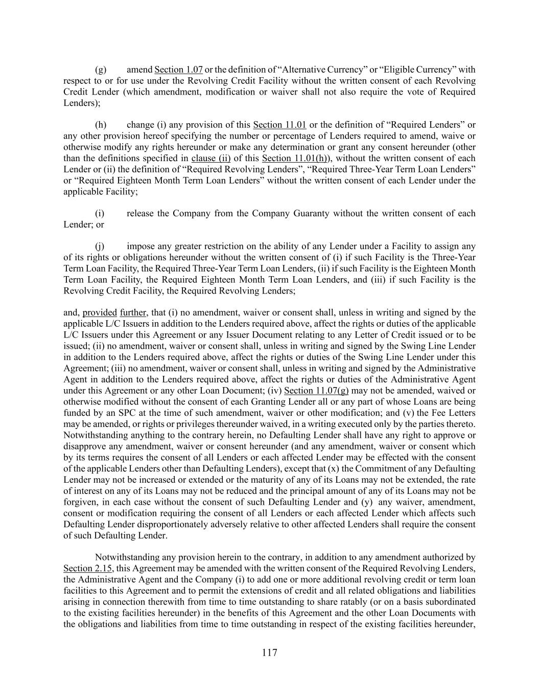 117 (g) amend Section 1.07 or the definition of “Alternative Currency” or “Eligible Currency” with respect to or for use under the Revolving Credit Facility without the written consent of each Revolving Credit Lender (which amendment, modification or waiver shall not also require the vote of Required Lenders); (h) change (i) any provision of this Section 11.01 or the definition of “Required Lenders” or any other provision hereof specifying the number or percentage of Lenders required to amend, waive or otherwise modify any rights hereunder or make any determination or grant any consent hereunder (other than the definitions specified in clause (ii) of this Section 11.01(h)), without the written consent of each Lender or (ii) the definition of “Required Revolving Lenders”, “Required Three-Year Term Loan Lenders” or “Required Eighteen Month Term Loan Lenders” without the written consent of each Lender under the applicable Facility; (i) release the Company from the Company Guaranty without the written consent of each Lender; or (j) impose any greater restriction on the ability of any Lender under a Facility to assign any of its rights or obligations hereunder without the written consent of (i) if such Facility is the Three-Year Term Loan Facility, the Required Three-Year Term Loan Lenders, (ii) if such Facility is the Eighteen Month Term Loan Facility, the Required Eighteen Month Term Loan Lenders, and (iii) if such Facility is the Revolving Credit Facility, the Required Revolving Lenders; and, provided further, that (i) no amendment, waiver or consent shall, unless in writing and signed by the applicable L/C Issuers in addition to the Lenders required above, affect the rights or duties of the applicable L/C Issuers under this Agreement or any Issuer Document relating to any Letter of Credit issued or to be issued; (ii) no amendment, waiver or consent shall, unless in writing and signed by the Swing Line Lender in addition to the Lenders required above, affect the rights or duties of the Swing Line Lender under this Agreement; (iii) no amendment, waiver or consent shall, unless in writing and signed by the Administrative Agent in addition to the Lenders required above, affect the rights or duties of the Administrative Agent under this Agreement or any other Loan Document; (iv) Section 11.07(g) may not be amended, waived or otherwise modified without the consent of each Granting Lender all or any part of whose Loans are being funded by an SPC at the time of such amendment, waiver or other modification; and (v) the Fee Letters may be amended, or rights or privileges thereunder waived, in a writing executed only by the parties thereto. Notwithstanding anything to the contrary herein, no Defaulting Lender shall have any right to approve or disapprove any amendment, waiver or consent hereunder (and any amendment, waiver or consent which by its terms requires the consent of all Lenders or each affected Lender may be effected with the consent of the applicable Lenders other than Defaulting Lenders), except that (x) the Commitment of any Defaulting Lender may not be increased or extended or the maturity of any of its Loans may not be extended, the rate of interest on any of its Loans may not be reduced and the principal amount of any of its Loans may not be forgiven, in each case without the consent of such Defaulting Lender and (y) any waiver, amendment, consent or modification requiring the consent of all Lenders or each affected Lender which affects such Defaulting Lender disproportionately adversely relative to other affected Lenders shall require the consent of such Defaulting Lender. Notwithstanding any provision herein to the contrary, in addition to any amendment authorized by Section 2.15, this Agreement may be amended with the written consent of the Required Revolving Lenders, the Administrative Agent and the Company (i) to add one or more additional revolving credit or term loan facilities to this Agreement and to permit the extensions of credit and all related obligations and liabilities arising in connection therewith from time to time outstanding to share ratably (or on a basis subordinated to the existing facilities hereunder) in the benefits of this Agreement and the other Loan Documents with the obligations and liabilities from time to time outstanding in respect of the existing facilities hereunder,
