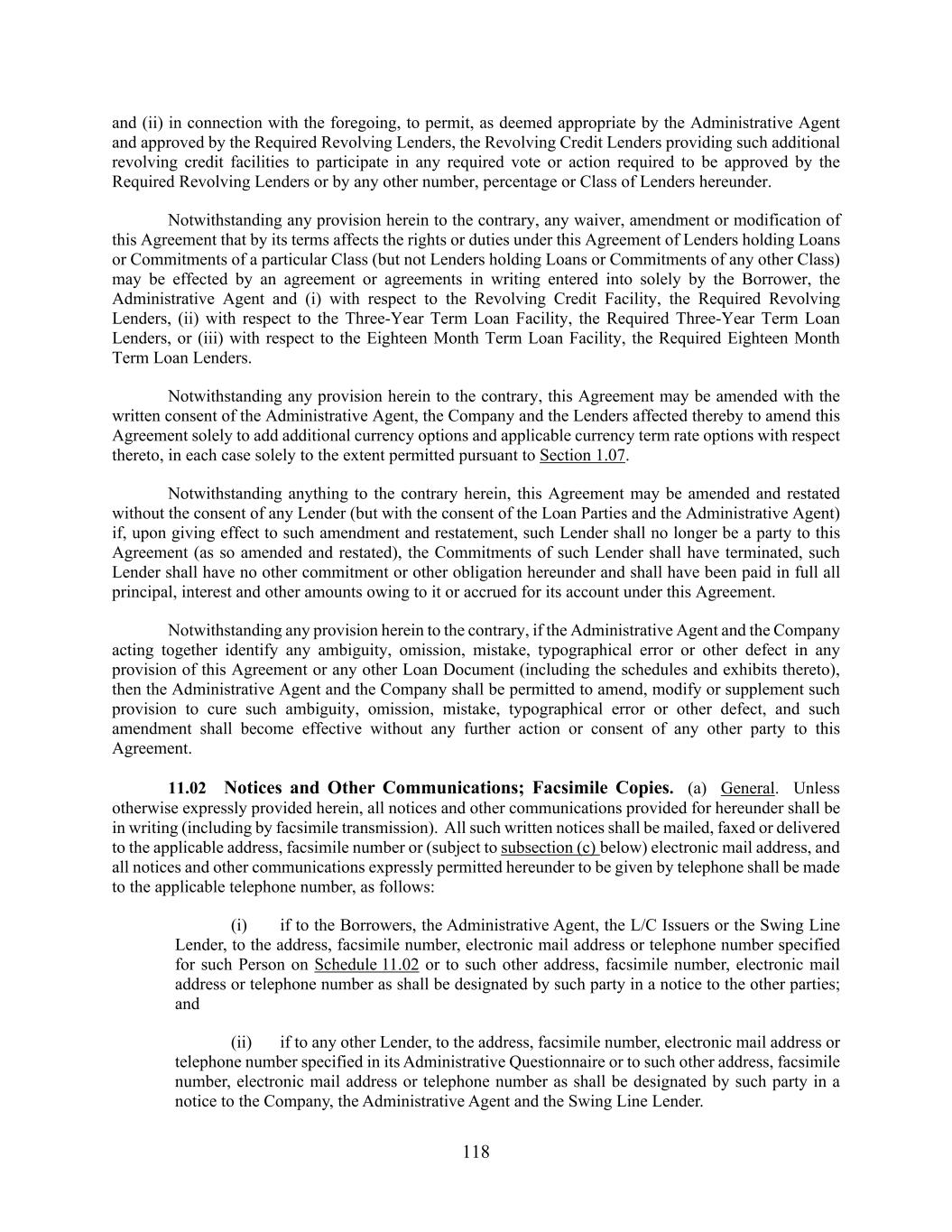 118 and (ii) in connection with the foregoing, to permit, as deemed appropriate by the Administrative Agent and approved by the Required Revolving Lenders, the Revolving Credit Lenders providing such additional revolving credit facilities to participate in any required vote or action required to be approved by the Required Revolving Lenders or by any other number, percentage or Class of Lenders hereunder. Notwithstanding any provision herein to the contrary, any waiver, amendment or modification of this Agreement that by its terms affects the rights or duties under this Agreement of Lenders holding Loans or Commitments of a particular Class (but not Lenders holding Loans or Commitments of any other Class) may be effected by an agreement or agreements in writing entered into solely by the Borrower, the Administrative Agent and (i) with respect to the Revolving Credit Facility, the Required Revolving Lenders, (ii) with respect to the Three-Year Term Loan Facility, the Required Three-Year Term Loan Lenders, or (iii) with respect to the Eighteen Month Term Loan Facility, the Required Eighteen Month Term Loan Lenders. Notwithstanding any provision herein to the contrary, this Agreement may be amended with the written consent of the Administrative Agent, the Company and the Lenders affected thereby to amend this Agreement solely to add additional currency options and applicable currency term rate options with respect thereto, in each case solely to the extent permitted pursuant to Section 1.07. Notwithstanding anything to the contrary herein, this Agreement may be amended and restated without the consent of any Lender (but with the consent of the Loan Parties and the Administrative Agent) if, upon giving effect to such amendment and restatement, such Lender shall no longer be a party to this Agreement (as so amended and restated), the Commitments of such Lender shall have terminated, such Lender shall have no other commitment or other obligation hereunder and shall have been paid in full all principal, interest and other amounts owing to it or accrued for its account under this Agreement. Notwithstanding any provision herein to the contrary, if the Administrative Agent and the Company acting together identify any ambiguity, omission, mistake, typographical error or other defect in any provision of this Agreement or any other Loan Document (including the schedules and exhibits thereto), then the Administrative Agent and the Company shall be permitted to amend, modify or supplement such provision to cure such ambiguity, omission, mistake, typographical error or other defect, and such amendment shall become effective without any further action or consent of any other party to this Agreement. 11.02 Notices and Other Communications; Facsimile Copies. (a) General. Unless otherwise expressly provided herein, all notices and other communications provided for hereunder shall be in writing (including by facsimile transmission). All such written notices shall be mailed, faxed or delivered to the applicable address, facsimile number or (subject to subsection (c) below) electronic mail address, and all notices and other communications expressly permitted hereunder to be given by telephone shall be made to the applicable telephone number, as follows: (i) if to the Borrowers, the Administrative Agent, the L/C Issuers or the Swing Line Lender, to the address, facsimile number, electronic mail address or telephone number specified for such Person on Schedule 11.02 or to such other address, facsimile number, electronic mail address or telephone number as shall be designated by such party in a notice to the other parties; and (ii) if to any other Lender, to the address, facsimile number, electronic mail address or telephone number specified in its Administrative Questionnaire or to such other address, facsimile number, electronic mail address or telephone number as shall be designated by such party in a notice to the Company, the Administrative Agent and the Swing Line Lender.