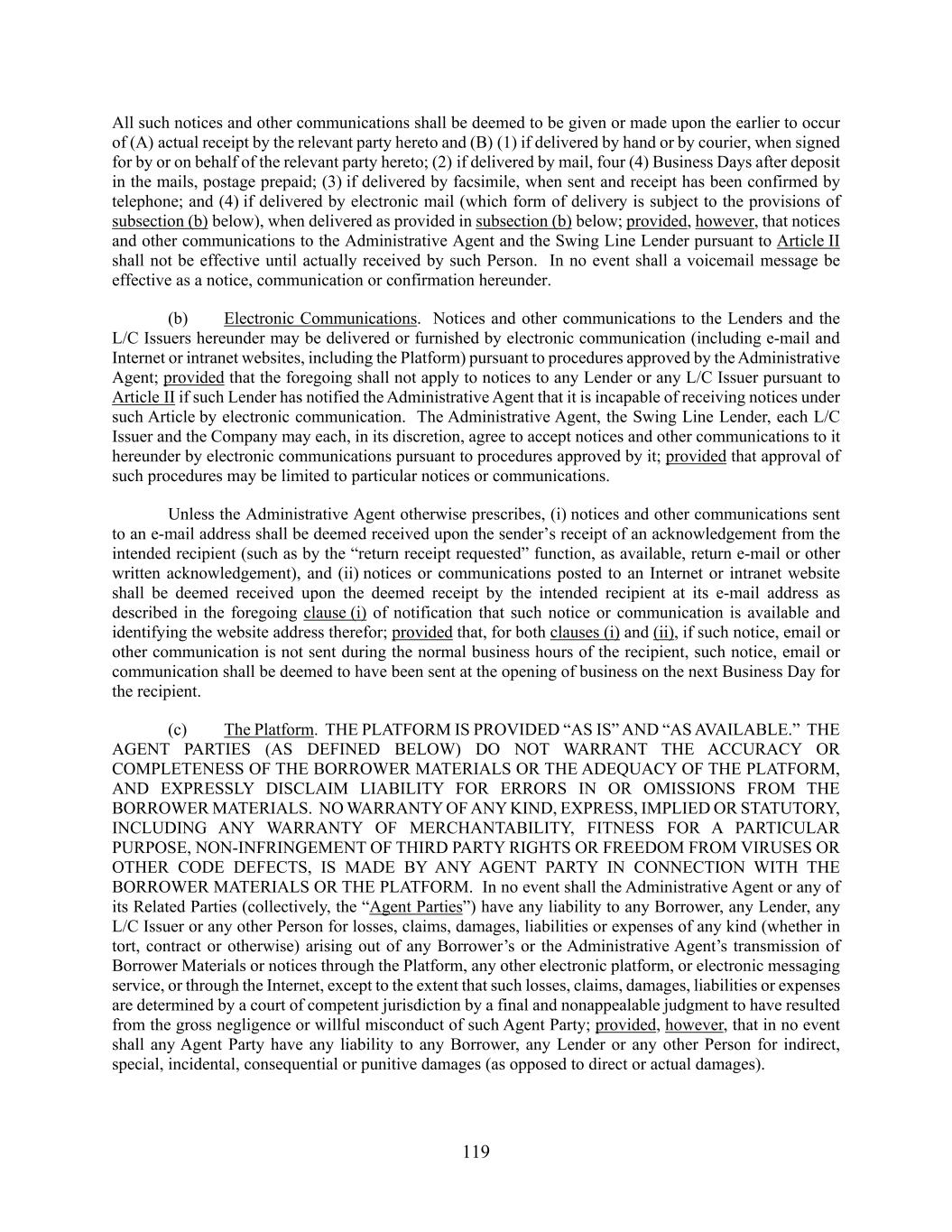 119 All such notices and other communications shall be deemed to be given or made upon the earlier to occur of (A) actual receipt by the relevant party hereto and (B) (1) if delivered by hand or by courier, when signed for by or on behalf of the relevant party hereto; (2) if delivered by mail, four (4) Business Days after deposit in the mails, postage prepaid; (3) if delivered by facsimile, when sent and receipt has been confirmed by telephone; and (4) if delivered by electronic mail (which form of delivery is subject to the provisions of subsection (b) below), when delivered as provided in subsection (b) below; provided, however, that notices and other communications to the Administrative Agent and the Swing Line Lender pursuant to Article II shall not be effective until actually received by such Person. In no event shall a voicemail message be effective as a notice, communication or confirmation hereunder. (b) Electronic Communications. Notices and other communications to the Lenders and the L/C Issuers hereunder may be delivered or furnished by electronic communication (including e-mail and Internet or intranet websites, including the Platform) pursuant to procedures approved by the Administrative Agent; provided that the foregoing shall not apply to notices to any Lender or any L/C Issuer pursuant to Article II if such Lender has notified the Administrative Agent that it is incapable of receiving notices under such Article by electronic communication. The Administrative Agent, the Swing Line Lender, each L/C Issuer and the Company may each, in its discretion, agree to accept notices and other communications to it hereunder by electronic communications pursuant to procedures approved by it; provided that approval of such procedures may be limited to particular notices or communications. Unless the Administrative Agent otherwise prescribes, (i) notices and other communications sent to an e-mail address shall be deemed received upon the sender’s receipt of an acknowledgement from the intended recipient (such as by the “return receipt requested” function, as available, return e-mail or other written acknowledgement), and (ii) notices or communications posted to an Internet or intranet website shall be deemed received upon the deemed receipt by the intended recipient at its e-mail address as described in the foregoing clause (i) of notification that such notice or communication is available and identifying the website address therefor; provided that, for both clauses (i) and (ii), if such notice, email or other communication is not sent during the normal business hours of the recipient, such notice, email or communication shall be deemed to have been sent at the opening of business on the next Business Day for the recipient. (c) The Platform. THE PLATFORM IS PROVIDED “AS IS” AND “AS AVAILABLE.” THE AGENT PARTIES (AS DEFINED BELOW) DO NOT WARRANT THE ACCURACY OR COMPLETENESS OF THE BORROWER MATERIALS OR THE ADEQUACY OF THE PLATFORM, AND EXPRESSLY DISCLAIM LIABILITY FOR ERRORS IN OR OMISSIONS FROM THE BORROWER MATERIALS. NO WARRANTY OF ANY KIND, EXPRESS, IMPLIED OR STATUTORY, INCLUDING ANY WARRANTY OF MERCHANTABILITY, FITNESS FOR A PARTICULAR PURPOSE, NON-INFRINGEMENT OF THIRD PARTY RIGHTS OR FREEDOM FROM VIRUSES OR OTHER CODE DEFECTS, IS MADE BY ANY AGENT PARTY IN CONNECTION WITH THE BORROWER MATERIALS OR THE PLATFORM. In no event shall the Administrative Agent or any of its Related Parties (collectively, the “Agent Parties”) have any liability to any Borrower, any Lender, any L/C Issuer or any other Person for losses, claims, damages, liabilities or expenses of any kind (whether in tort, contract or otherwise) arising out of any Borrower’s or the Administrative Agent’s transmission of Borrower Materials or notices through the Platform, any other electronic platform, or electronic messaging service, or through the Internet, except to the extent that such losses, claims, damages, liabilities or expenses are determined by a court of competent jurisdiction by a final and nonappealable judgment to have resulted from the gross negligence or willful misconduct of such Agent Party; provided, however, that in no event shall any Agent Party have any liability to any Borrower, any Lender or any other Person for indirect, special, incidental, consequential or punitive damages (as opposed to direct or actual damages).