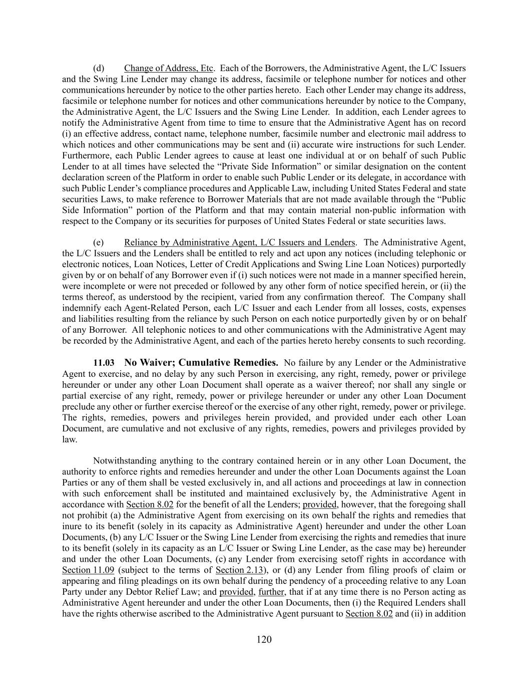 120 (d) Change of Address, Etc. Each of the Borrowers, the Administrative Agent, the L/C Issuers and the Swing Line Lender may change its address, facsimile or telephone number for notices and other communications hereunder by notice to the other parties hereto. Each other Lender may change its address, facsimile or telephone number for notices and other communications hereunder by notice to the Company, the Administrative Agent, the L/C Issuers and the Swing Line Lender. In addition, each Lender agrees to notify the Administrative Agent from time to time to ensure that the Administrative Agent has on record (i) an effective address, contact name, telephone number, facsimile number and electronic mail address to which notices and other communications may be sent and (ii) accurate wire instructions for such Lender. Furthermore, each Public Lender agrees to cause at least one individual at or on behalf of such Public Lender to at all times have selected the “Private Side Information” or similar designation on the content declaration screen of the Platform in order to enable such Public Lender or its delegate, in accordance with such Public Lender’s compliance procedures and Applicable Law, including United States Federal and state securities Laws, to make reference to Borrower Materials that are not made available through the “Public Side Information” portion of the Platform and that may contain material non-public information with respect to the Company or its securities for purposes of United States Federal or state securities laws. (e) Reliance by Administrative Agent, L/C Issuers and Lenders. The Administrative Agent, the L/C Issuers and the Lenders shall be entitled to rely and act upon any notices (including telephonic or electronic notices, Loan Notices, Letter of Credit Applications and Swing Line Loan Notices) purportedly given by or on behalf of any Borrower even if (i) such notices were not made in a manner specified herein, were incomplete or were not preceded or followed by any other form of notice specified herein, or (ii) the terms thereof, as understood by the recipient, varied from any confirmation thereof. The Company shall indemnify each Agent-Related Person, each L/C Issuer and each Lender from all losses, costs, expenses and liabilities resulting from the reliance by such Person on each notice purportedly given by or on behalf of any Borrower. All telephonic notices to and other communications with the Administrative Agent may be recorded by the Administrative Agent, and each of the parties hereto hereby consents to such recording. 11.03 No Waiver; Cumulative Remedies. No failure by any Lender or the Administrative Agent to exercise, and no delay by any such Person in exercising, any right, remedy, power or privilege hereunder or under any other Loan Document shall operate as a waiver thereof; nor shall any single or partial exercise of any right, remedy, power or privilege hereunder or under any other Loan Document preclude any other or further exercise thereof or the exercise of any other right, remedy, power or privilege. The rights, remedies, powers and privileges herein provided, and provided under each other Loan Document, are cumulative and not exclusive of any rights, remedies, powers and privileges provided by law. Notwithstanding anything to the contrary contained herein or in any other Loan Document, the authority to enforce rights and remedies hereunder and under the other Loan Documents against the Loan Parties or any of them shall be vested exclusively in, and all actions and proceedings at law in connection with such enforcement shall be instituted and maintained exclusively by, the Administrative Agent in accordance with Section 8.02 for the benefit of all the Lenders; provided, however, that the foregoing shall not prohibit (a) the Administrative Agent from exercising on its own behalf the rights and remedies that inure to its benefit (solely in its capacity as Administrative Agent) hereunder and under the other Loan Documents, (b) any L/C Issuer or the Swing Line Lender from exercising the rights and remedies that inure to its benefit (solely in its capacity as an L/C Issuer or Swing Line Lender, as the case may be) hereunder and under the other Loan Documents, (c) any Lender from exercising setoff rights in accordance with Section 11.09 (subject to the terms of Section 2.13), or (d) any Lender from filing proofs of claim or appearing and filing pleadings on its own behalf during the pendency of a proceeding relative to any Loan Party under any Debtor Relief Law; and provided, further, that if at any time there is no Person acting as Administrative Agent hereunder and under the other Loan Documents, then (i) the Required Lenders shall have the rights otherwise ascribed to the Administrative Agent pursuant to Section 8.02 and (ii) in addition