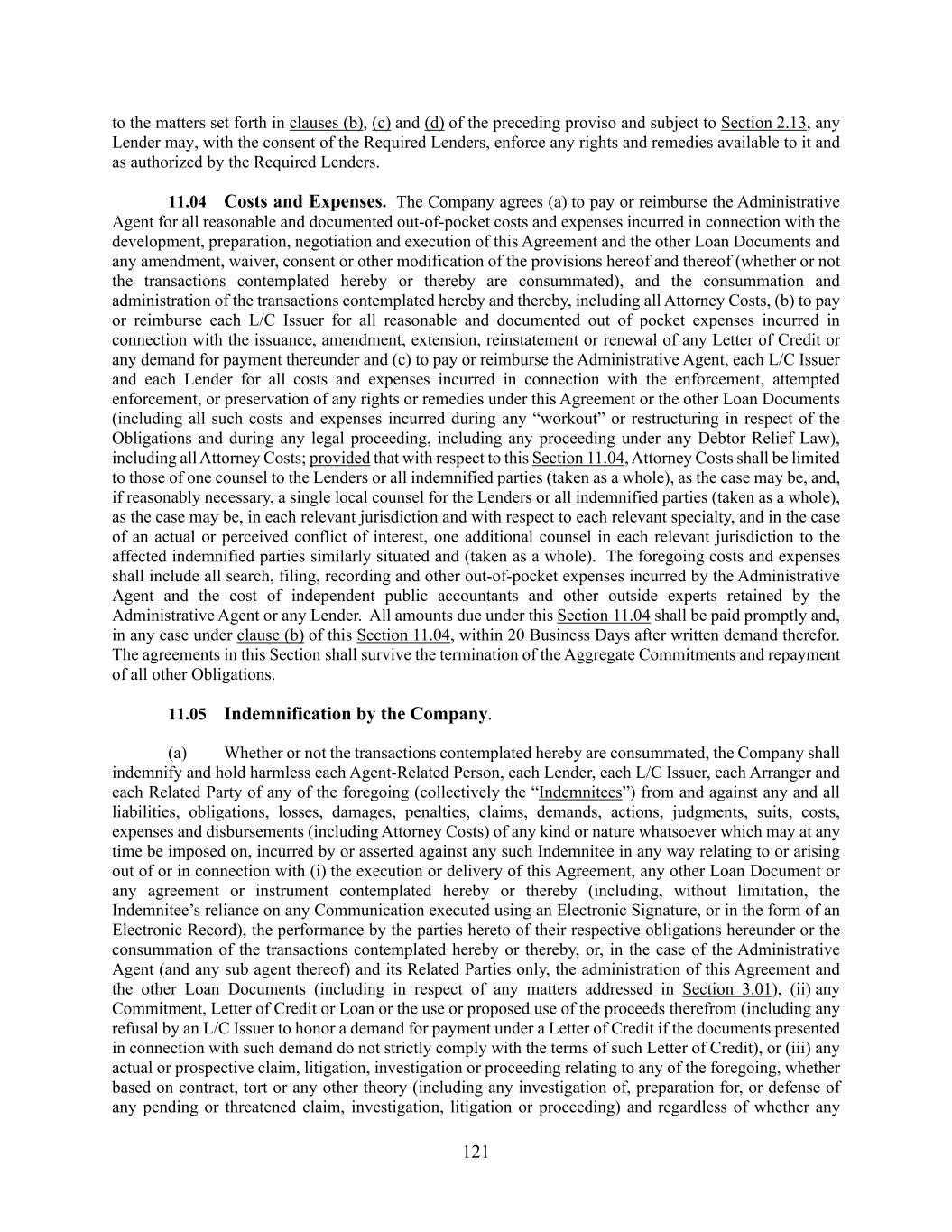 121 to the matters set forth in clauses (b), (c) and (d) of the preceding proviso and subject to Section 2.13, any Lender may, with the consent of the Required Lenders, enforce any rights and remedies available to it and as authorized by the Required Lenders. 11.04 Costs and Expenses. The Company agrees (a) to pay or reimburse the Administrative Agent for all reasonable and documented out-of-pocket costs and expenses incurred in connection with the development, preparation, negotiation and execution of this Agreement and the other Loan Documents and any amendment, waiver, consent or other modification of the provisions hereof and thereof (whether or not the transactions contemplated hereby or thereby are consummated), and the consummation and administration of the transactions contemplated hereby and thereby, including all Attorney Costs, (b) to pay or reimburse each L/C Issuer for all reasonable and documented out of pocket expenses incurred in connection with the issuance, amendment, extension, reinstatement or renewal of any Letter of Credit or any demand for payment thereunder and (c) to pay or reimburse the Administrative Agent, each L/C Issuer and each Lender for all costs and expenses incurred in connection with the enforcement, attempted enforcement, or preservation of any rights or remedies under this Agreement or the other Loan Documents (including all such costs and expenses incurred during any “workout” or restructuring in respect of the Obligations and during any legal proceeding, including any proceeding under any Debtor Relief Law), including all Attorney Costs; provided that with respect to this Section 11.04, Attorney Costs shall be limited to those of one counsel to the Lenders or all indemnified parties (taken as a whole), as the case may be, and, if reasonably necessary, a single local counsel for the Lenders or all indemnified parties (taken as a whole), as the case may be, in each relevant jurisdiction and with respect to each relevant specialty, and in the case of an actual or perceived conflict of interest, one additional counsel in each relevant jurisdiction to the affected indemnified parties similarly situated and (taken as a whole). The foregoing costs and expenses shall include all search, filing, recording and other out-of-pocket expenses incurred by the Administrative Agent and the cost of independent public accountants and other outside experts retained by the Administrative Agent or any Lender. All amounts due under this Section 11.04 shall be paid promptly and, in any case under clause (b) of this Section 11.04, within 20 Business Days after written demand therefor. The agreements in this Section shall survive the termination of the Aggregate Commitments and repayment of all other Obligations. 11.05 Indemnification by the Company. (a) Whether or not the transactions contemplated hereby are consummated, the Company shall indemnify and hold harmless each Agent-Related Person, each Lender, each L/C Issuer, each Arranger and each Related Party of any of the foregoing (collectively the “Indemnitees”) from and against any and all liabilities, obligations, losses, damages, penalties, claims, demands, actions, judgments, suits, costs, expenses and disbursements (including Attorney Costs) of any kind or nature whatsoever which may at any time be imposed on, incurred by or asserted against any such Indemnitee in any way relating to or arising out of or in connection with (i) the execution or delivery of this Agreement, any other Loan Document or any agreement or instrument contemplated hereby or thereby (including, without limitation, the Indemnitee’s reliance on any Communication executed using an Electronic Signature, or in the form of an Electronic Record), the performance by the parties hereto of their respective obligations hereunder or the consummation of the transactions contemplated hereby or thereby, or, in the case of the Administrative Agent (and any sub agent thereof) and its Related Parties only, the administration of this Agreement and the other Loan Documents (including in respect of any matters addressed in Section 3.01), (ii) any Commitment, Letter of Credit or Loan or the use or proposed use of the proceeds therefrom (including any refusal by an L/C Issuer to honor a demand for payment under a Letter of Credit if the documents presented in connection with such demand do not strictly comply with the terms of such Letter of Credit), or (iii) any actual or prospective claim, litigation, investigation or proceeding relating to any of the foregoing, whether based on contract, tort or any other theory (including any investigation of, preparation for, or defense of any pending or threatened claim, investigation, litigation or proceeding) and regardless of whether any