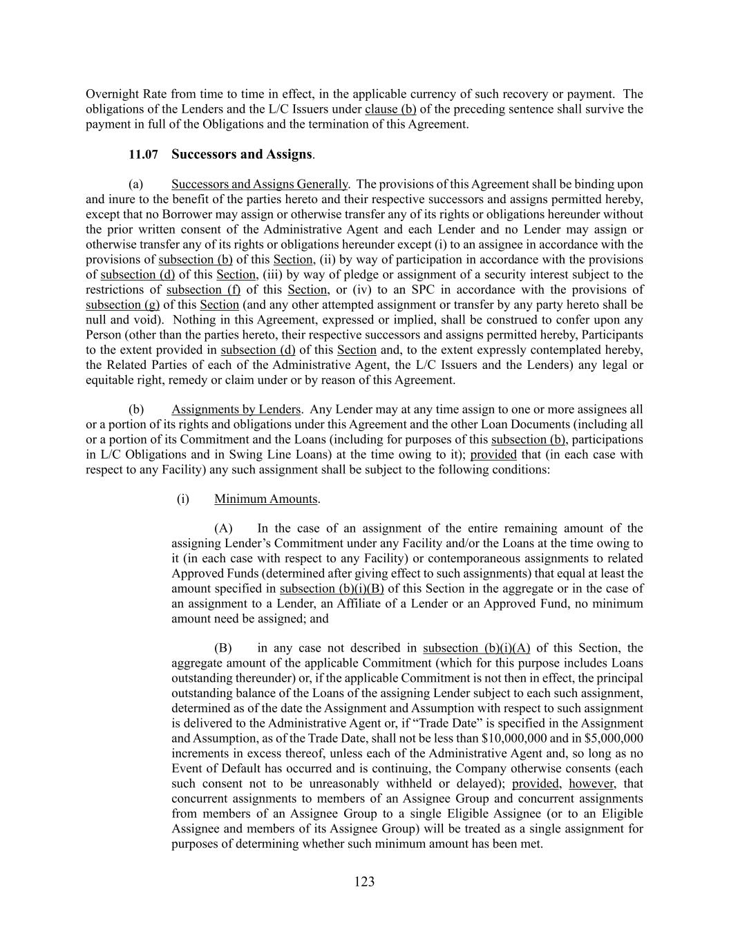 123 Overnight Rate from time to time in effect, in the applicable currency of such recovery or payment. The obligations of the Lenders and the L/C Issuers under clause (b) of the preceding sentence shall survive the payment in full of the Obligations and the termination of this Agreement. 11.07 Successors and Assigns. (a) Successors and Assigns Generally. The provisions of this Agreement shall be binding upon and inure to the benefit of the parties hereto and their respective successors and assigns permitted hereby, except that no Borrower may assign or otherwise transfer any of its rights or obligations hereunder without the prior written consent of the Administrative Agent and each Lender and no Lender may assign or otherwise transfer any of its rights or obligations hereunder except (i) to an assignee in accordance with the provisions of subsection (b) of this Section, (ii) by way of participation in accordance with the provisions of subsection (d) of this Section, (iii) by way of pledge or assignment of a security interest subject to the restrictions of subsection (f) of this Section, or (iv) to an SPC in accordance with the provisions of subsection (g) of this Section (and any other attempted assignment or transfer by any party hereto shall be null and void). Nothing in this Agreement, expressed or implied, shall be construed to confer upon any Person (other than the parties hereto, their respective successors and assigns permitted hereby, Participants to the extent provided in subsection (d) of this Section and, to the extent expressly contemplated hereby, the Related Parties of each of the Administrative Agent, the L/C Issuers and the Lenders) any legal or equitable right, remedy or claim under or by reason of this Agreement. (b) Assignments by Lenders. Any Lender may at any time assign to one or more assignees all or a portion of its rights and obligations under this Agreement and the other Loan Documents (including all or a portion of its Commitment and the Loans (including for purposes of this subsection (b), participations in L/C Obligations and in Swing Line Loans) at the time owing to it); provided that (in each case with respect to any Facility) any such assignment shall be subject to the following conditions: (i) Minimum Amounts. (A) In the case of an assignment of the entire remaining amount of the assigning Lender’s Commitment under any Facility and/or the Loans at the time owing to it (in each case with respect to any Facility) or contemporaneous assignments to related Approved Funds (determined after giving effect to such assignments) that equal at least the amount specified in subsection (b)(i)(B) of this Section in the aggregate or in the case of an assignment to a Lender, an Affiliate of a Lender or an Approved Fund, no minimum amount need be assigned; and (B) in any case not described in subsection (b)(i)(A) of this Section, the aggregate amount of the applicable Commitment (which for this purpose includes Loans outstanding thereunder) or, if the applicable Commitment is not then in effect, the principal outstanding balance of the Loans of the assigning Lender subject to each such assignment, determined as of the date the Assignment and Assumption with respect to such assignment is delivered to the Administrative Agent or, if “Trade Date” is specified in the Assignment and Assumption, as of the Trade Date, shall not be less than $10,000,000 and in $5,000,000 increments in excess thereof, unless each of the Administrative Agent and, so long as no Event of Default has occurred and is continuing, the Company otherwise consents (each such consent not to be unreasonably withheld or delayed); provided, however, that concurrent assignments to members of an Assignee Group and concurrent assignments from members of an Assignee Group to a single Eligible Assignee (or to an Eligible Assignee and members of its Assignee Group) will be treated as a single assignment for purposes of determining whether such minimum amount has been met.